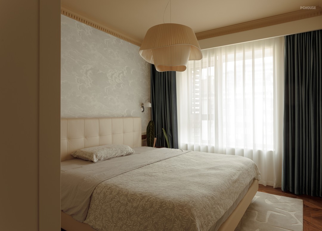 靠近客厅的多功能房中,我们采用折叠门进行空间隔断,可开可合的弹性设置将更多的自然光线引入客厅,延伸空间的尺度,柔化了空间边界感。这里既是屋主的书房,同时也设置了墨菲床,在偶有来客留宿可以转换为卧室模式。