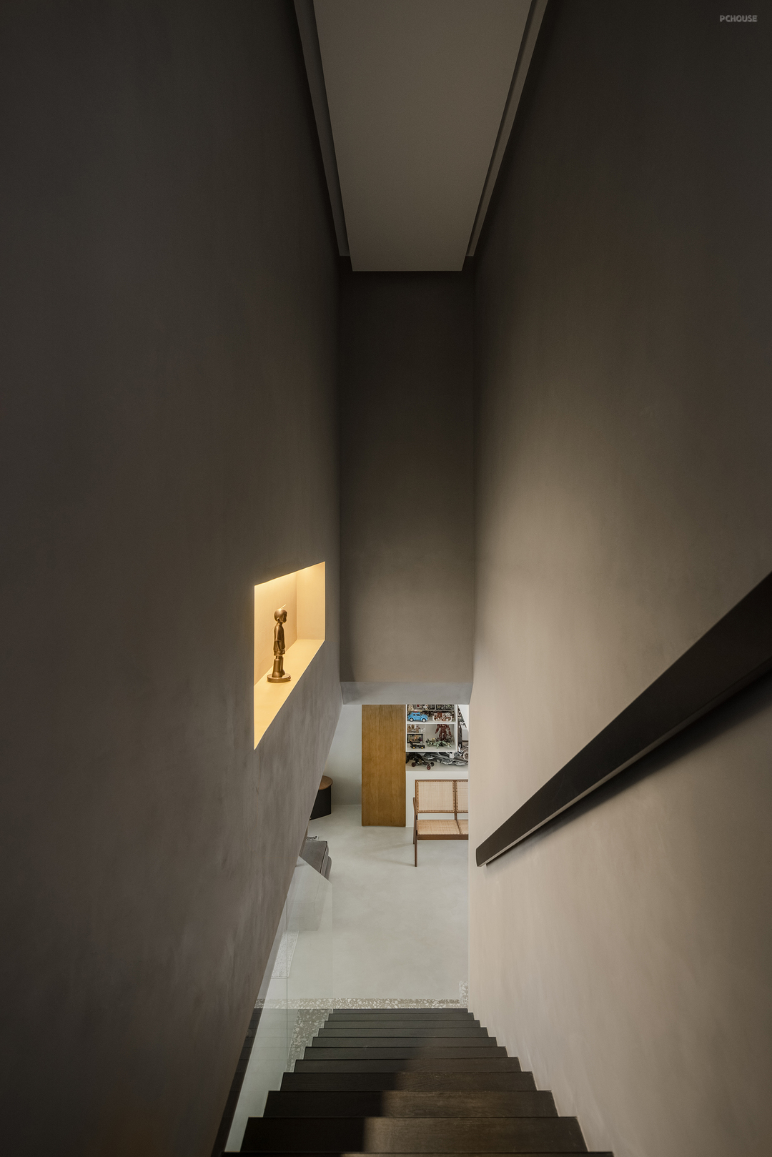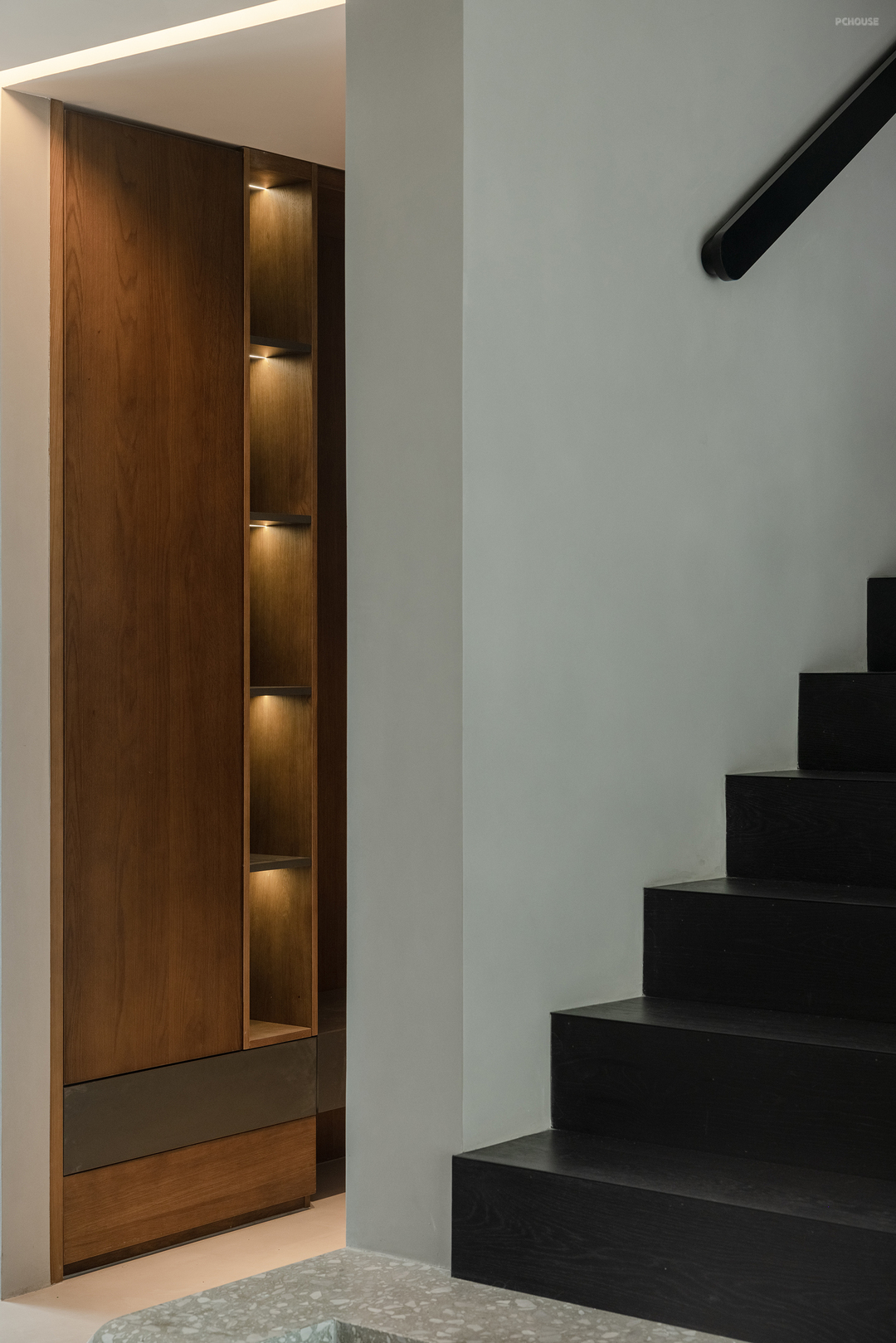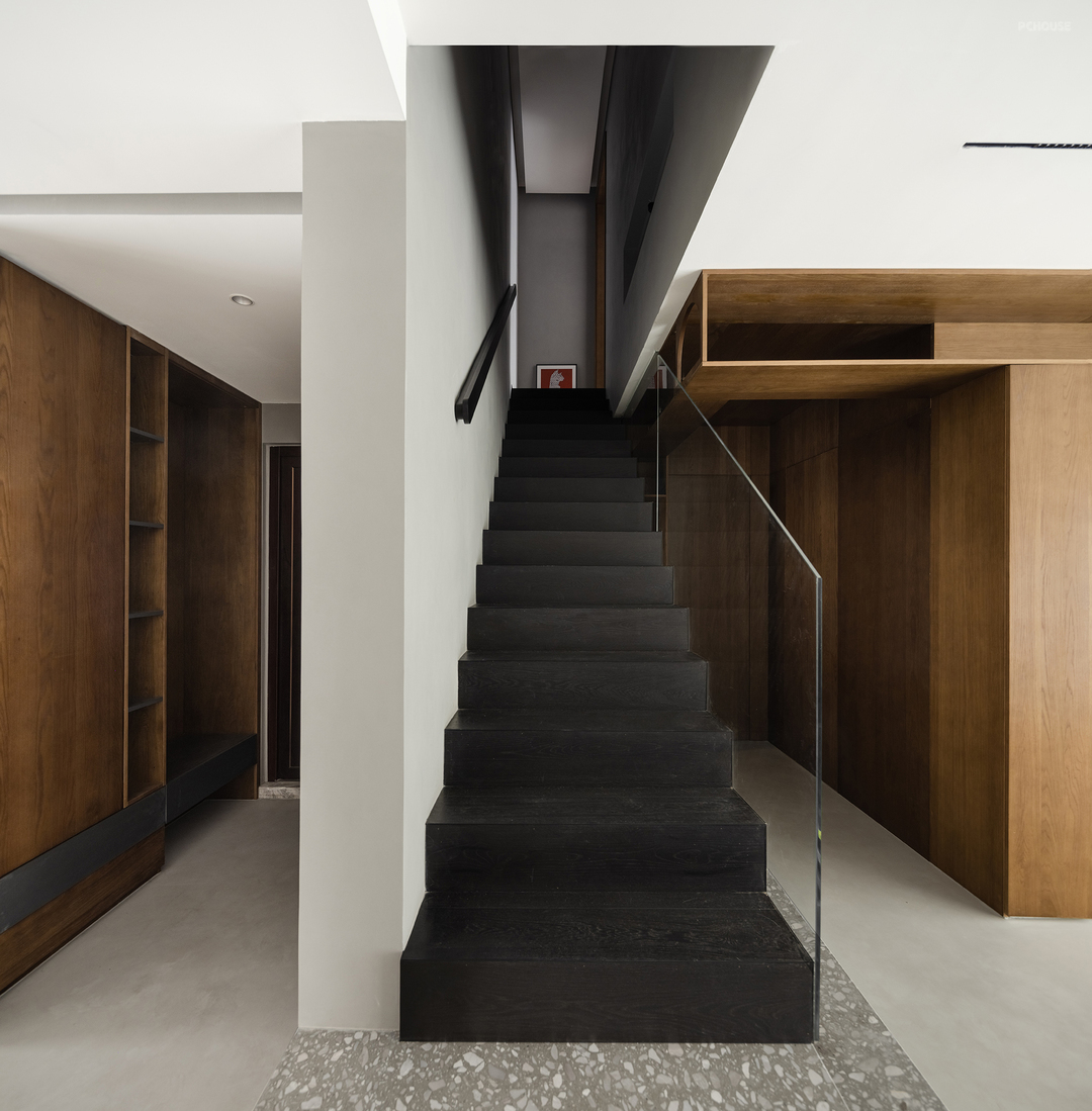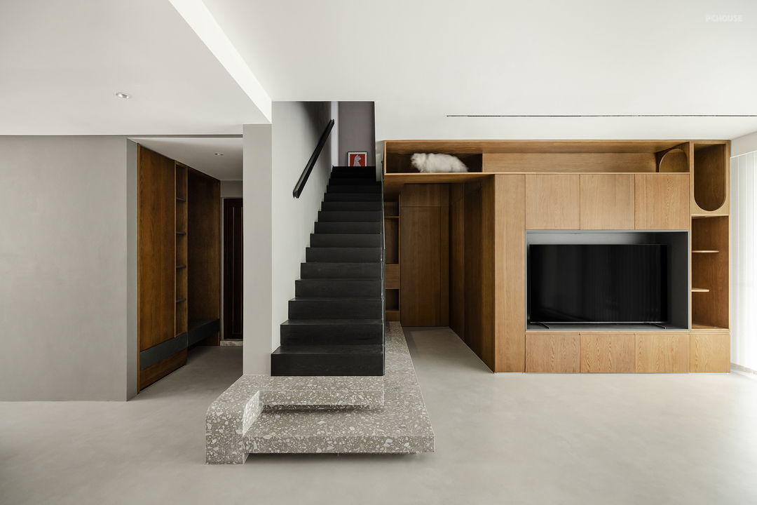 楼梯选择黑色木板覆层,呼应了客厅的沙发颜色,突出了其作为重要功能空间的存在感。而基座则选择了与地面同一色系的水磨石材质,既为了减弱楼梯体量的突出感,也因为楼梯下的空间会放置猫砂盆等宠物用品,水磨石材质更方便屋主后续打理。通过两部分材质的变化,打破空间的单调性,减弱楼梯对客厅空间感受的影响。