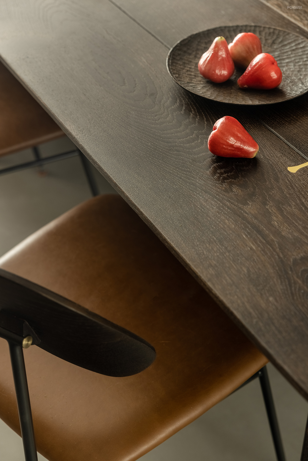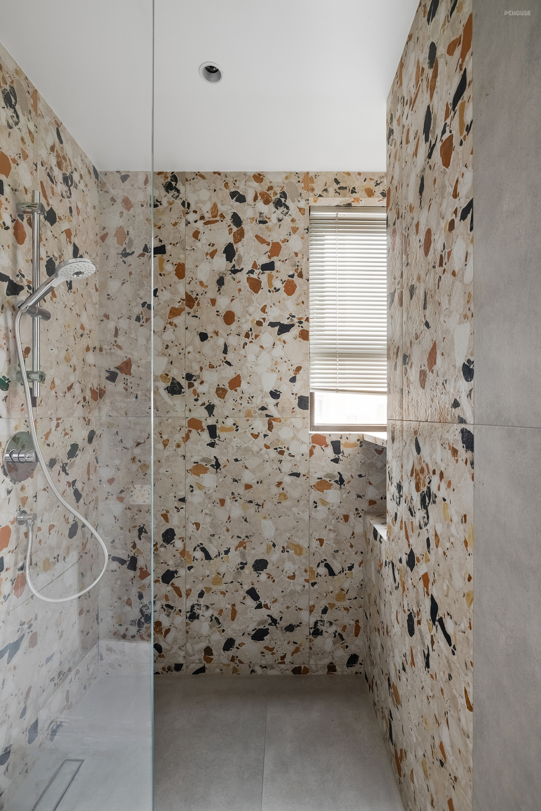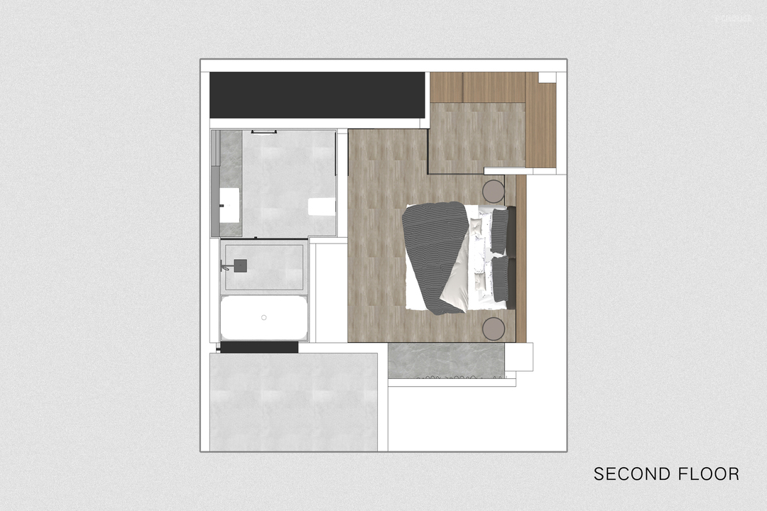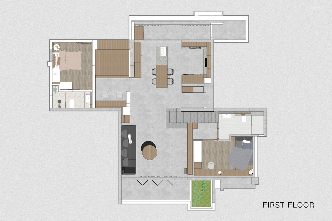 楼梯选择黑色木板覆层,呼应了客厅的沙发颜色,突出了其作为重要功能空间的存在感。而基座则选择了与地面同一色系的水磨石材质,既为了减弱楼梯体量的突出感,也因为楼梯下的空间会放置猫砂盆等宠物用品,水磨石材质更方便屋主后续打理。通过两部分材质的变化,打破空间的单调性,减弱楼梯对客厅空间感受的影响。