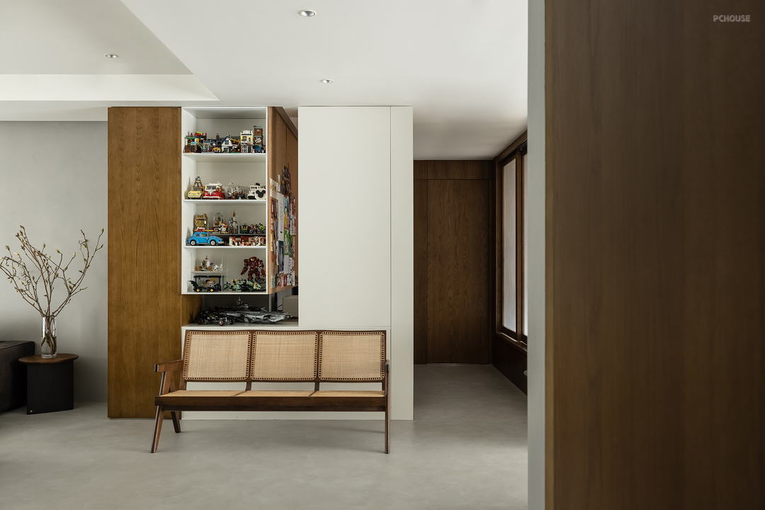 玄关作为进入住宅的第一印象,实用功能与视觉美观同样重要,避免一进门看见儿童房房门,故增加陈列柜阻挡部分视线。陈列柜上摆放了小朋友喜欢的乐高。