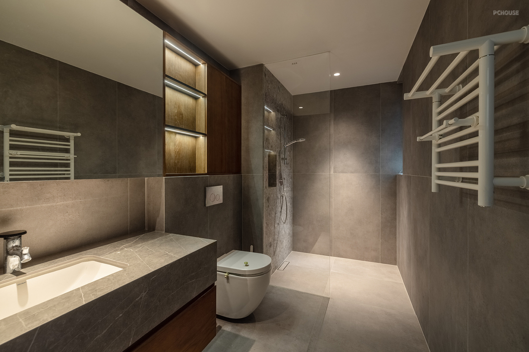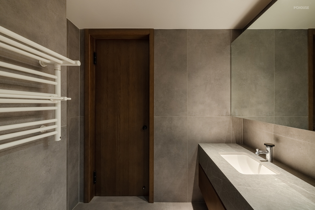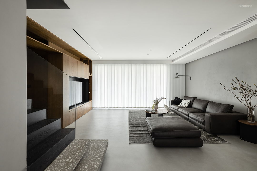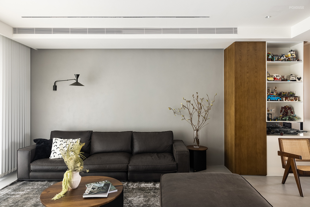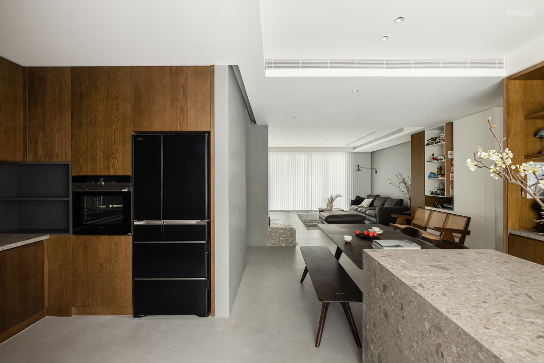 在了解屋主的审美偏好后,设计师在公共区域整体采用了灰色冷调微水泥与温暖的木质元素混搭的风格。