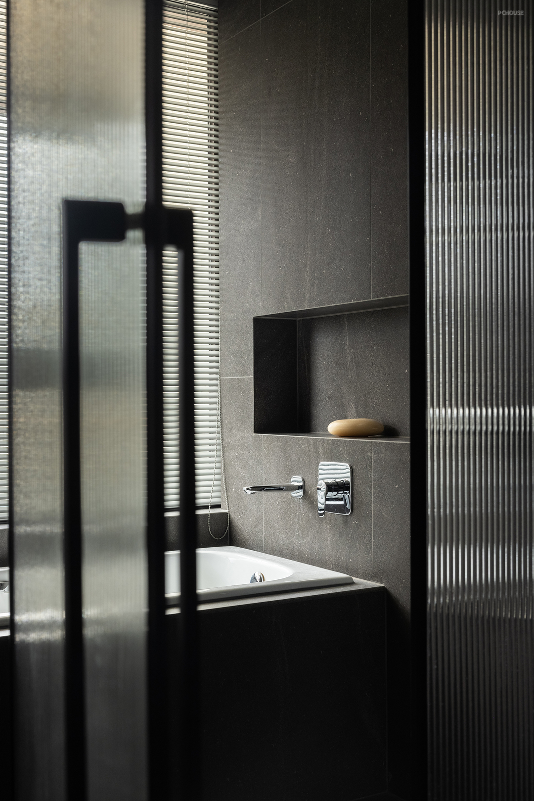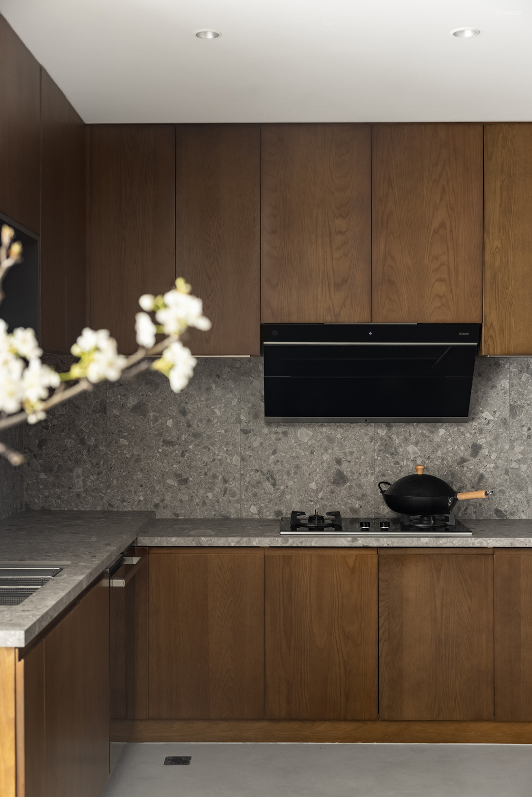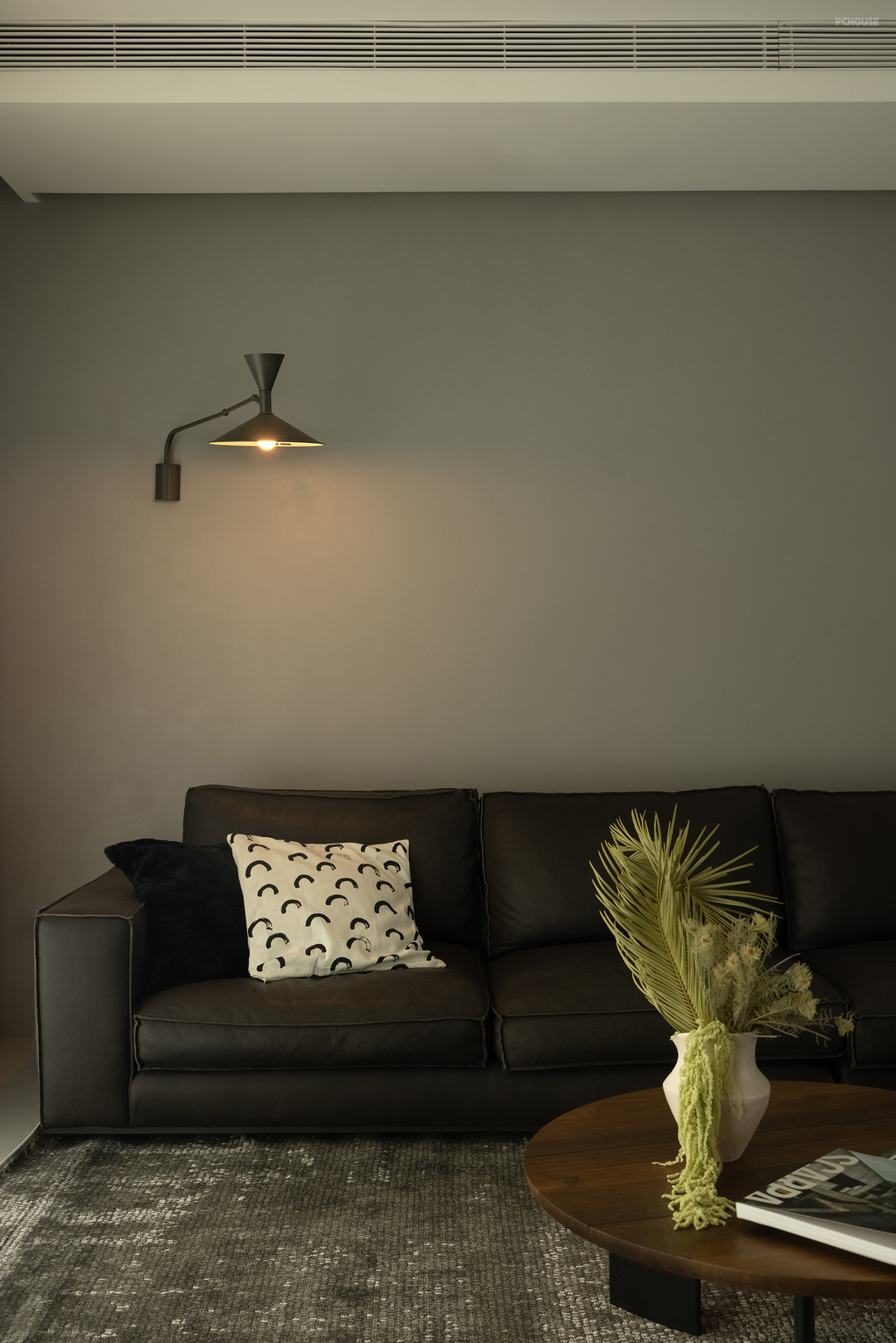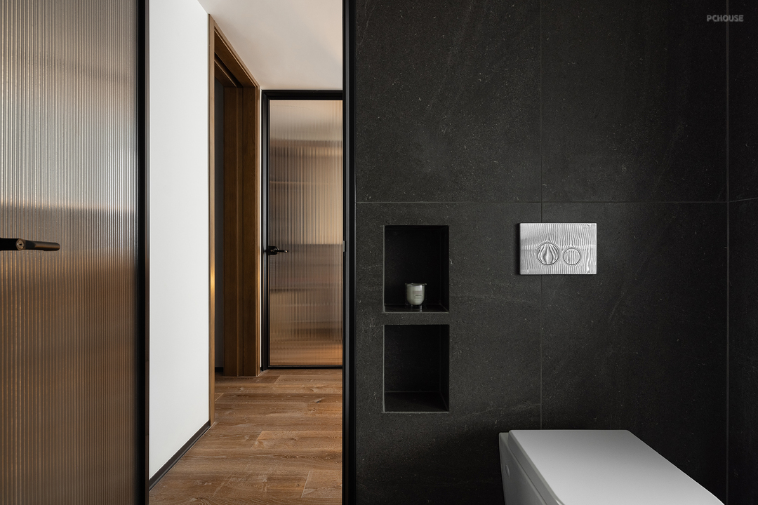 在了解屋主的审美偏好后,设计师在公共区域整体采用了灰色冷调微水泥与温暖的木质元素混搭的风格。