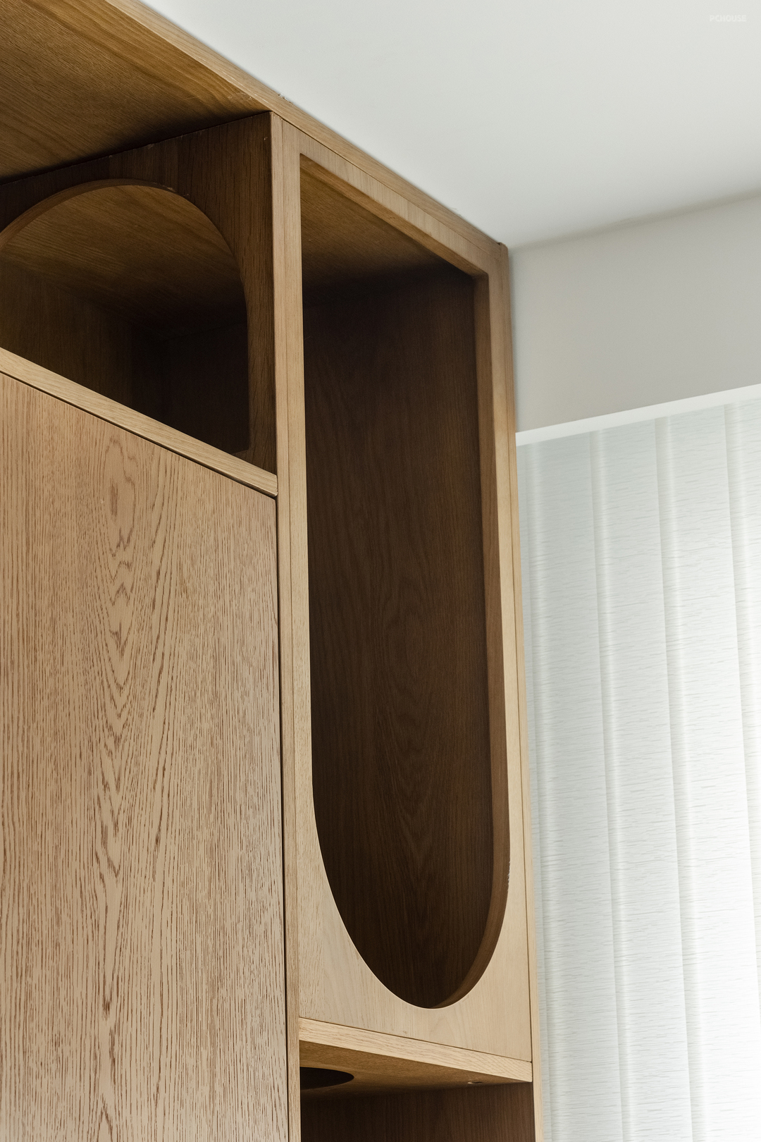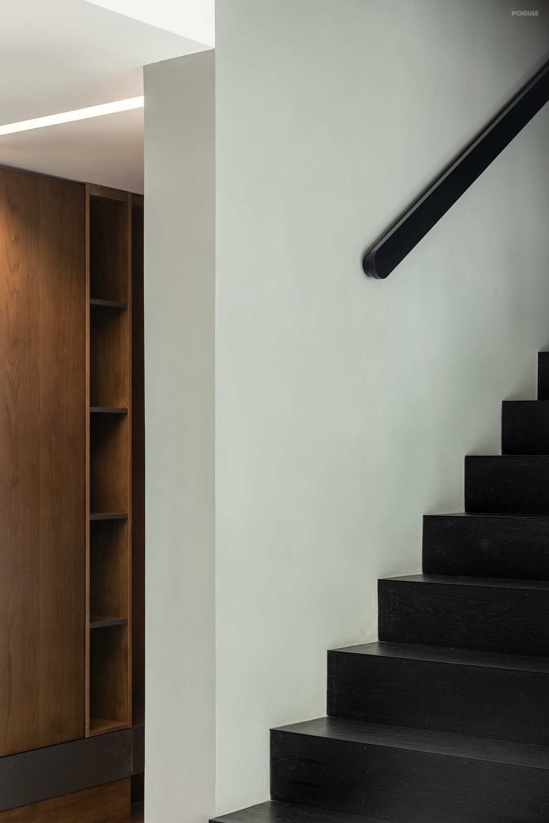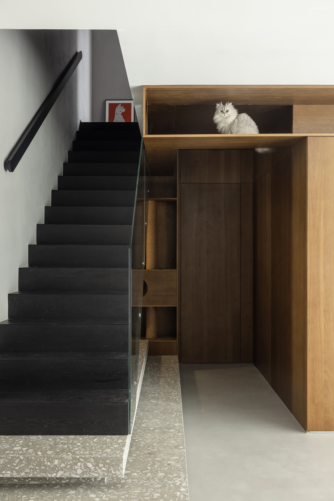 在规划楼梯空间的时候,由于楼梯下面通常因为斜角空间不符合人体工学尺寸,而在大多数情况下会被空置或者是被用作储物间。但对于猫咪来说,却是一处刚刚好的玩乐空间,于是设计师打了一面猫柜,将其作为猫咪的活动空间。