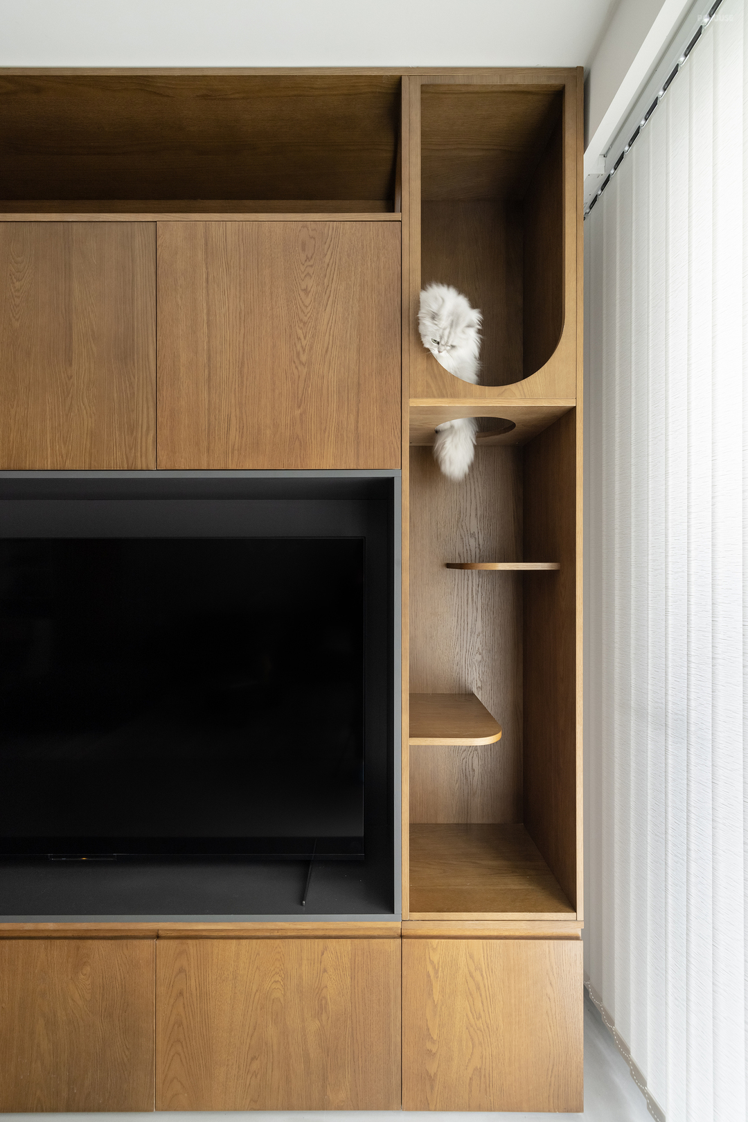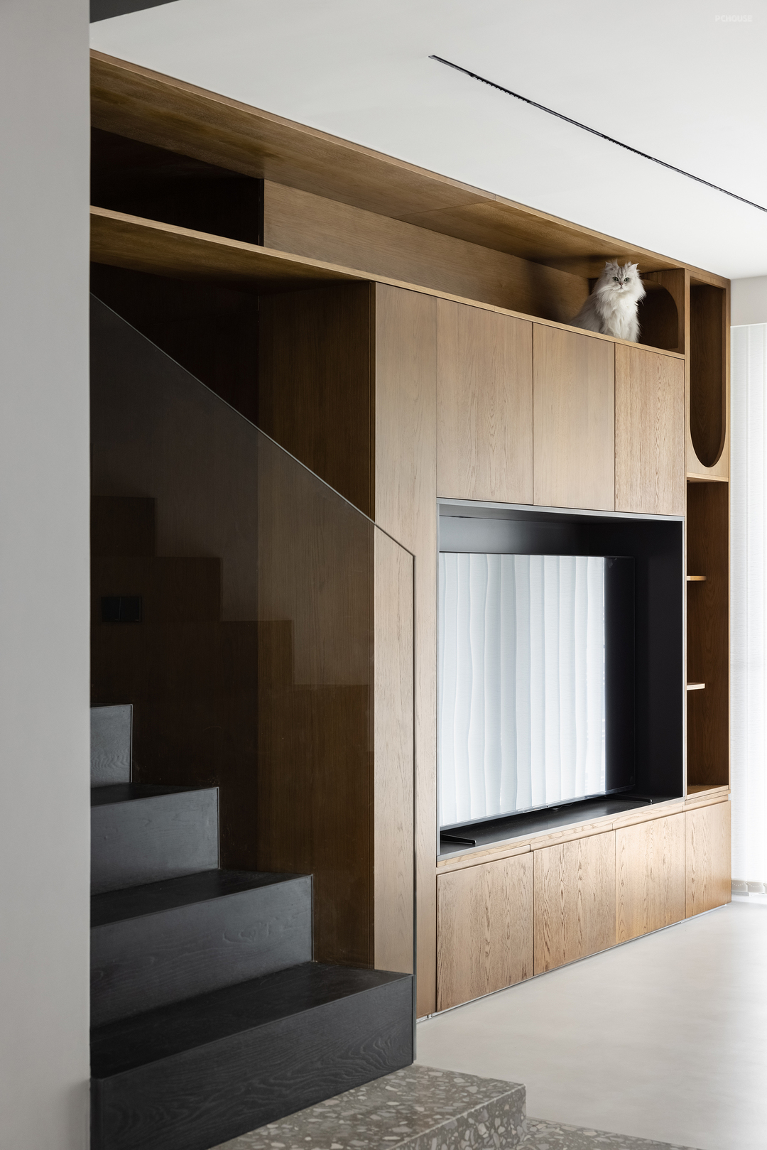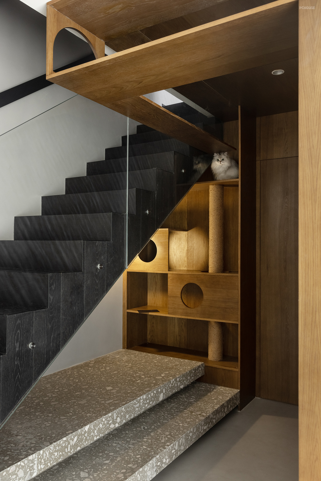 设计师将楼梯下方、过道上方以电视墙上方,都设置成了哈基米的活动场所,刚好也是人不太好使用的高度,长长的动线更适合猫咪跑酷,开放的通道也便于通风和打扫。
