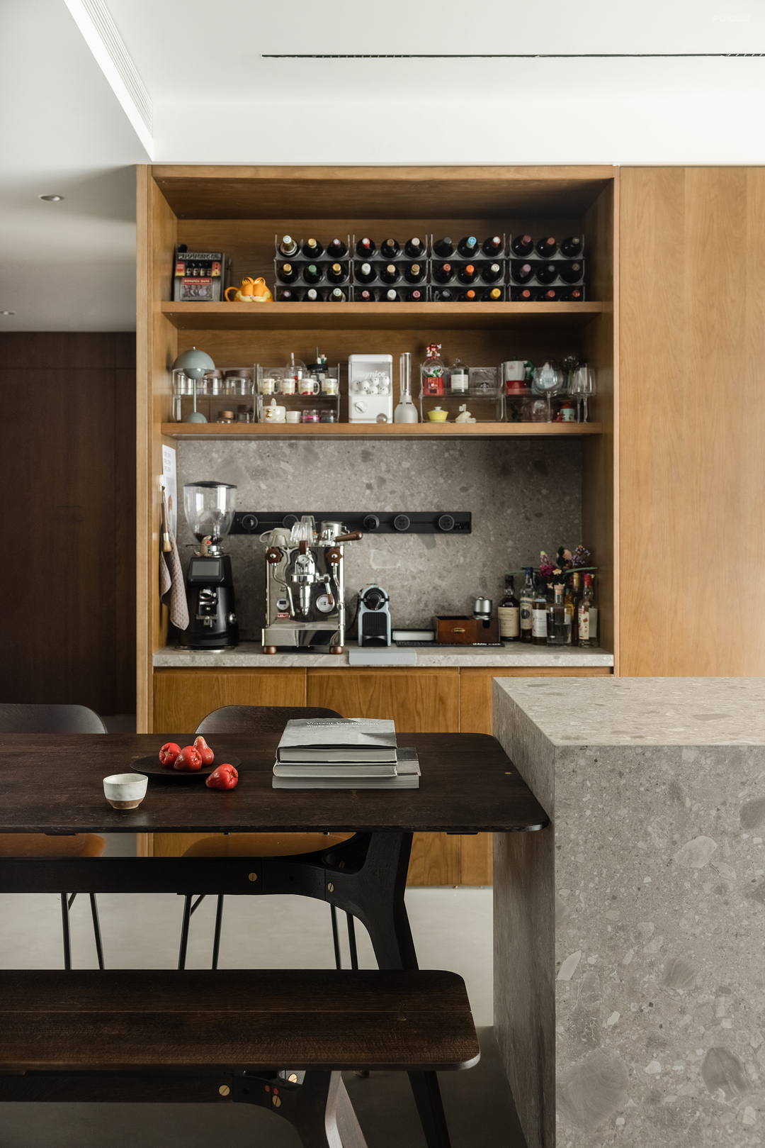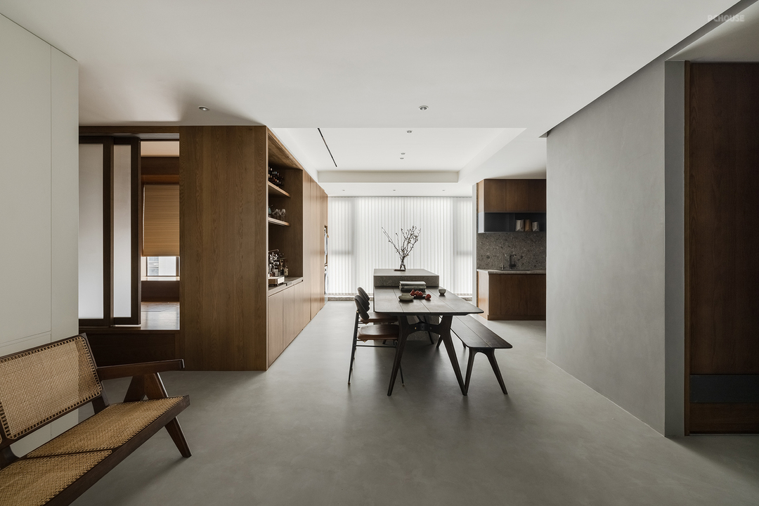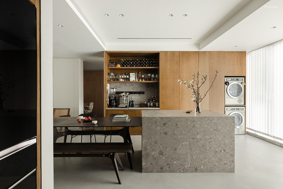 客厅的微水泥延续至餐厅,让整个空间更加完整。餐桌岛台一体化,位于空间中央,形成一条洄游动线,将厨房与咖啡吧台连接起来,满足了多种适用需求,可以最大化利用空间。