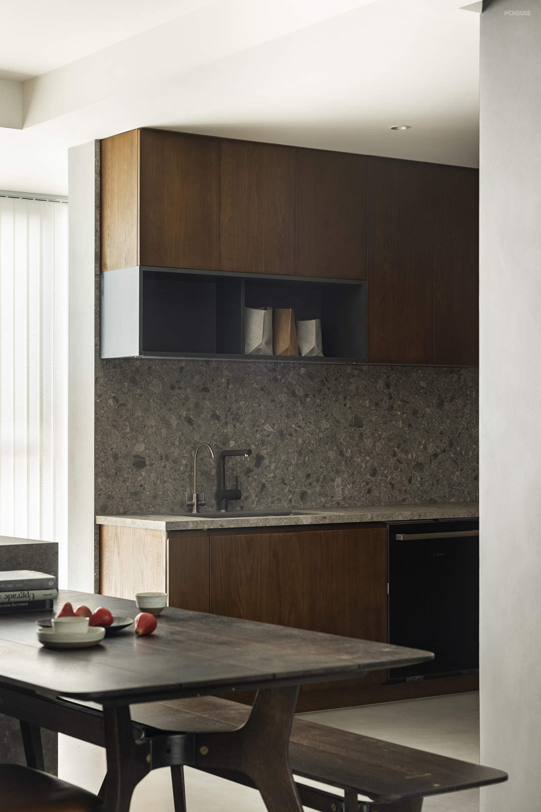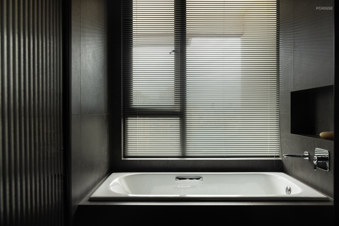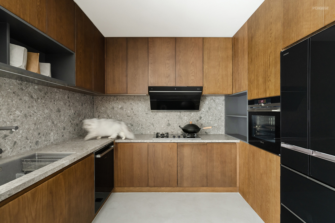 养猫之家,通常会将厨房做成封闭式空间,而在本案中,屋主反而希望厨房是敞开的,不必专门区隔人和猫咪的使用空间。但这也是人和猫长期相处之后,彼此了解之后的决定。厨房操作台面与背板也采用与岛台相同的石材,上下柜体满足了收纳需求。局部灰色开放层板设计,实用又好看,合理利用了墙面垂直空间。