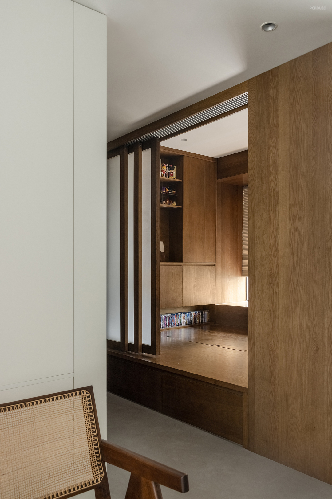 多功能室通过抬高,做出了一个日式榻榻米空间,抬高处作为收纳空间,也能作为客卧来使用。活动的推拉门也能让空间与书房产生联动。