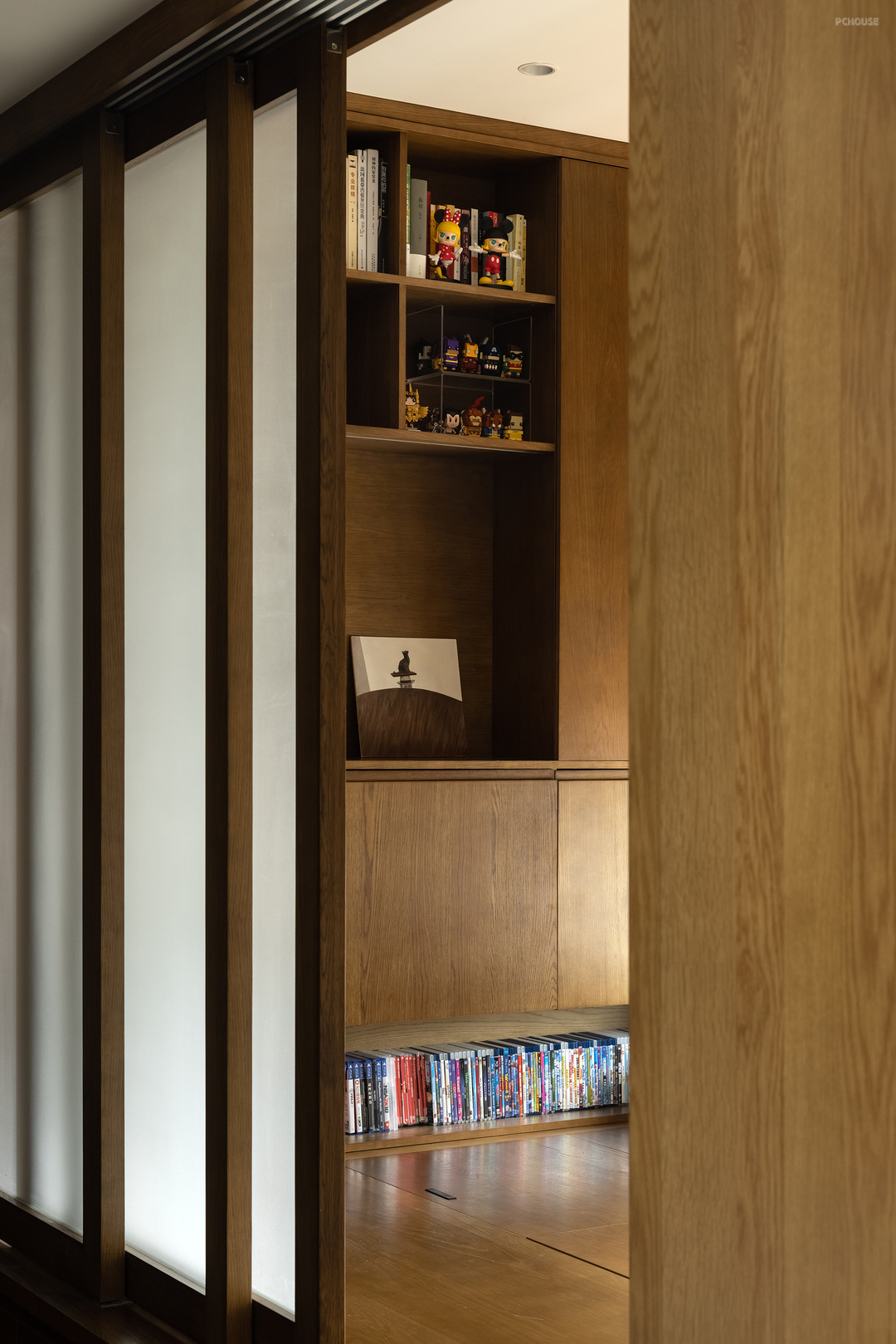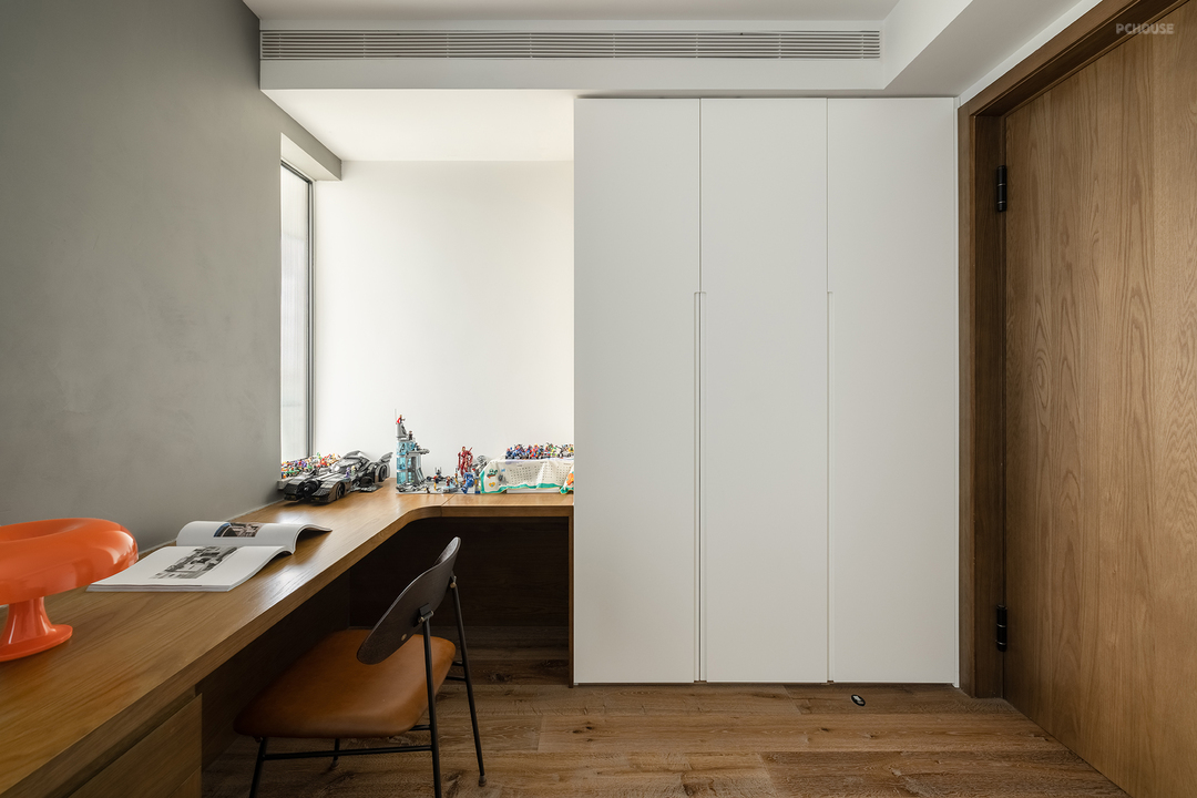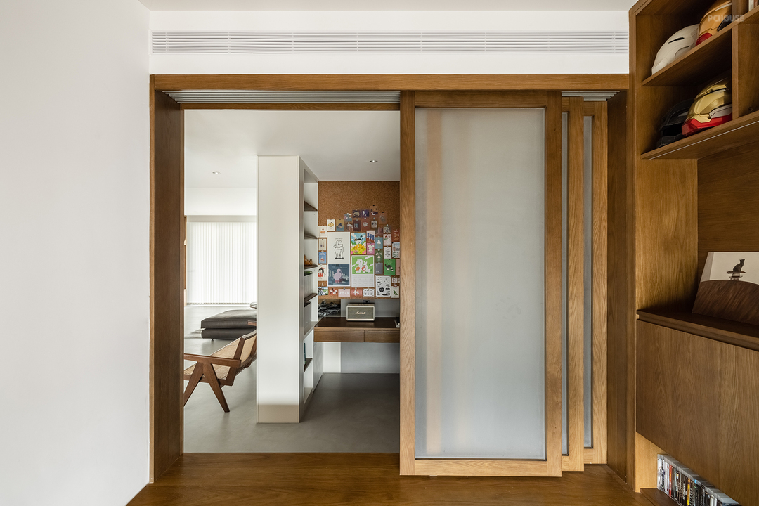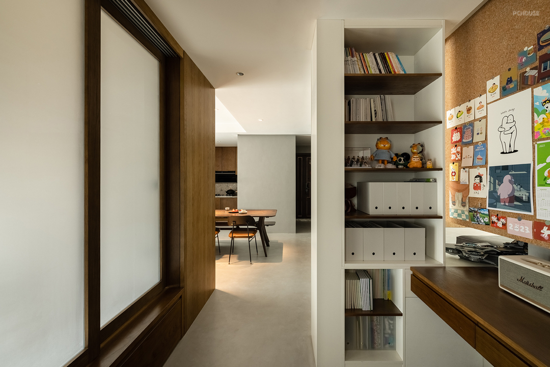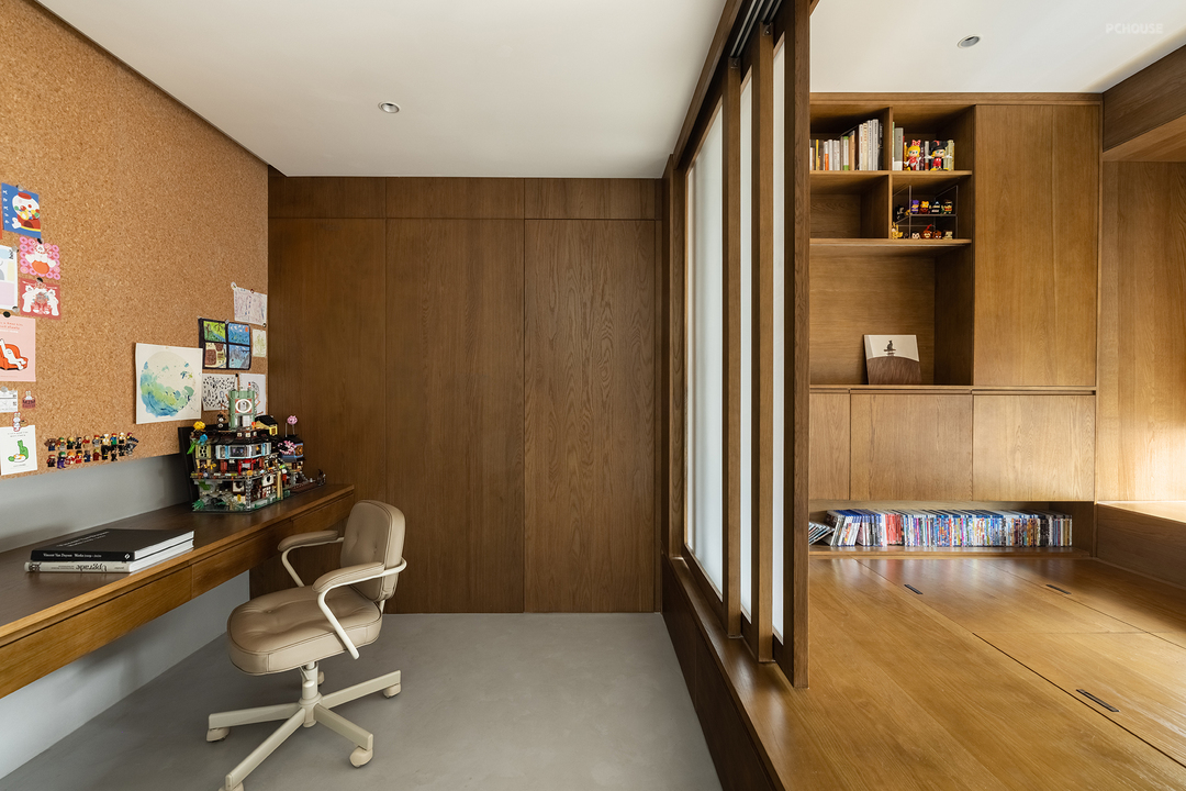 原有的多功能房也经过布局切割,分成了开放的书房和半开放的多功能室。书房通过陈列柜阻挡了部分来自入户玄关的视线,墙面上巨大的软木板可以随意装订喜欢的海报,屋主可以在这里尽情发挥想象力。