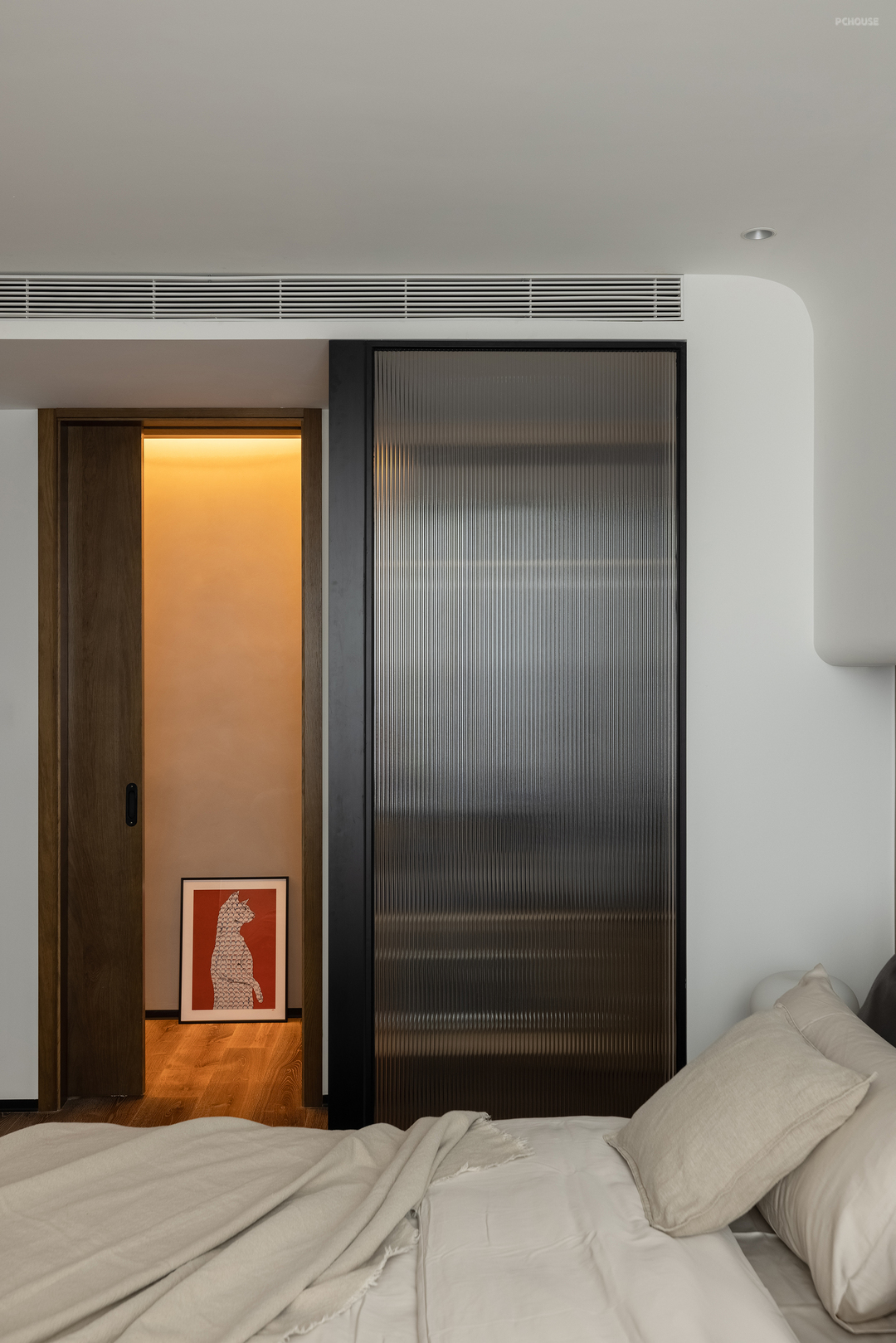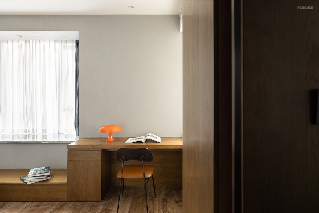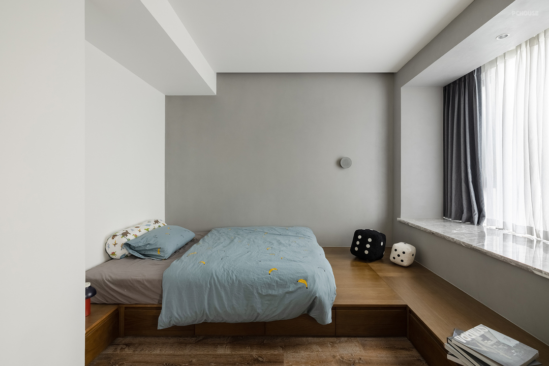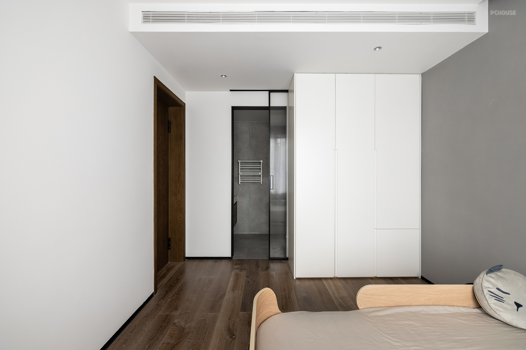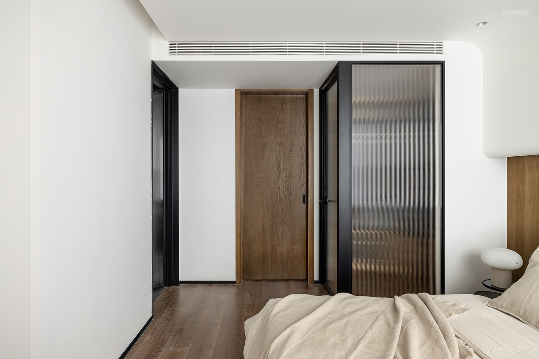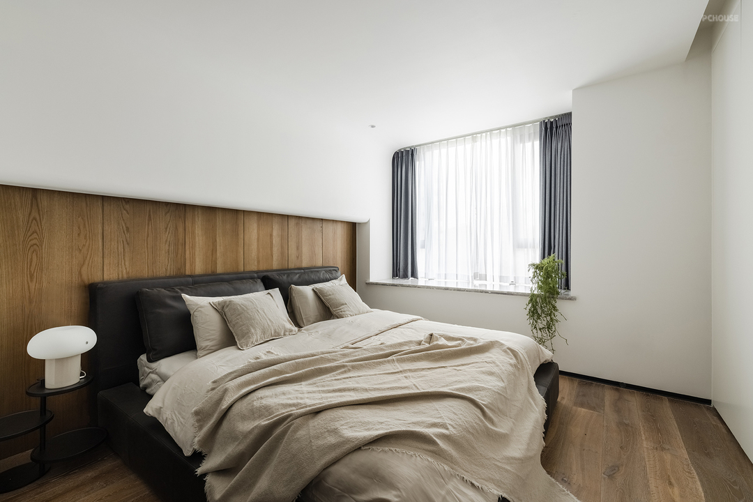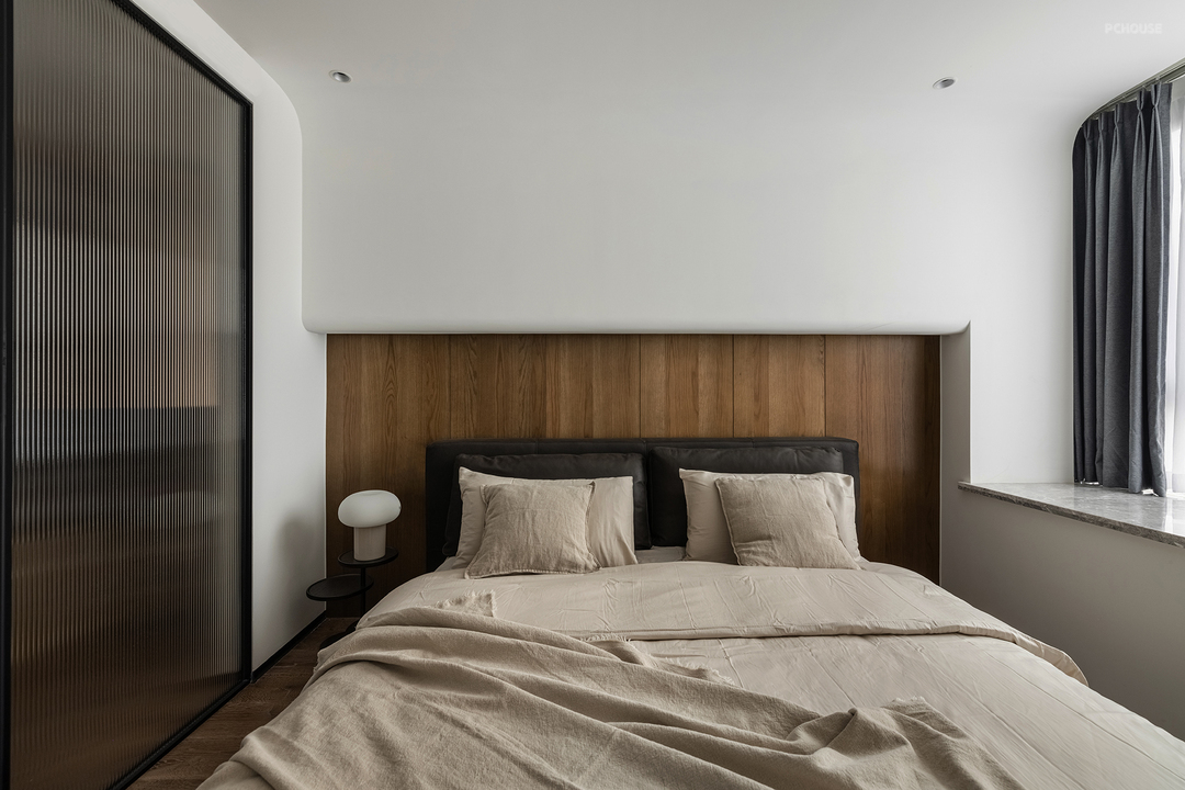 主卧多处采用了弧形倒角,让空间更加柔和。半墙床头与地板相呼应,一字型延伸让空间感倍增。