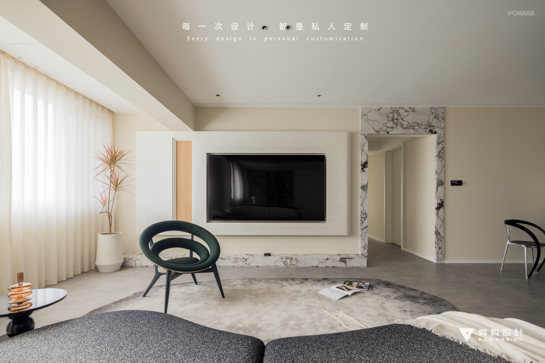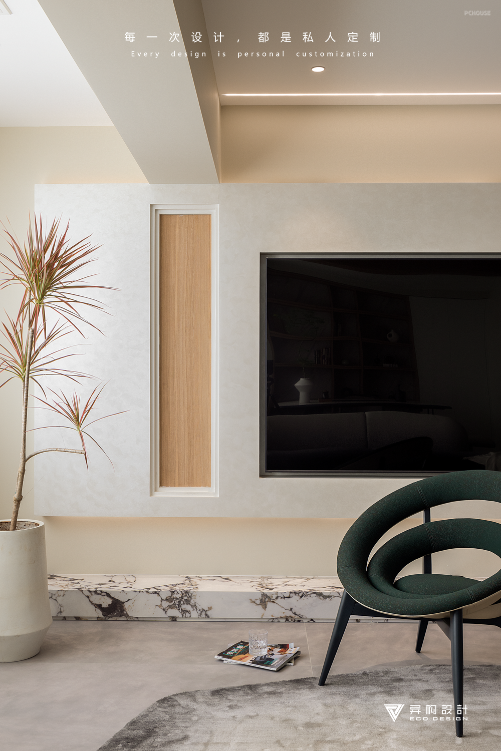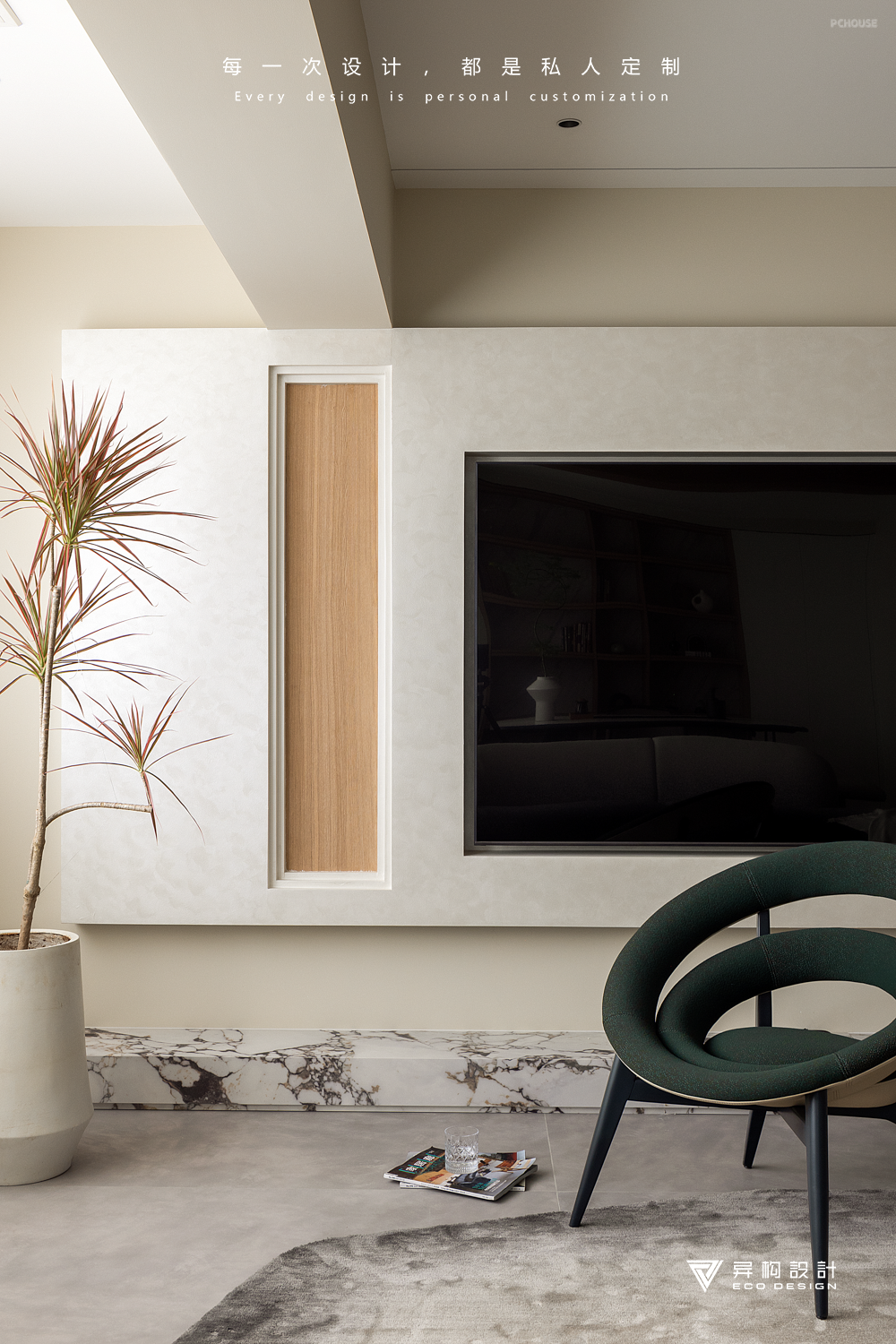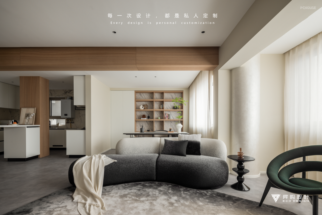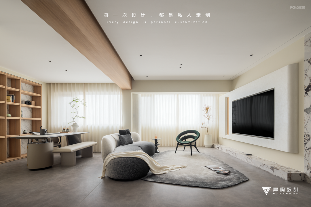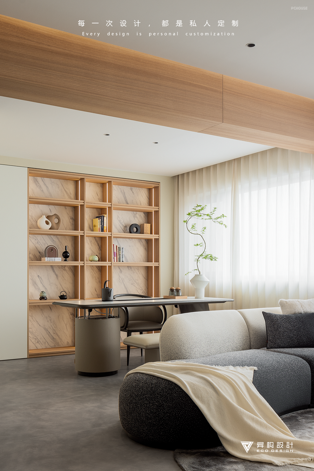 将原始户型的小书房改为开放式茶室,扩大会客厅面积。同时选择奶白色的纱帘将自然光柔和过渡进室内,结合原木材质与绿植,使空间更干净清爽、视觉效果更明亮开阔。