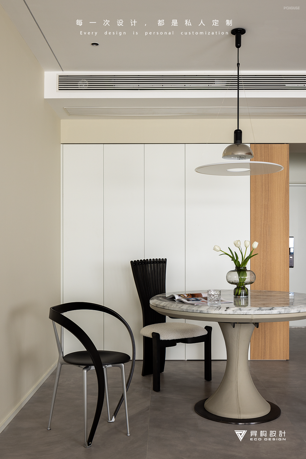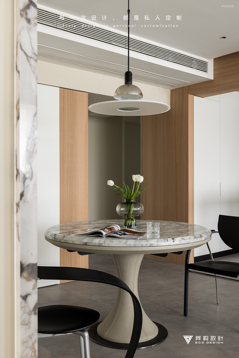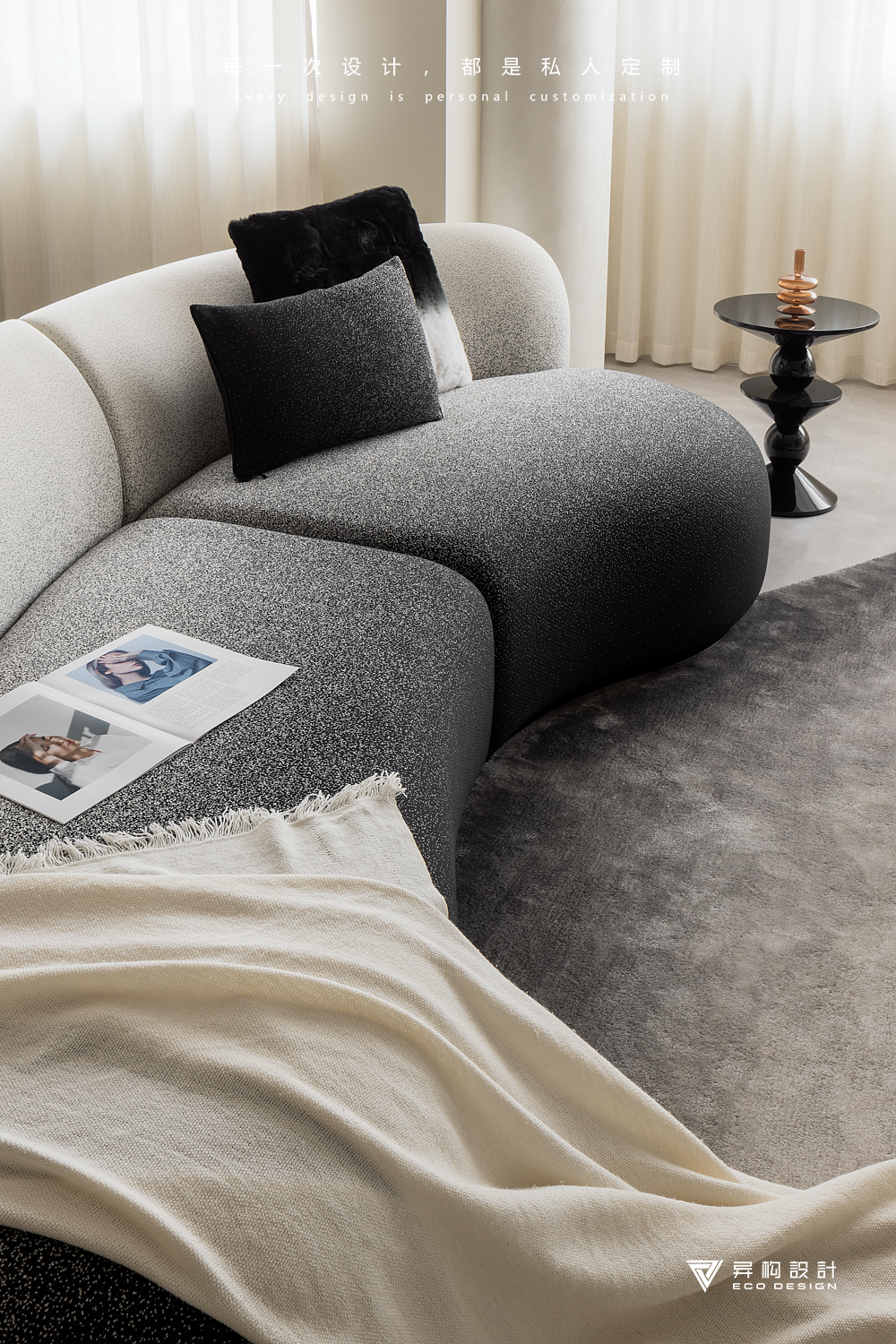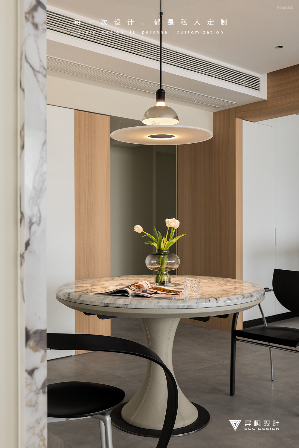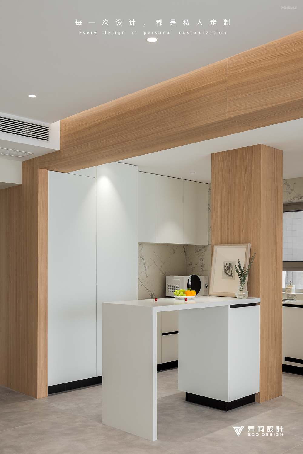 将原始户型的小书房改为开放式茶室,扩大会客厅面积。同时选择奶白色的纱帘将自然光柔和过渡进室内,结合原木材质与绿植,使空间更干净清爽、视觉效果更明亮开阔。