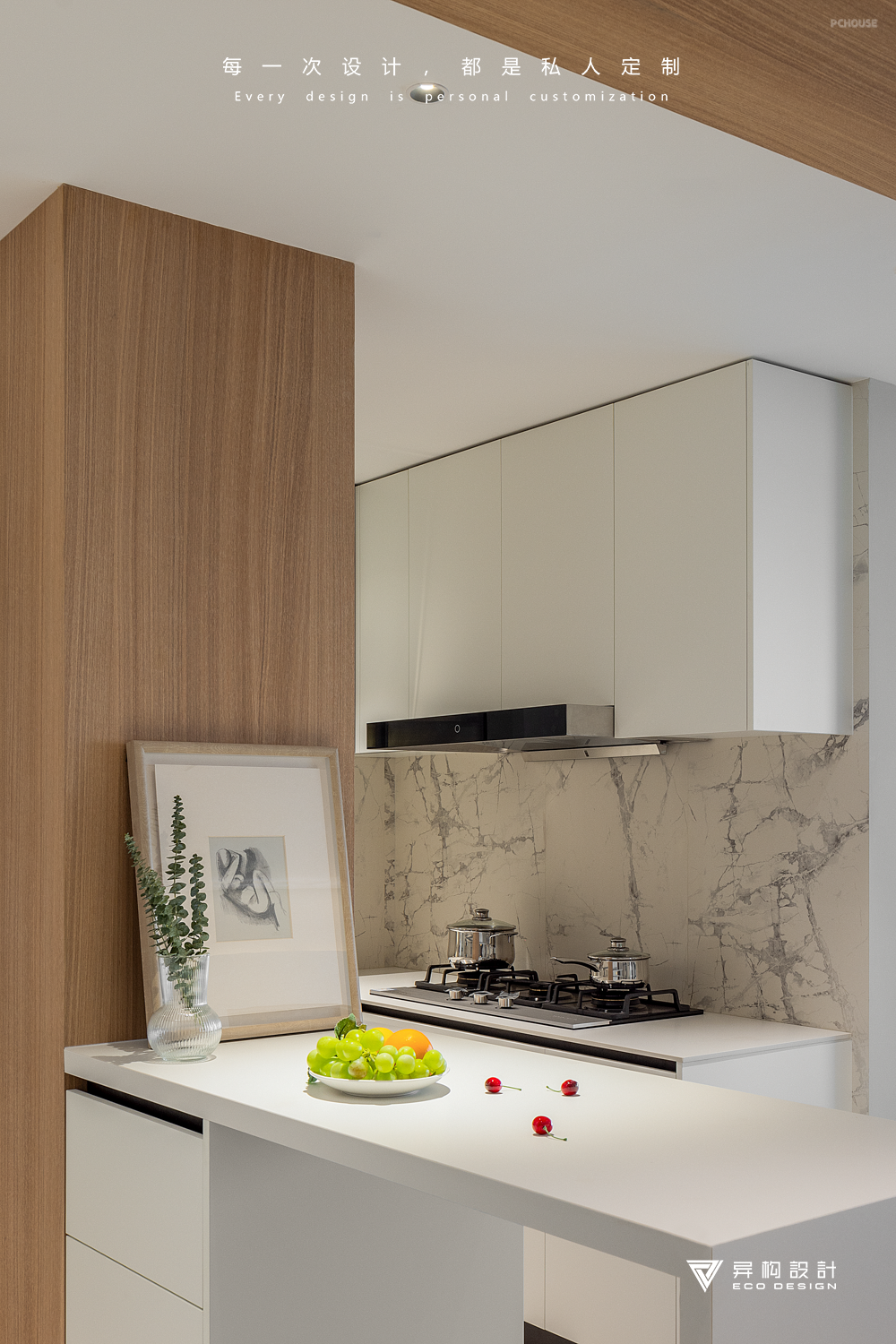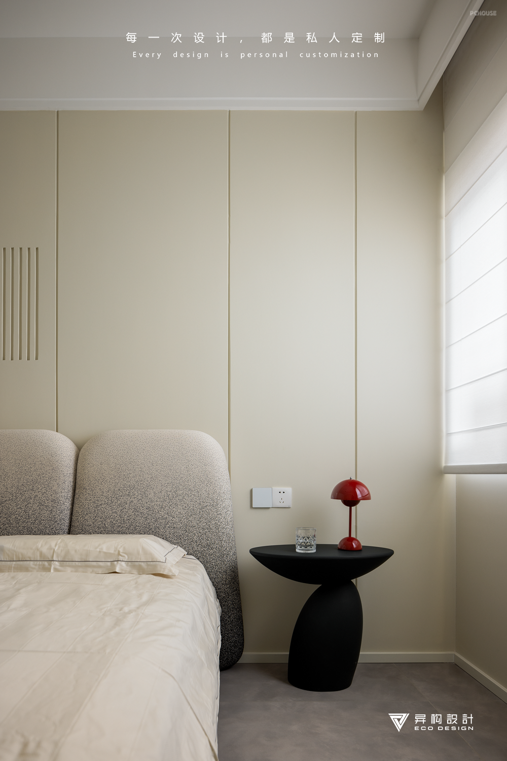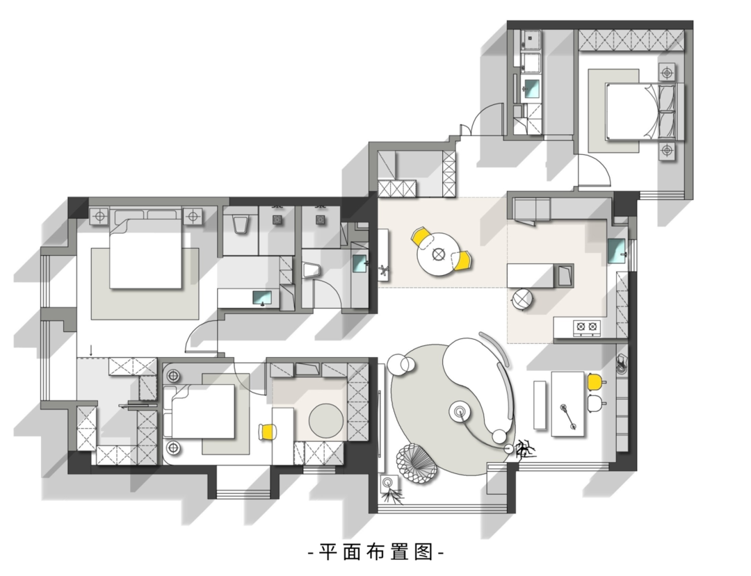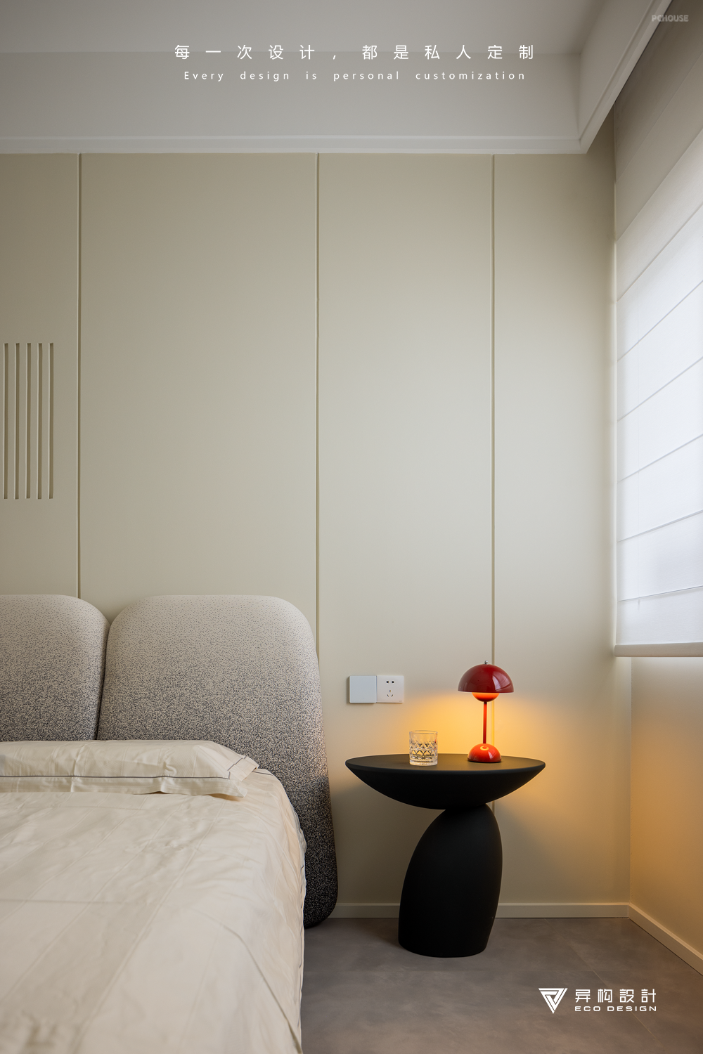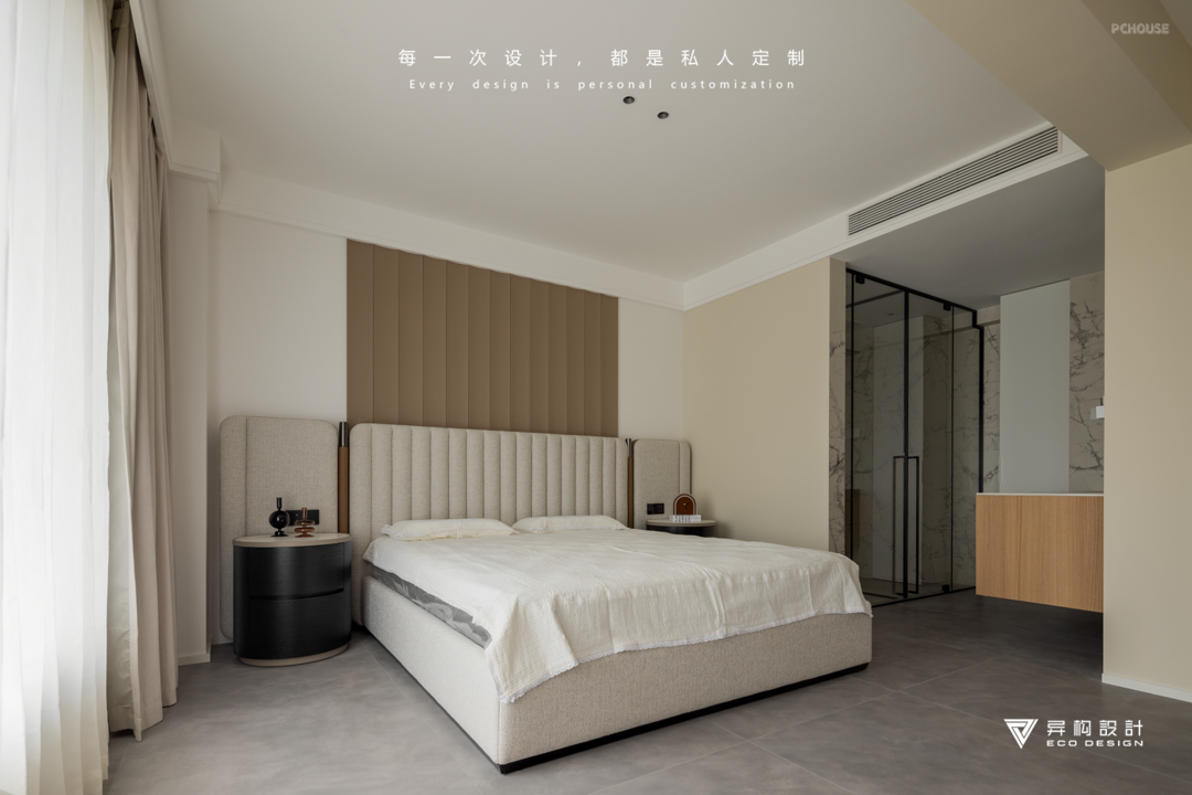 将原始户型的小书房改为开放式茶室,扩大会客厅面积。同时选择奶白色的纱帘将自然光柔和过渡进室内,结合原木材质与绿植,使空间更干净清爽、视觉效果更明亮开阔。