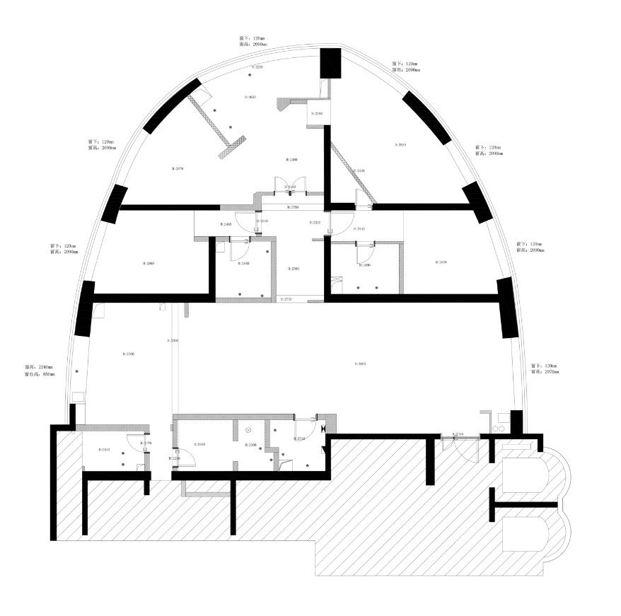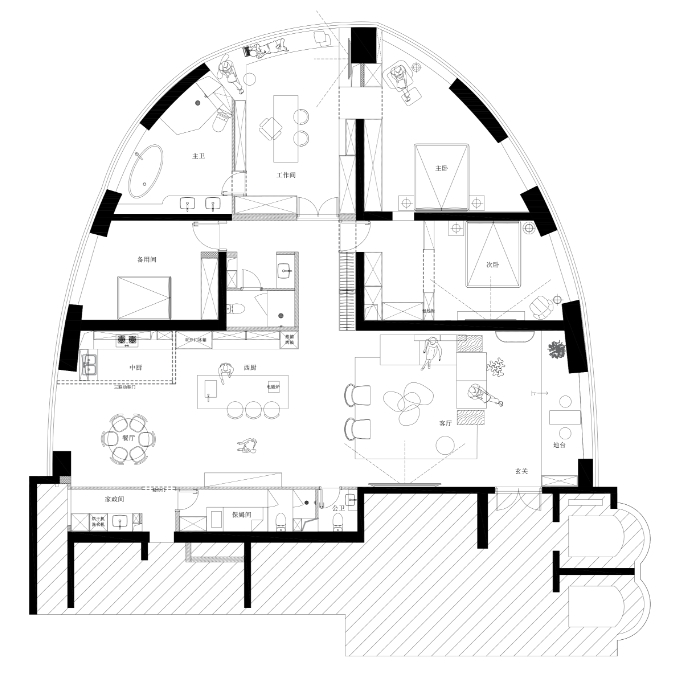 本案,位于王子晶品,300㎡ 弧形玻璃幕墙结构私宅,由于客餐厅纵深较长因素,存在采光不足的问题。三房两厅四卫的户型结构对于一家三口来说存在空间的浪费,基于此,屋主最终决定全拆处理。
