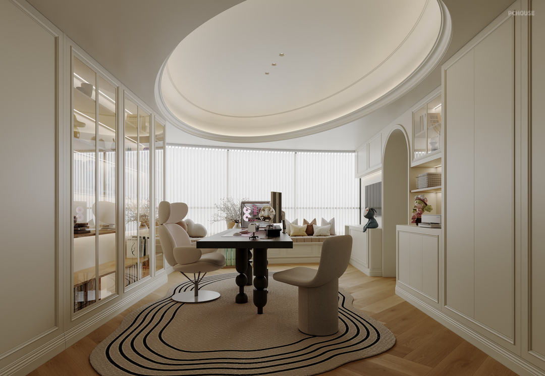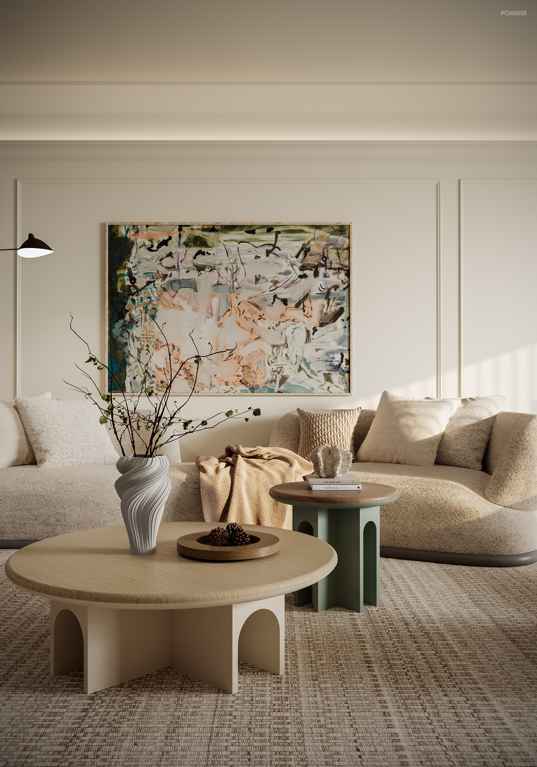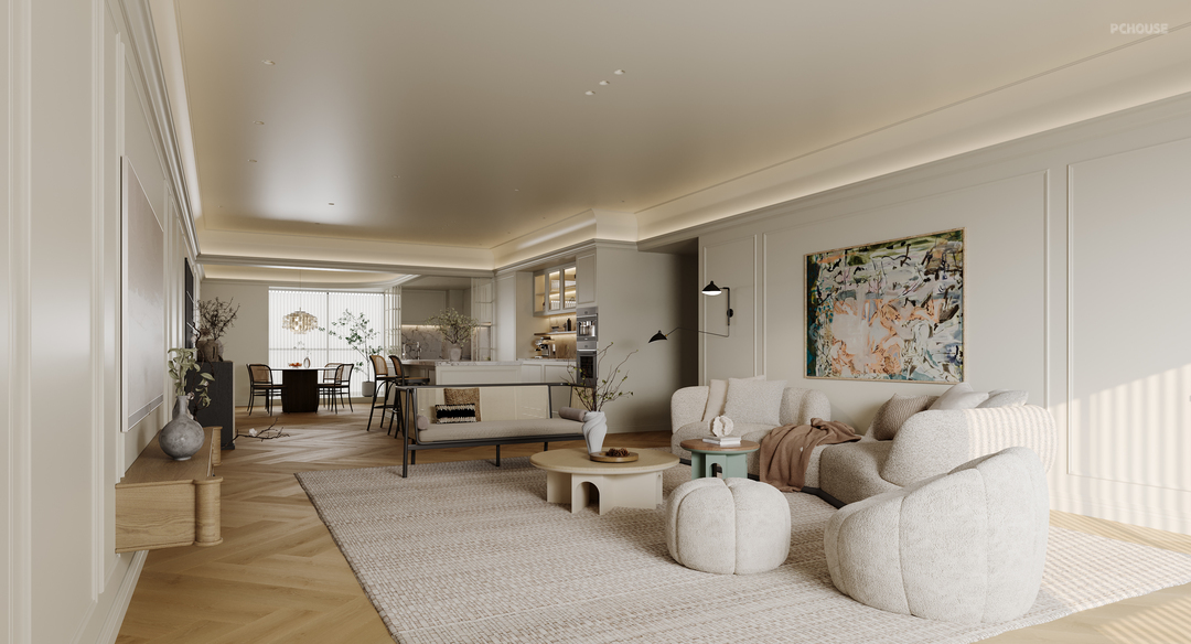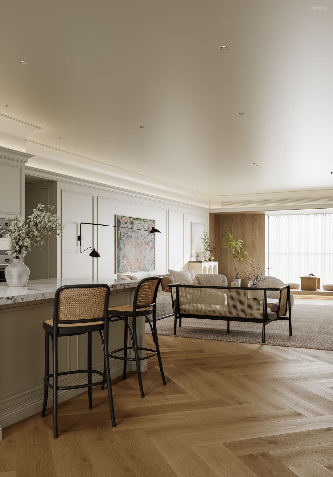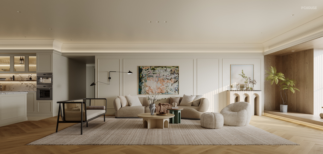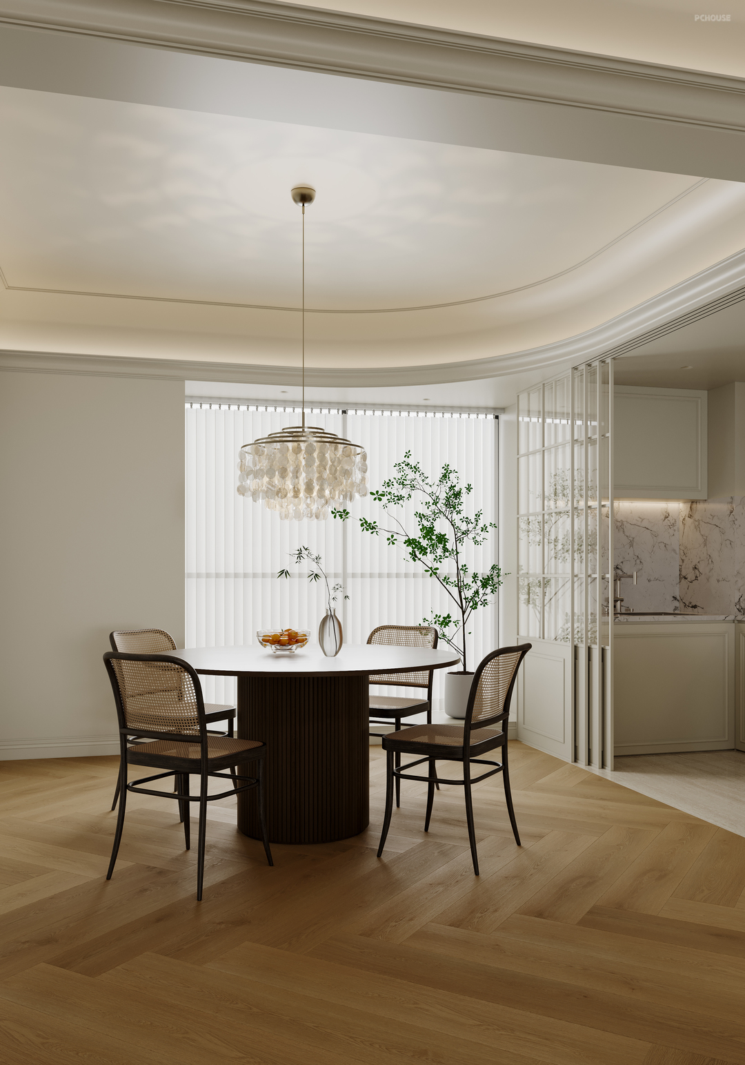 风格上偏向于自然复古藤编元素的法式风格,营造出既古典又不失现代感的生活氛围。墙面与天花板做了一体化处理,客厅吊顶全部打开,只保留梁的位置,再使用贴边设计为精致的穹顶造型,进一步强化室内氛围的独特性。
