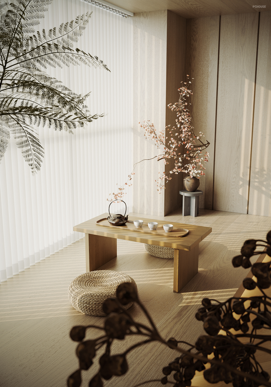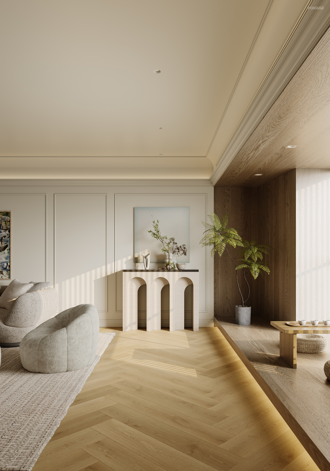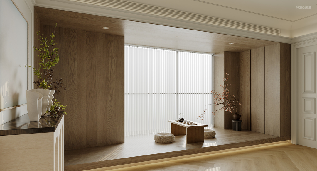 客厅与入户融为一体,创造出既独立又富有特色的入户体验。右侧为父母特设了一方茶室,无论是独自品茗还是与友人相聚,皆可在此享受宁静美好。