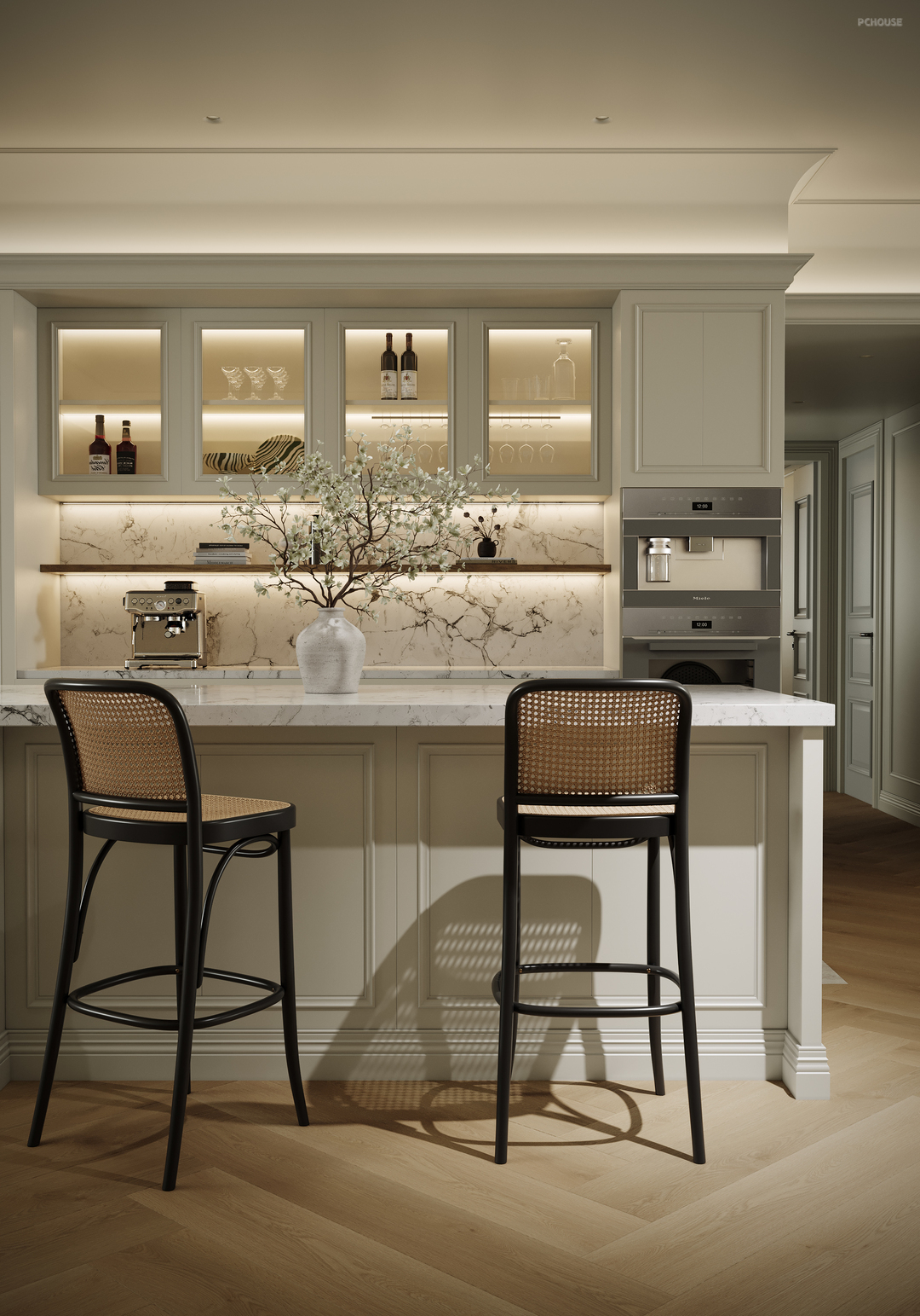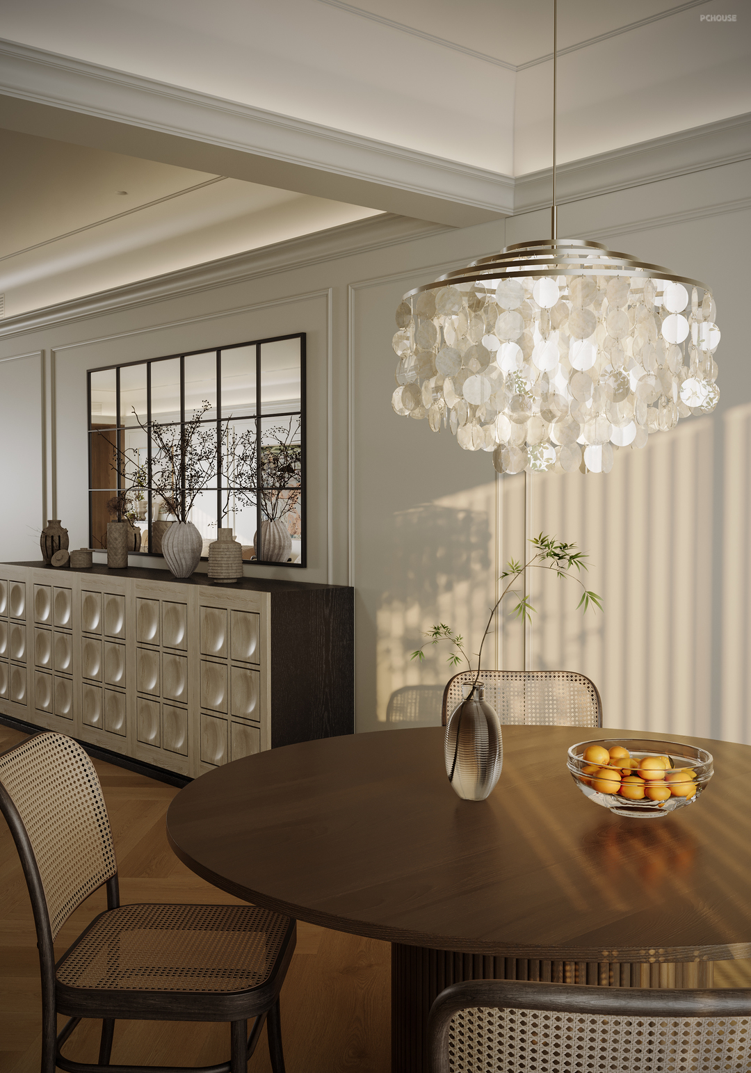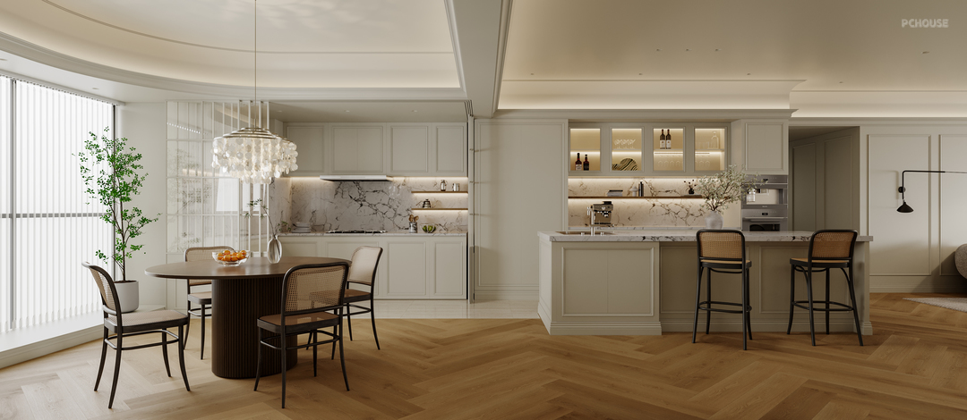 为了让整个家的气场更加强大,设计师将保姆间和客卫缩小,餐厅挪至窗户边,改善采光条件,让用餐时光也能沐浴在温暖的日光之中。厨房则整为横向的一个中厨和一个西厨,开放式中西式烹饪区,增强了互动性和使用便利性。