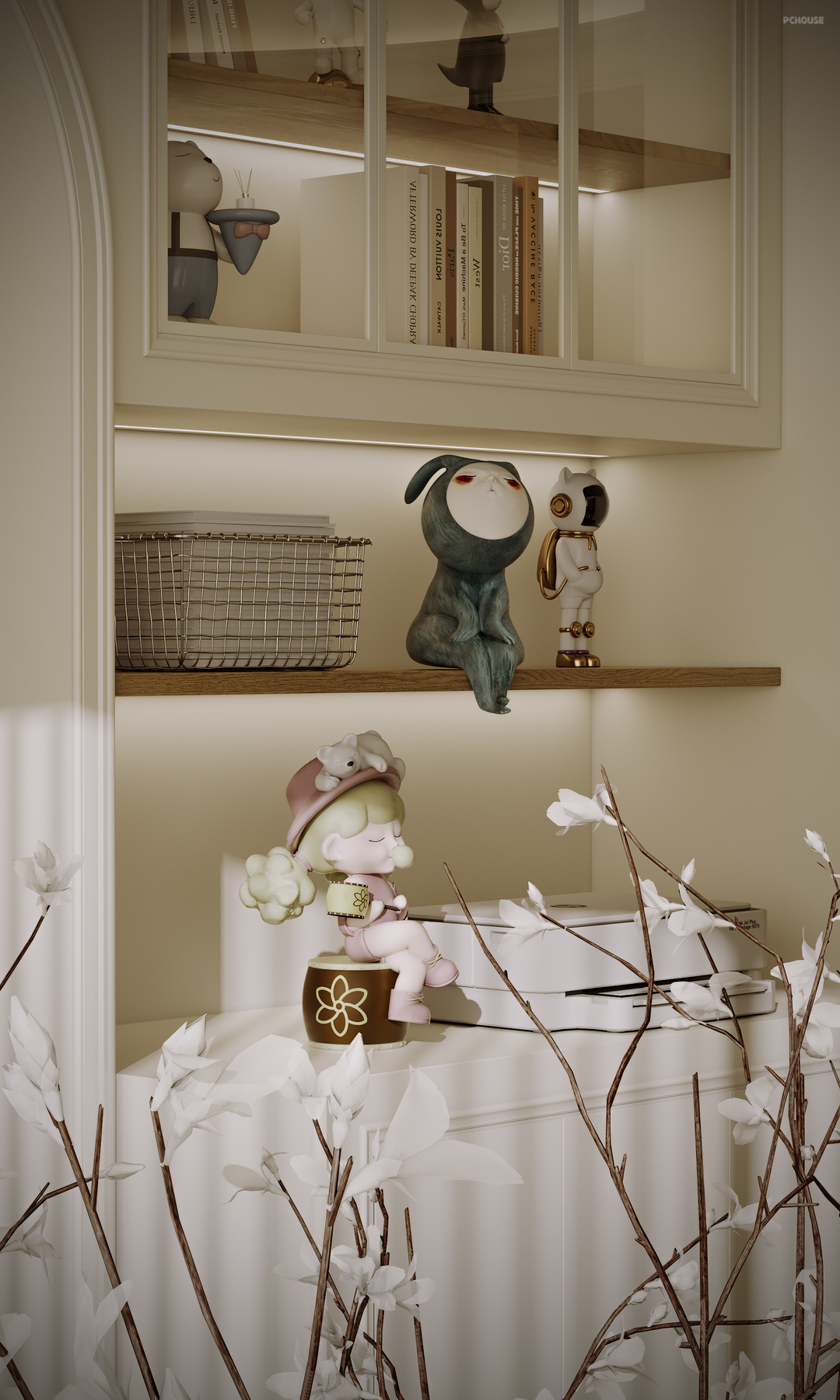 主卧调整了床的方向,增加了一整排的衣柜,并设计了阅读角落,为女儿提供了一个安静的休憩空间,让她在书海中遨游,或是在疲惫时小憩片刻。