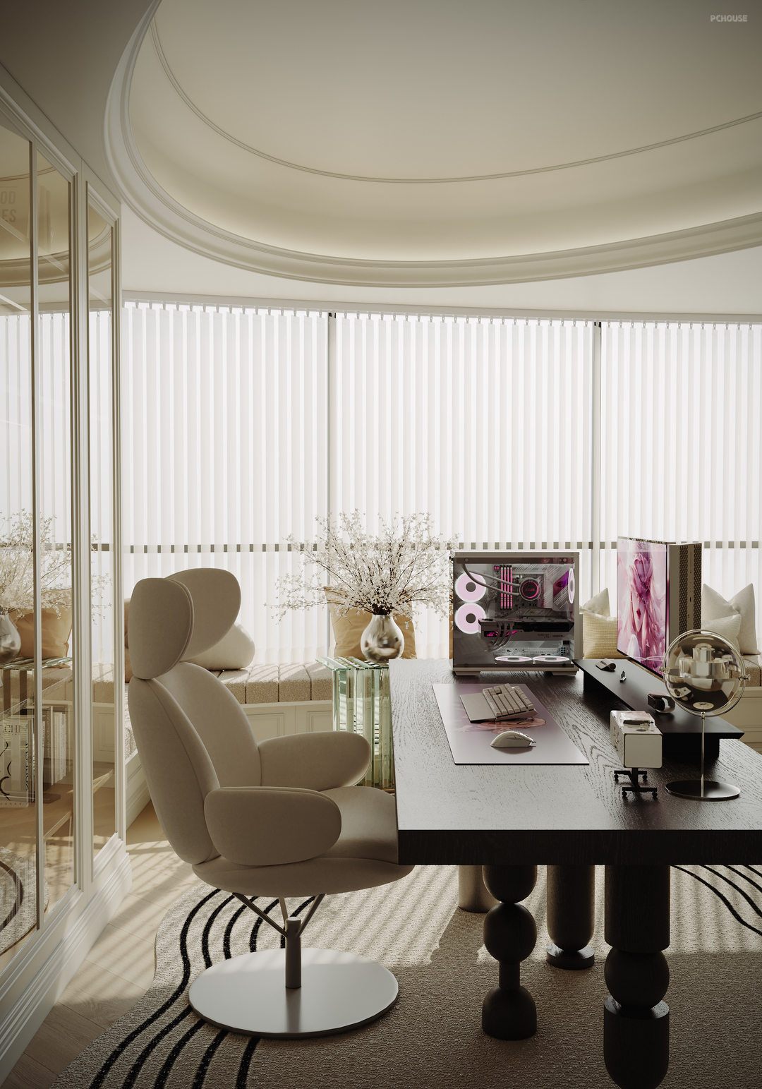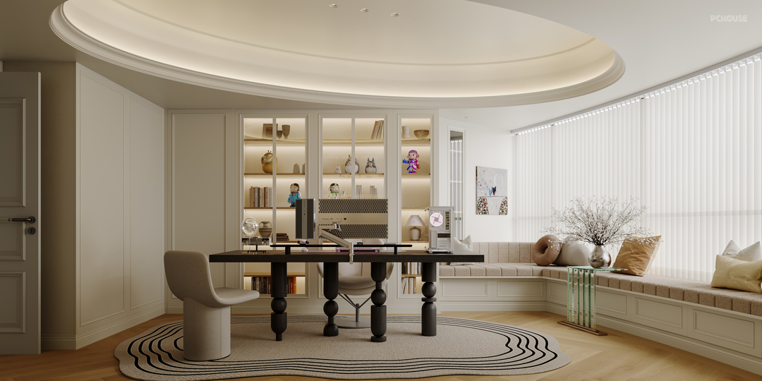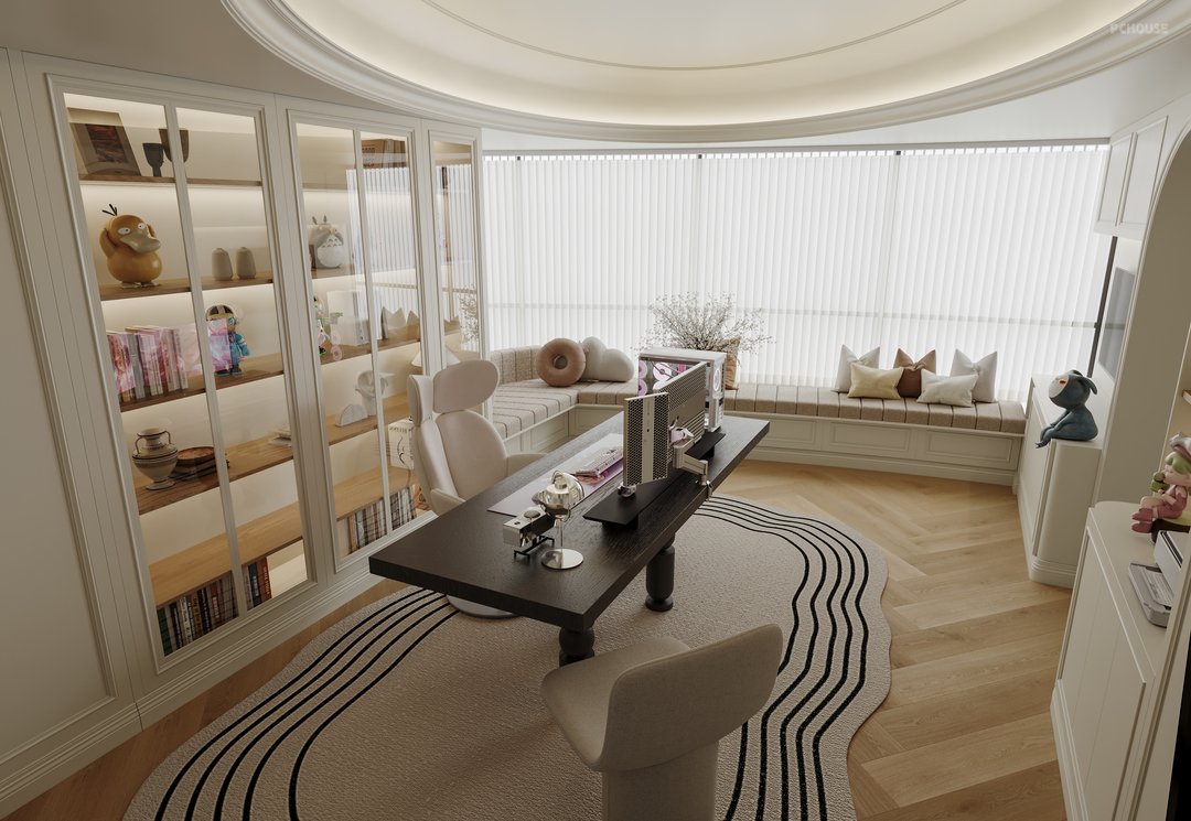 主卧套房是女儿的小世界。设计师将原本占据最佳采光位置的主卫向内挪动,释放空间,并拆除了原来的衣帽间和门厅,将这些区域完全打开,释放的空间则打造了一个工作室。