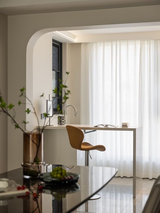 半开放式书房与客厅空间以室内窗的形式衔接在一起,衍生出隔而不断的连贯感,陪伴与私密两种情境可以自由切换,灵活匹配居者需求。