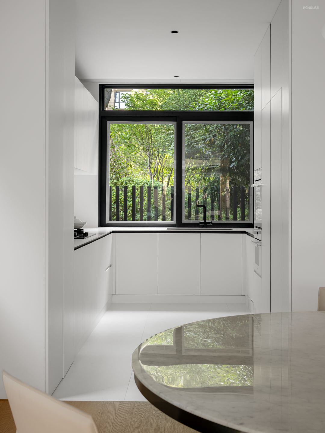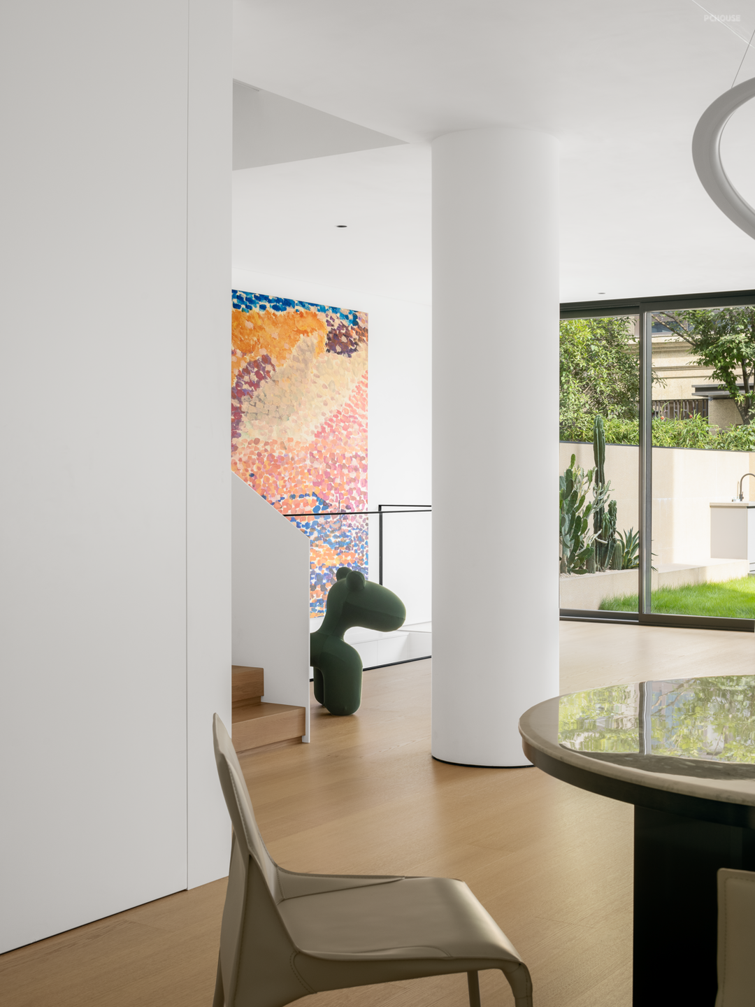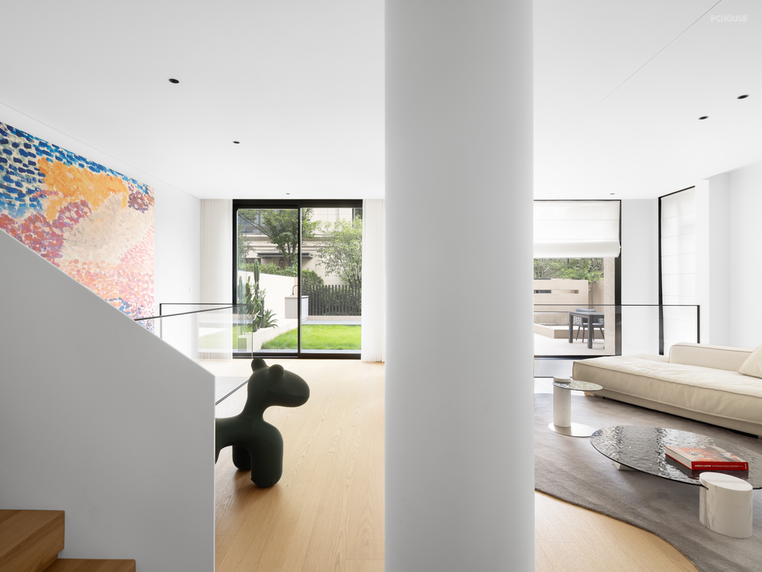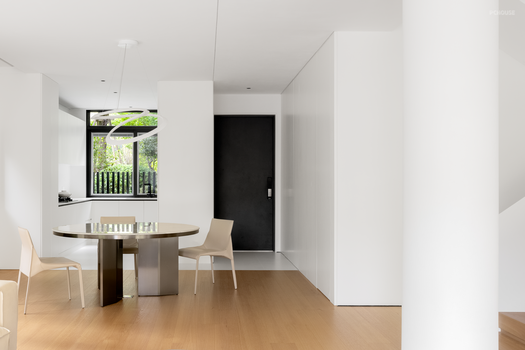 庭院、客厅、餐厨空间,三者组合为一层的公区场景,光线经窗外的植被切割,细碎地投映于内,形成明暗相错的影,美由此而生。