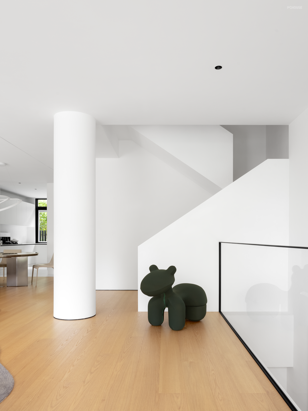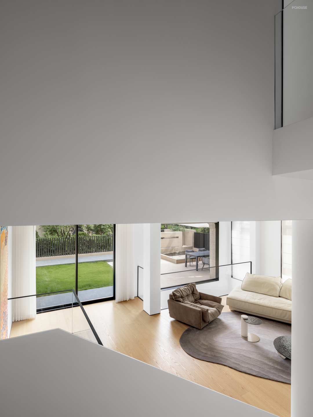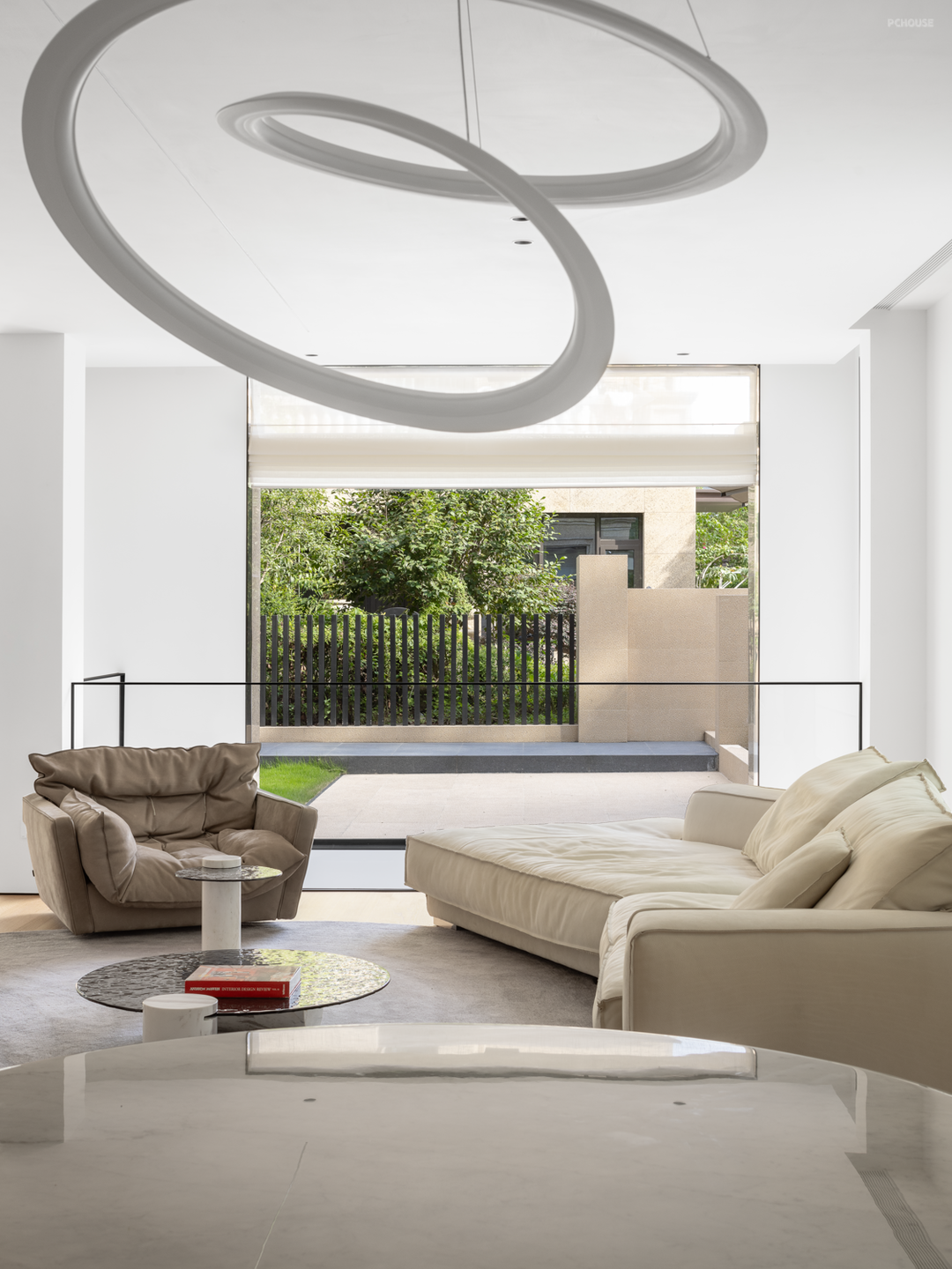 庭院、客厅、餐厨空间,三者组合为一层的公区场景,光线经窗外的植被切割,细碎地投映于内,形成明暗相错的影,美由此而生。