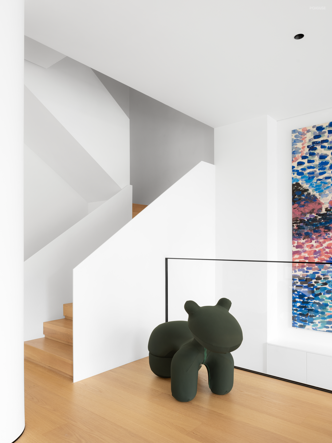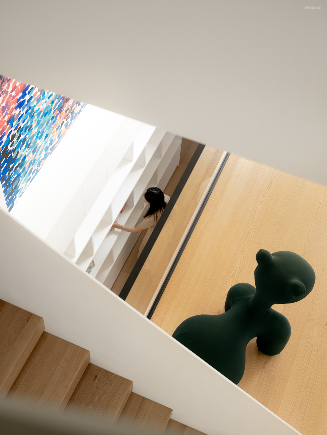 楼梯作为串联场景的所在,不做完全的隔断与遮蔽,在行走的过程中,视线被几何线条切割出明暗相间的块面,而三层的空间关系亦是通过错落的空隙而一览无遗。