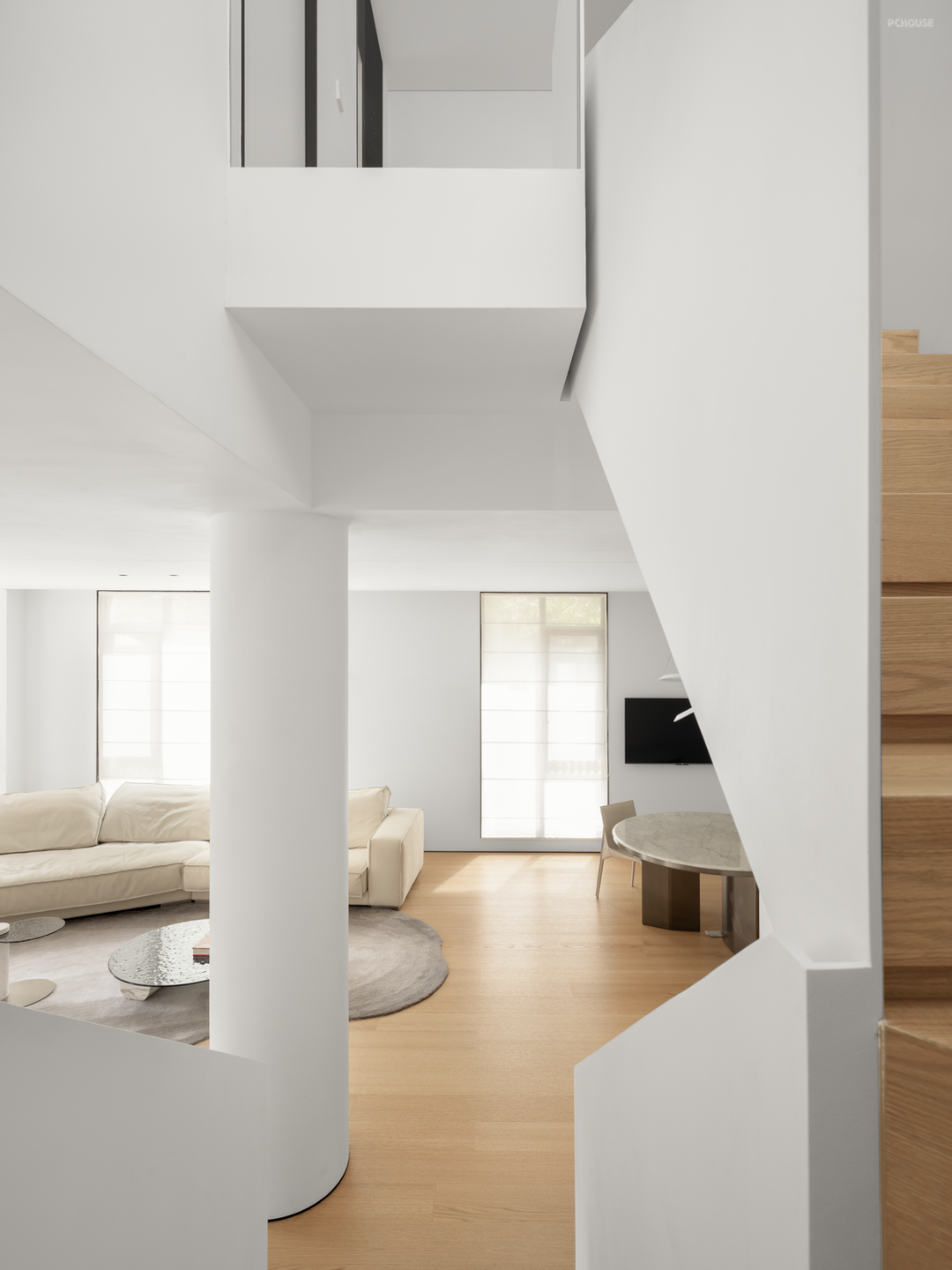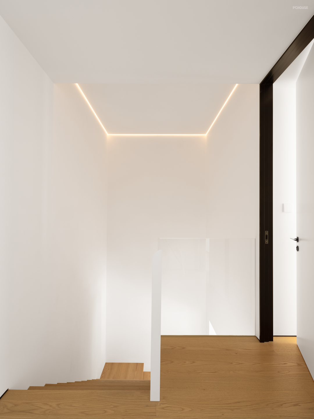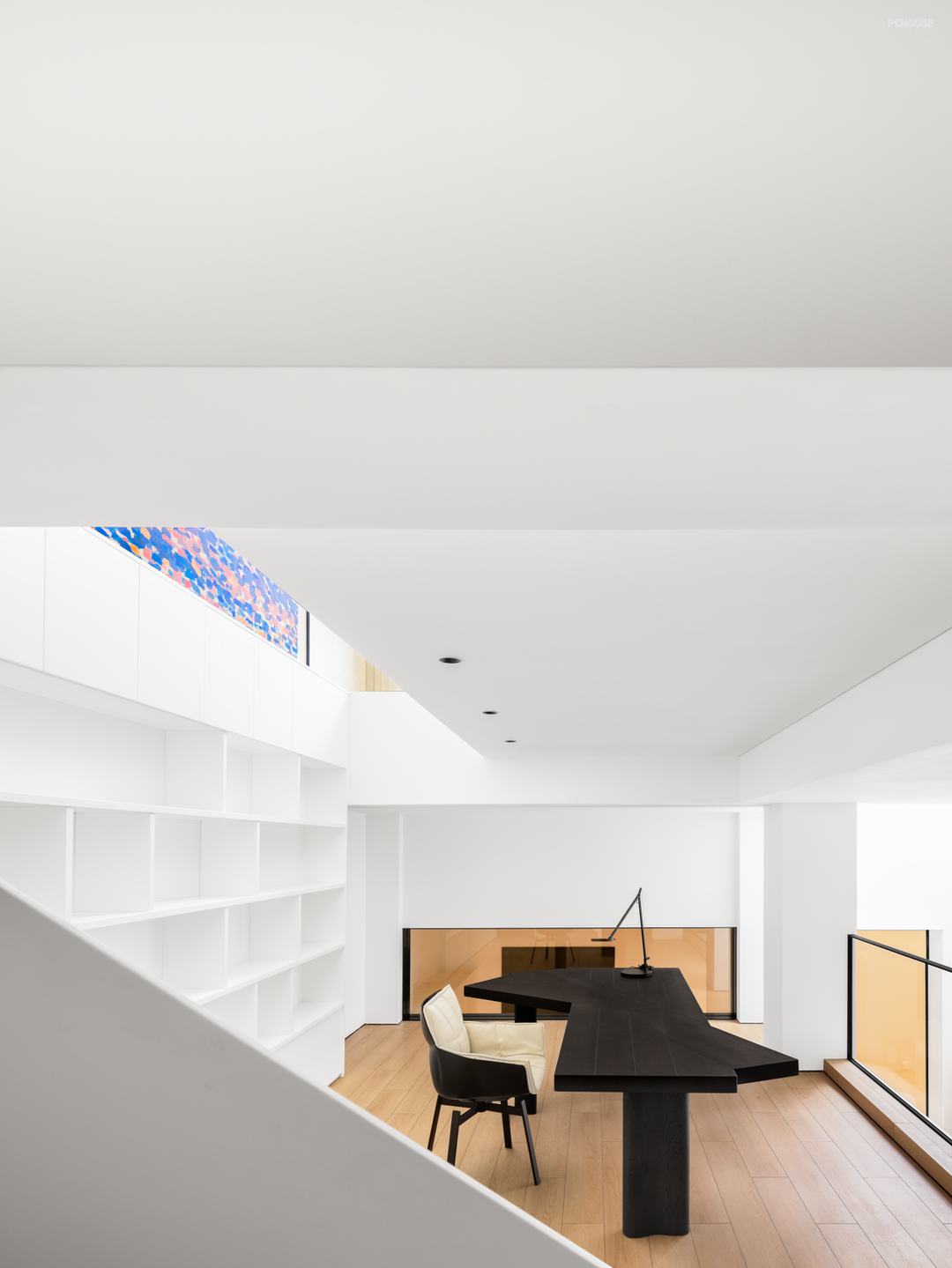 地下空间被一分为二,通过巧妙的盒体搭建,形成两向功能空间,在中空区域隔断出书房场景,书房后方的墙体一路向上延伸至一层,前方与侧面则以玻璃为栏,串联最底部的起居空间,三方场景关系再次通过立体的面得到相互作用的关系,光线被充分利用,一路向下侵入,得到明亮且有张力的地下空间。