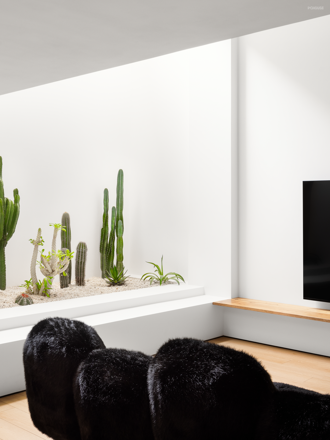 植被置于空间的底部,向光而生,攀而向上,旺盛的生命力得到具象化的展示,一如居所与人的关系,在相互作用下共同成长,生活也被赋予令人欣然向往的感召力。