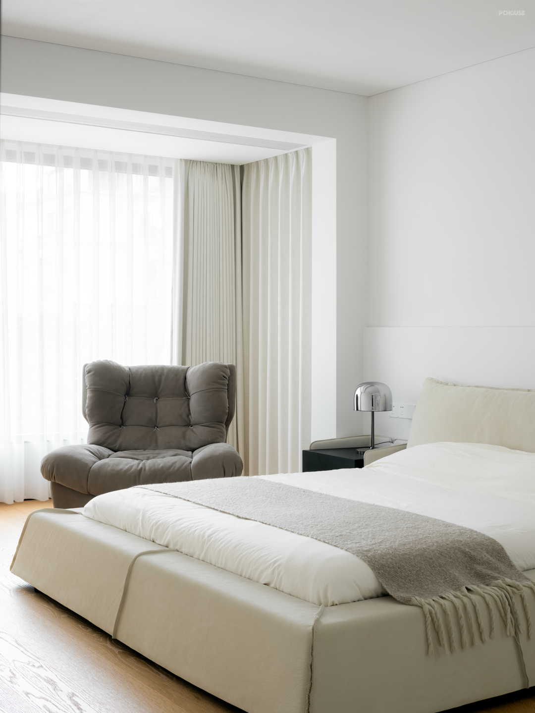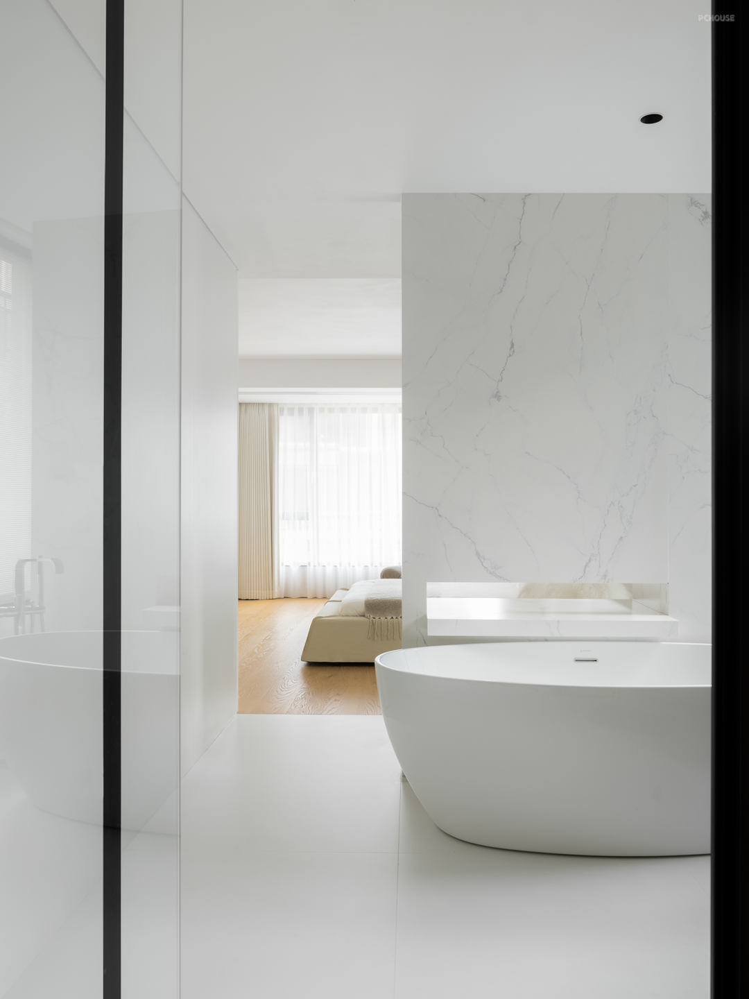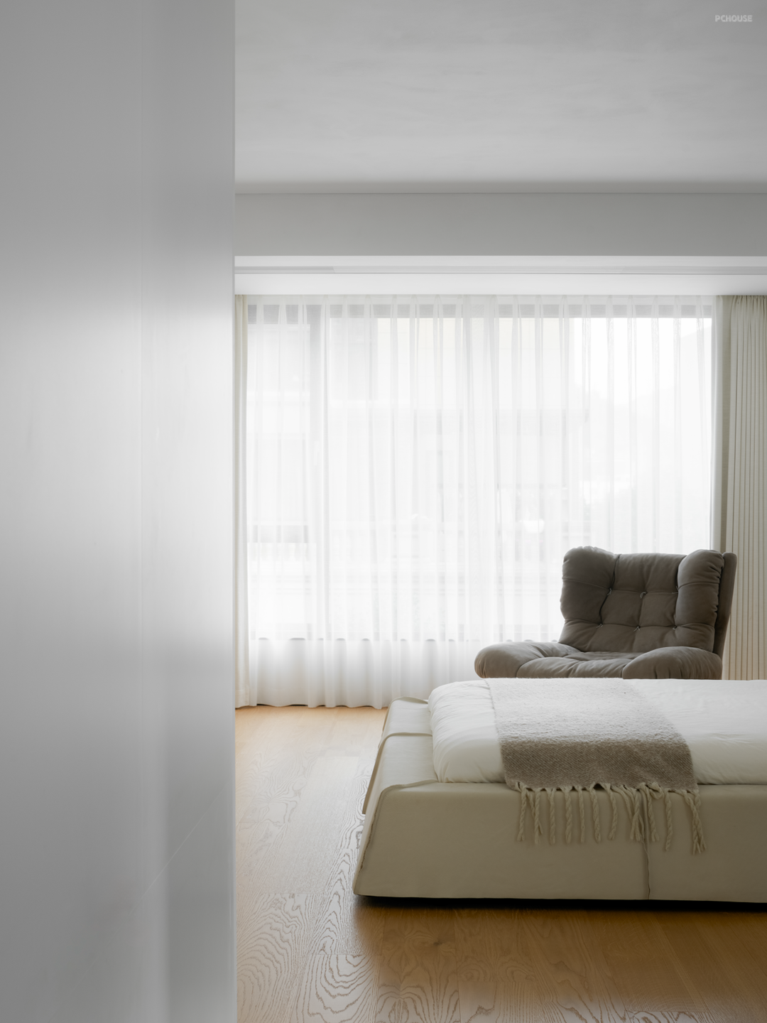 公共空间是多元开放的,而寝居空间则更倾向于构建独立的私密感,将外放的情感内拢,化作如梦境般的纯白,轻纱床幔,影随风动,寥寥无声。