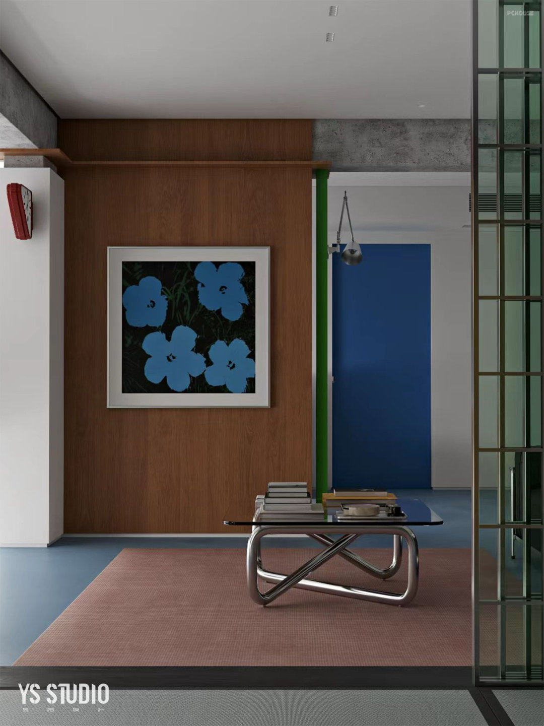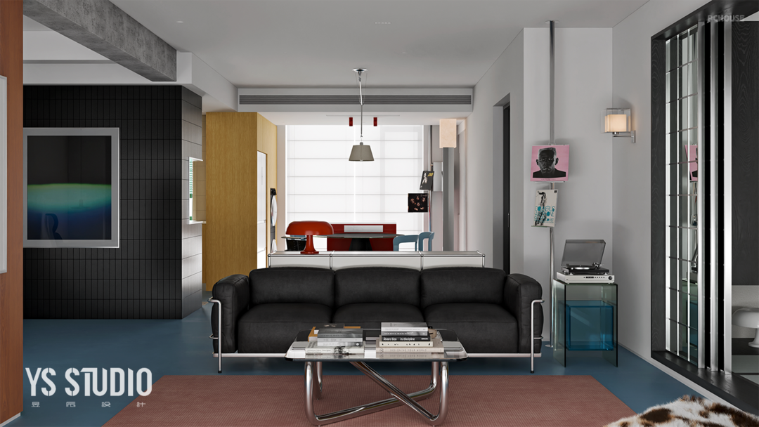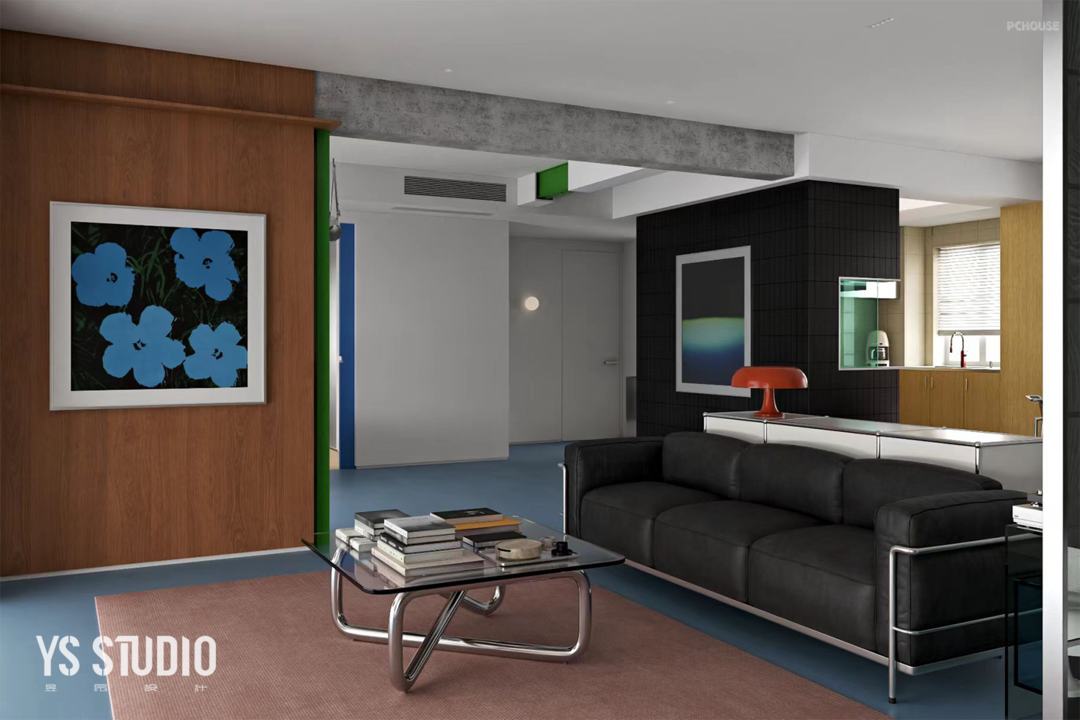 因此,设计的重点在于空间,而非传统的“房间”的概念。空间的构成明亮、丰富,具有一定的视觉表现,使用金属玻璃和不同明度的颜色来划分区域,形成灵活多变的功能空间,各区域既保持独立性也彼此联通,真正映出艺术和生活的融合。其次,以代表性的蓝,与绿、黑、棕形成了整个空间的色彩美学,呈现出独特的对比感,使之逐渐被包豪斯的风格包裹。