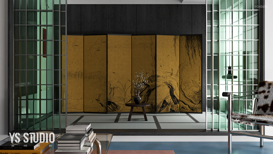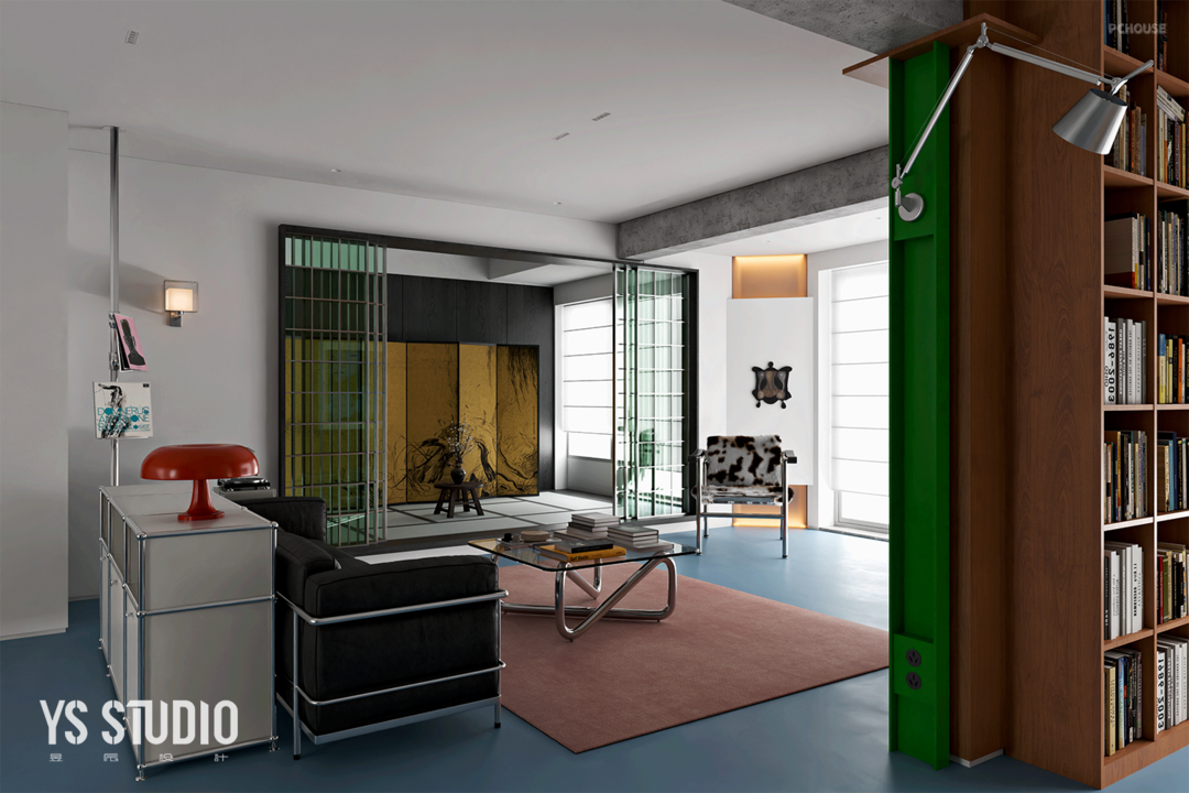 客厅旁边的房间改造成了的日式榻榻米空间,平时可作为装置艺术品的展示空间,必要时也可以当成日式榻榻米使用。六扇滑门灵感来源日式雪见门,但经过改良运用金属做框,绿色玻璃代替樟纸,在包豪斯的风格中融入日式元素,中古的屏风、格框,使两个功能区的过渡毫无违和感,也就此让家打上了属于自己的标签。