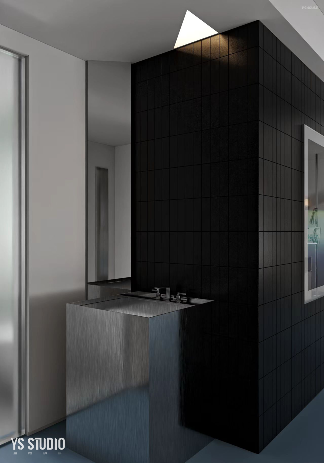 我们将包豪斯珍爱的不锈钢材质用作次卫盥洗盆,结合黑色小砖的背景以及独特的三角形镜面,配上顶面的三角灯膜,将一种严谨的秩序美拉满。当然,这种材质在居所的各种细节中也得以体现。