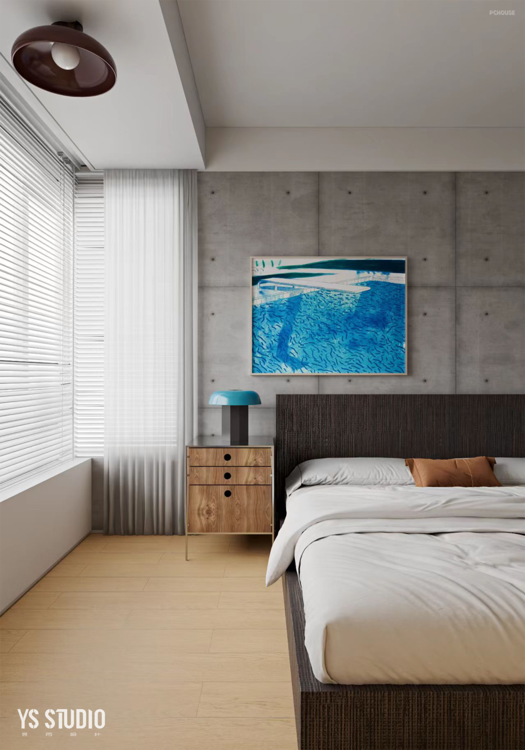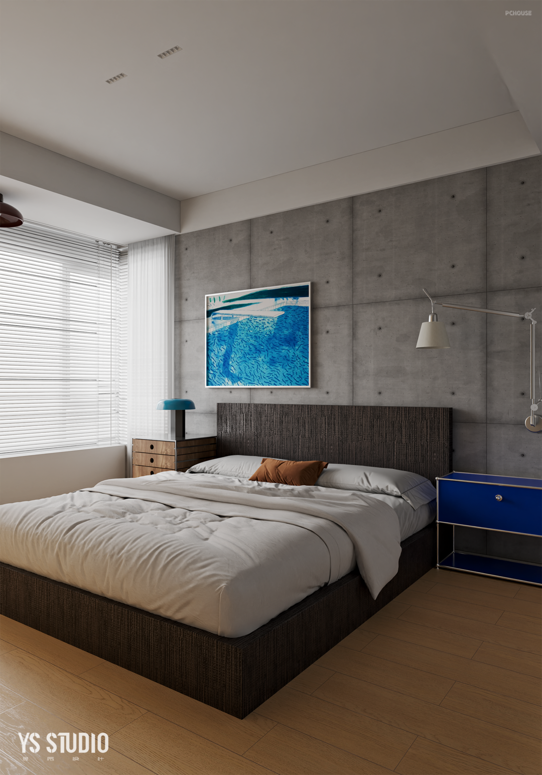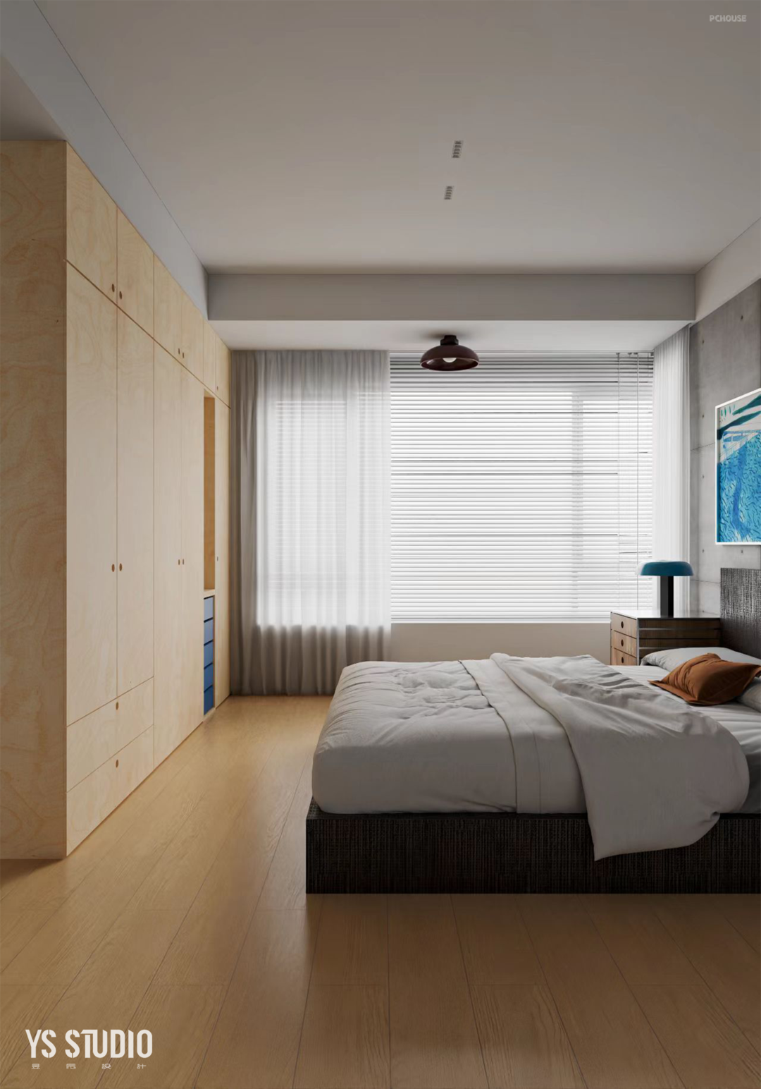 卧室同样以包豪斯风格做基底,和公区的设计表现具有一致性。运用清水混凝土作为背景,以质朴贯通。两个卧室均使用环保的淡黄海洋板本色做柜体,其中用不同程度的蓝色贯通,形成了渐变的抽屉。