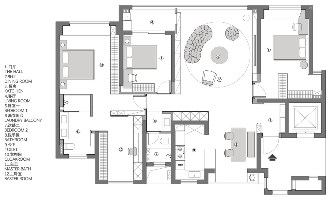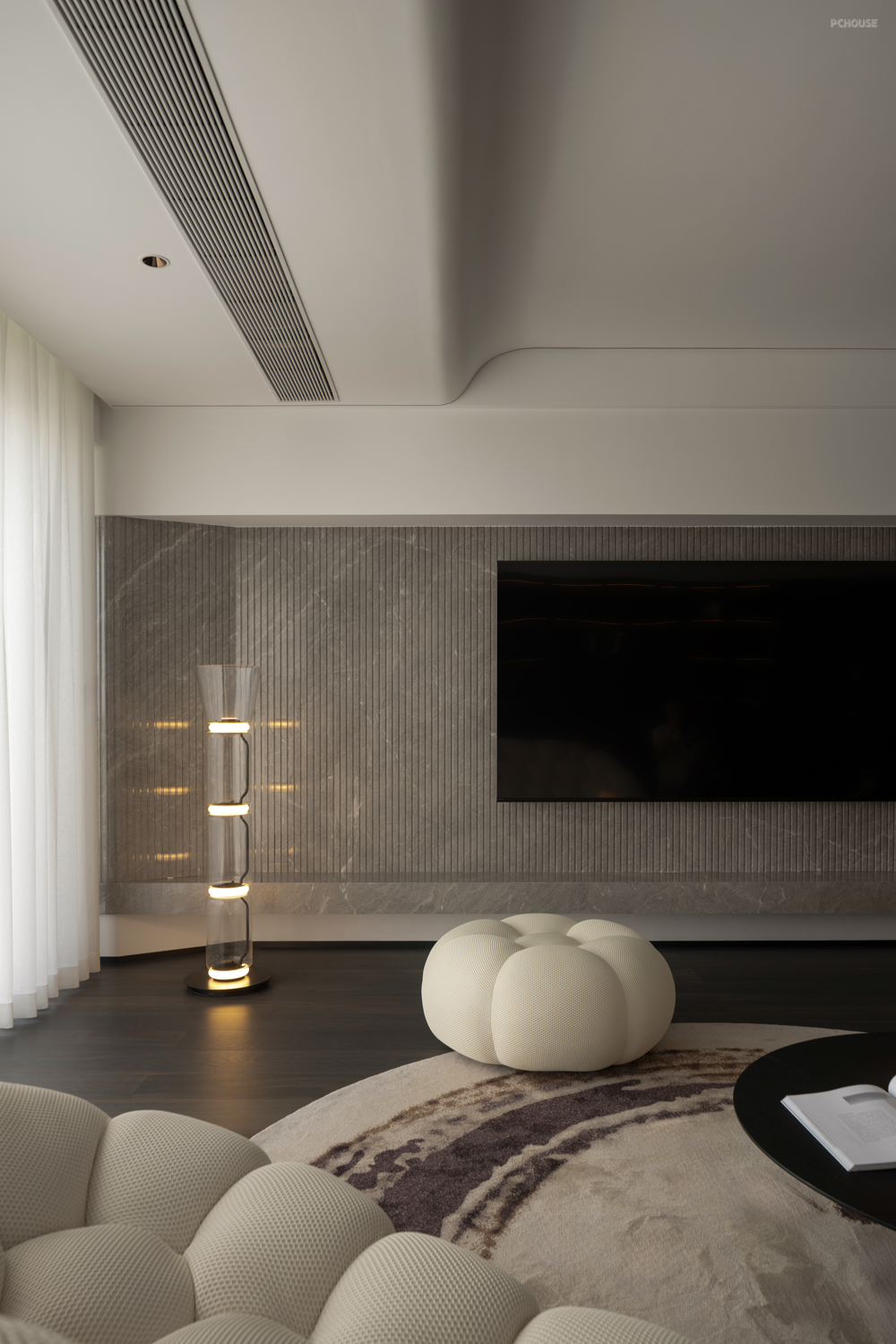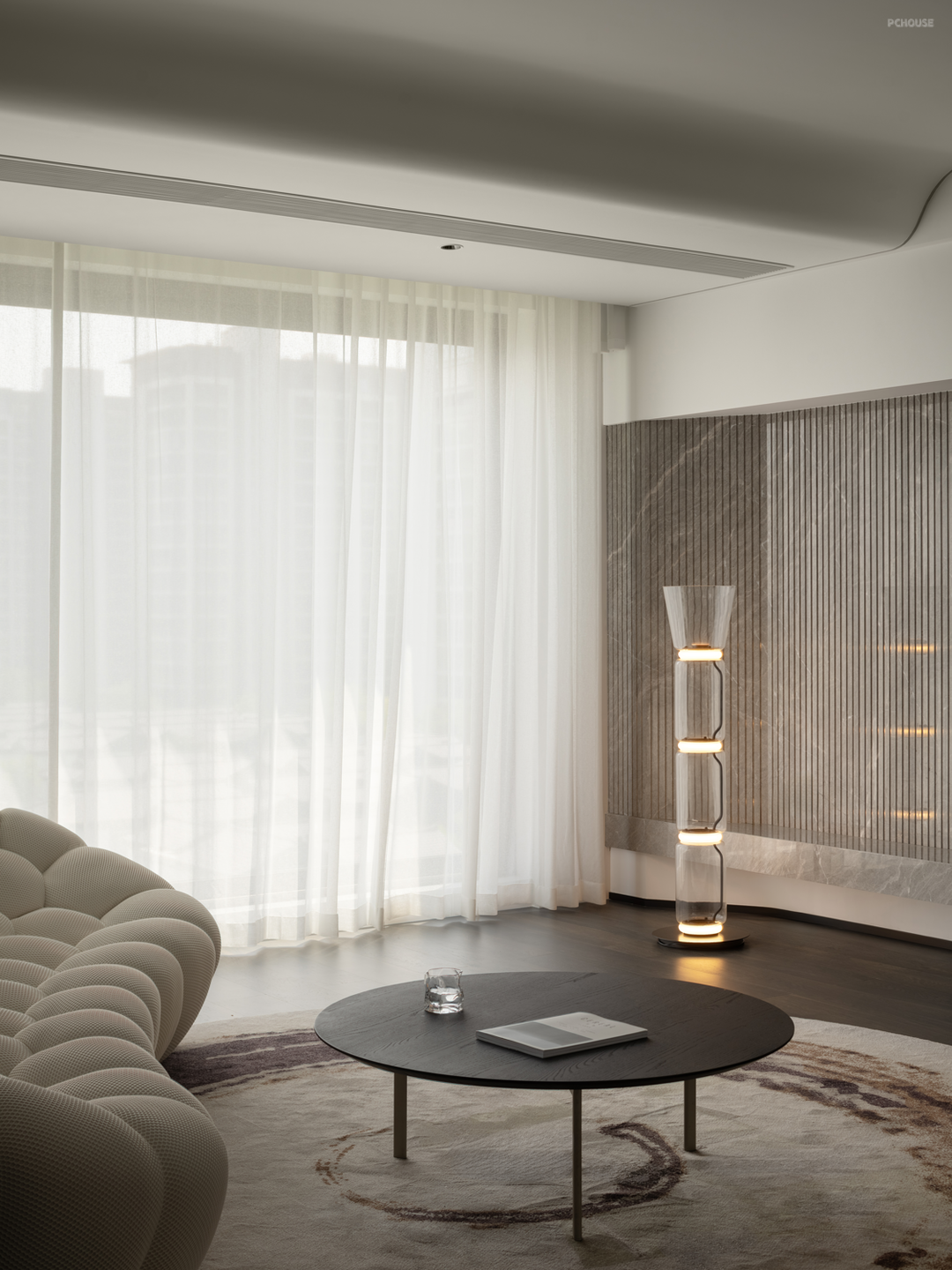 设计通过弧形的线条,以及斜面的处理,带来自然的过渡效果,弱化梁柱的存在感,形成统一开放,明亮宽敞的布局。