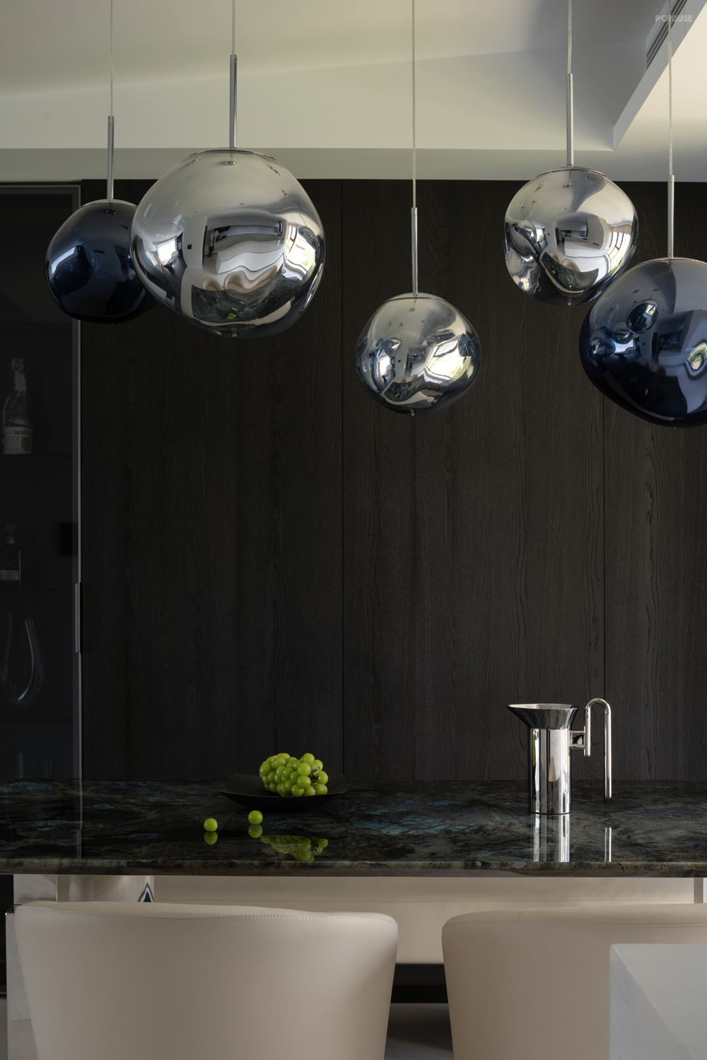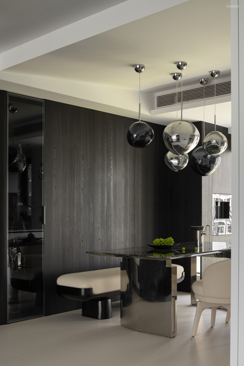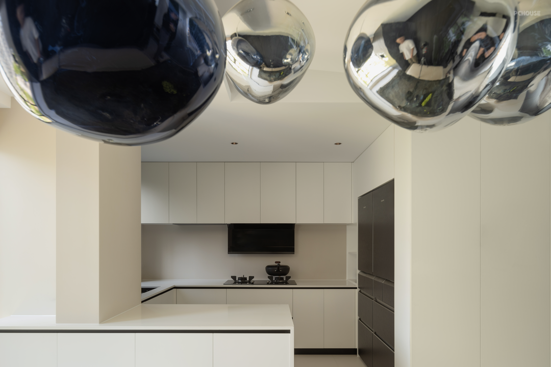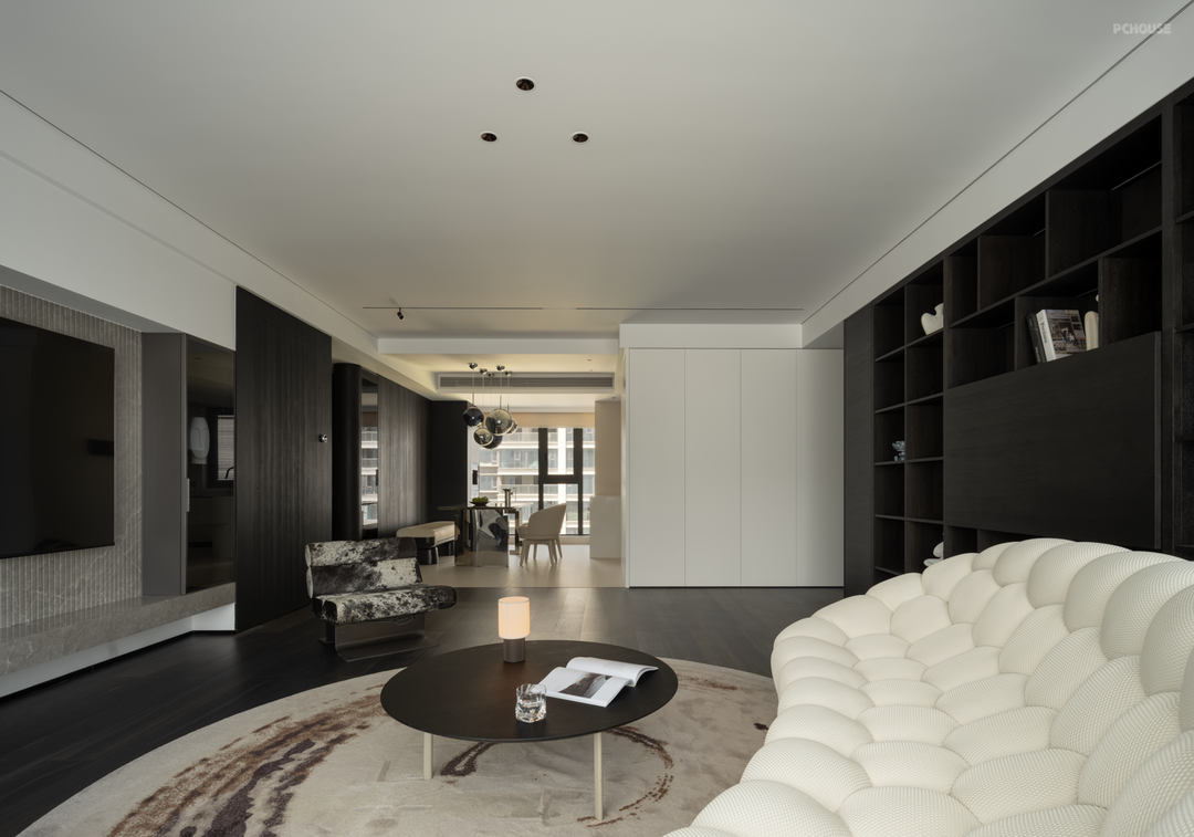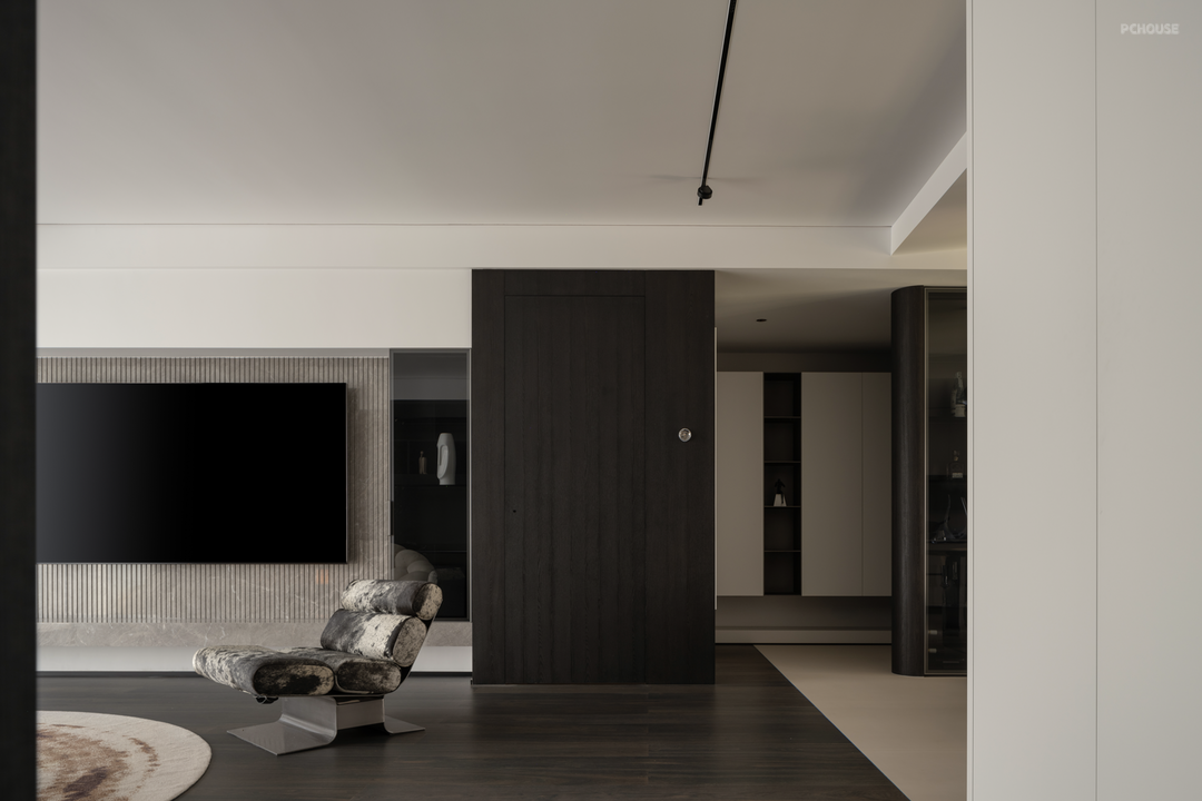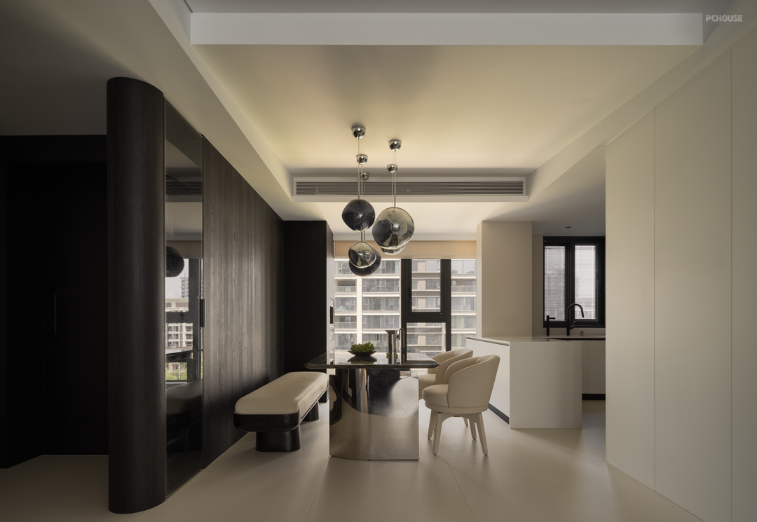 暗色物质压低空间明度,于是外来的自然光源更显充沛。设计师希望打造明亮富有质感的生活情景,同时尊重业主对暗色场域的喜好,揉合明与暗间的调和比例,打造一个年轻自由且具有思考深度的感性空间。