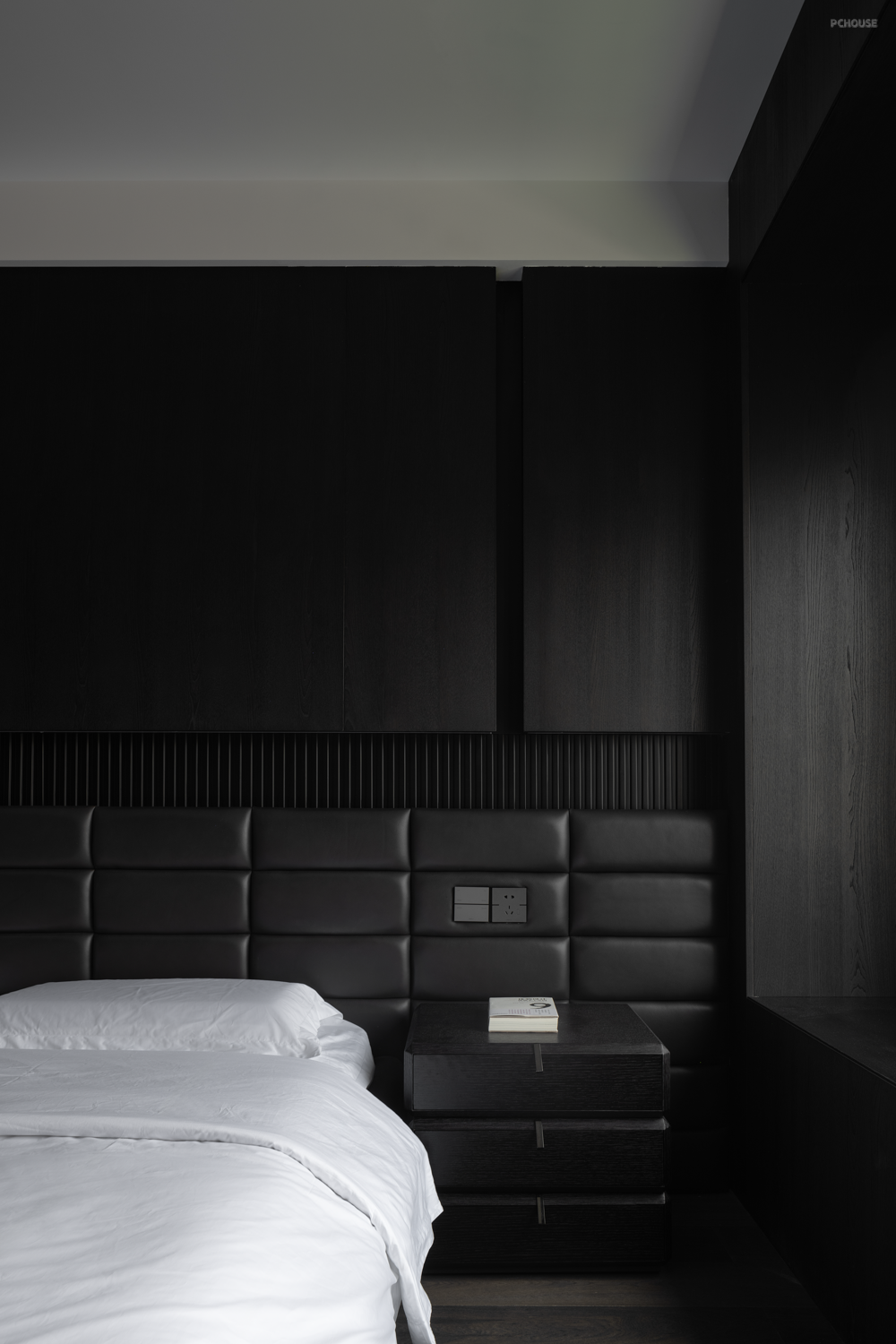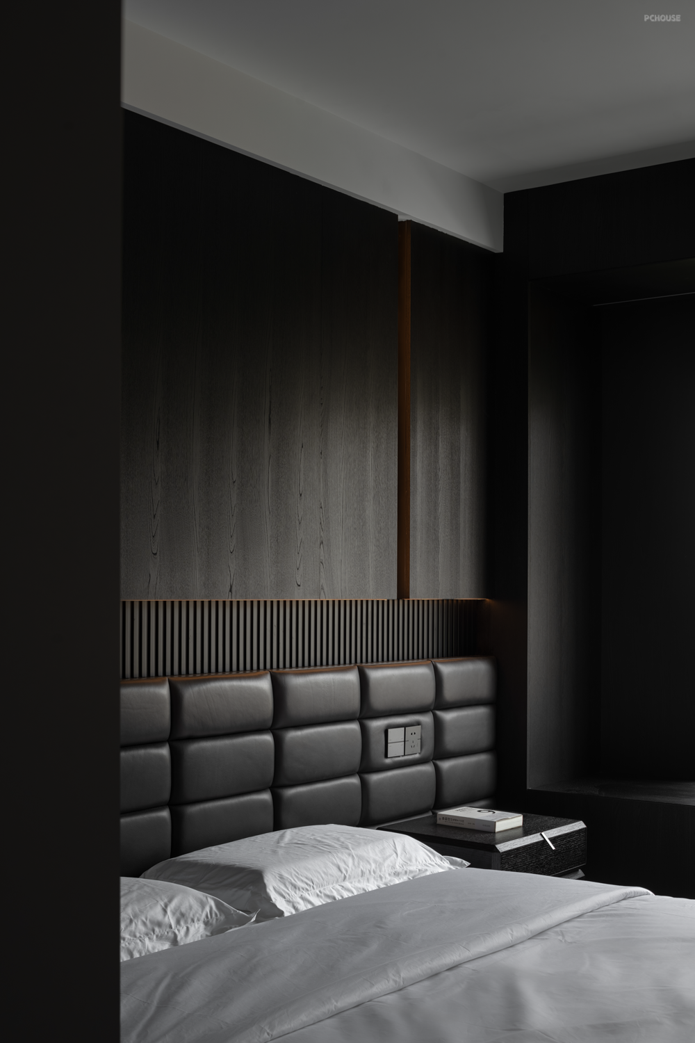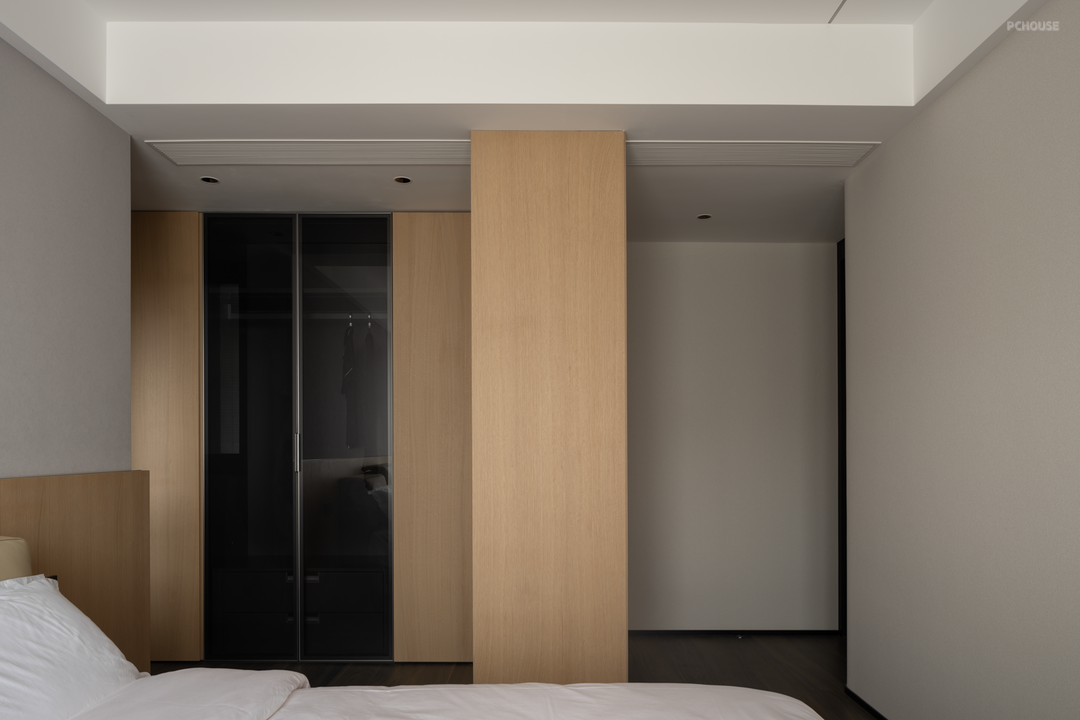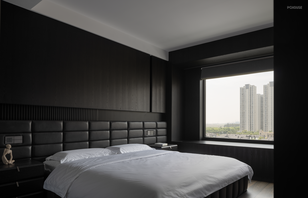 设计,是让世界更接近我们的梦想。来到家装空间,设计师希望能够在实用性的选择之余,尽可能贴近业主的心中所想,于是在最具个人倾向的主卧空间使用大量的暗色元素,并减少不必要的装饰,只通过材质间肌理质感的不同作为层次的区分。
