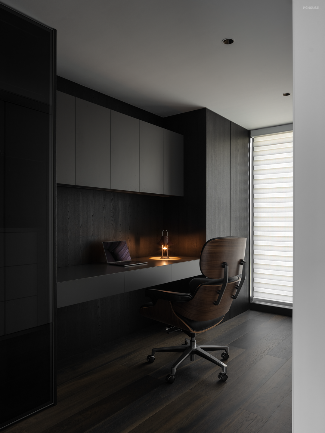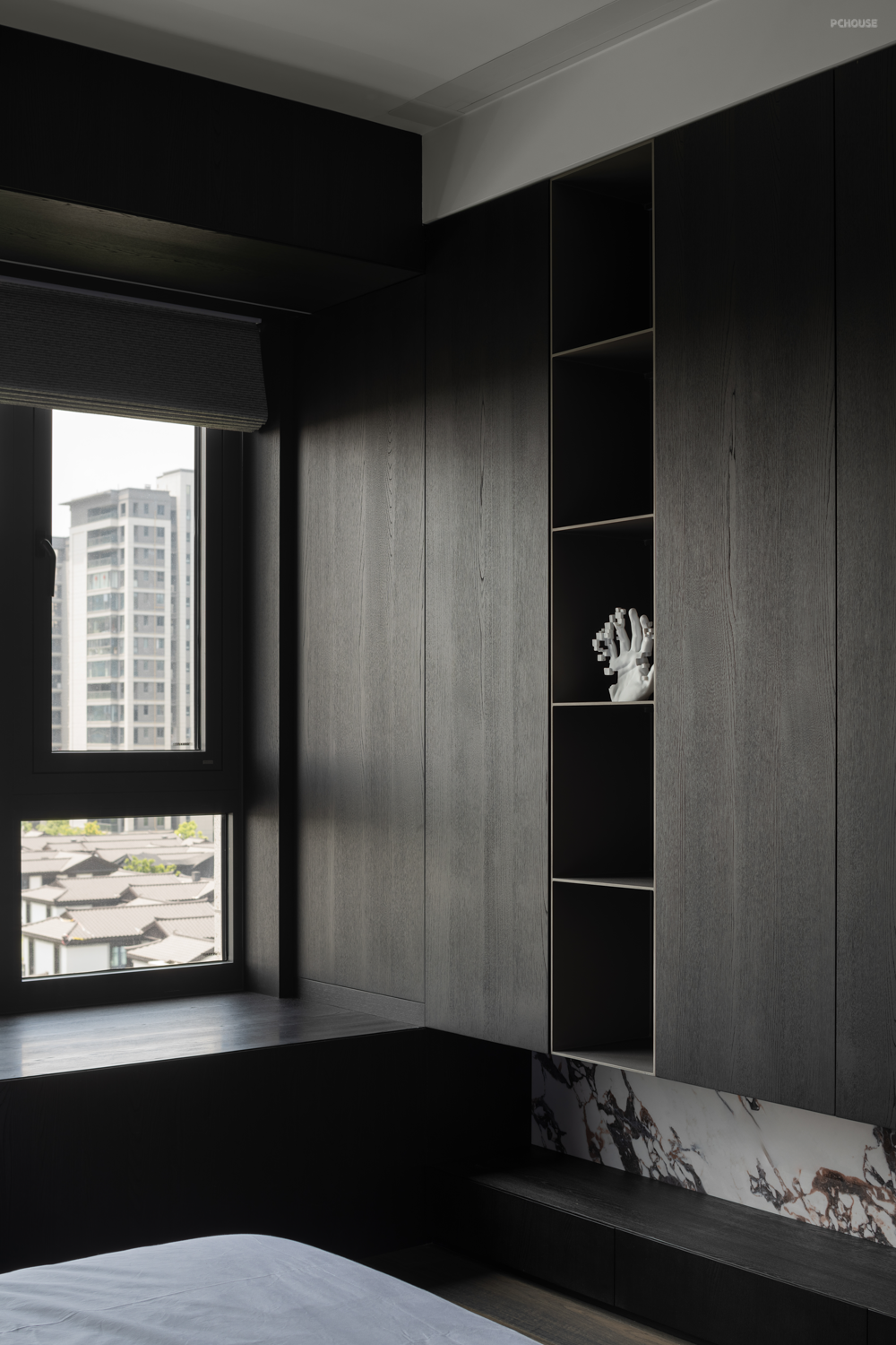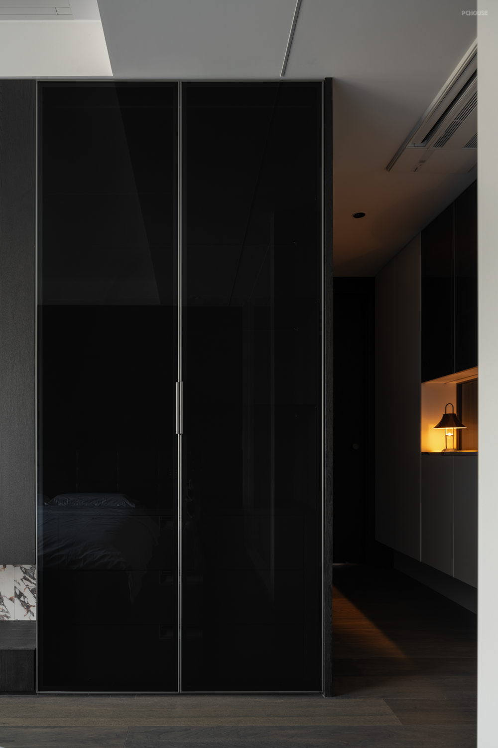 设计,是让世界更接近我们的梦想。来到家装空间,设计师希望能够在实用性的选择之余,尽可能贴近业主的心中所想,于是在最具个人倾向的主卧空间使用大量的暗色元素,并减少不必要的装饰,只通过材质间肌理质感的不同作为层次的区分。