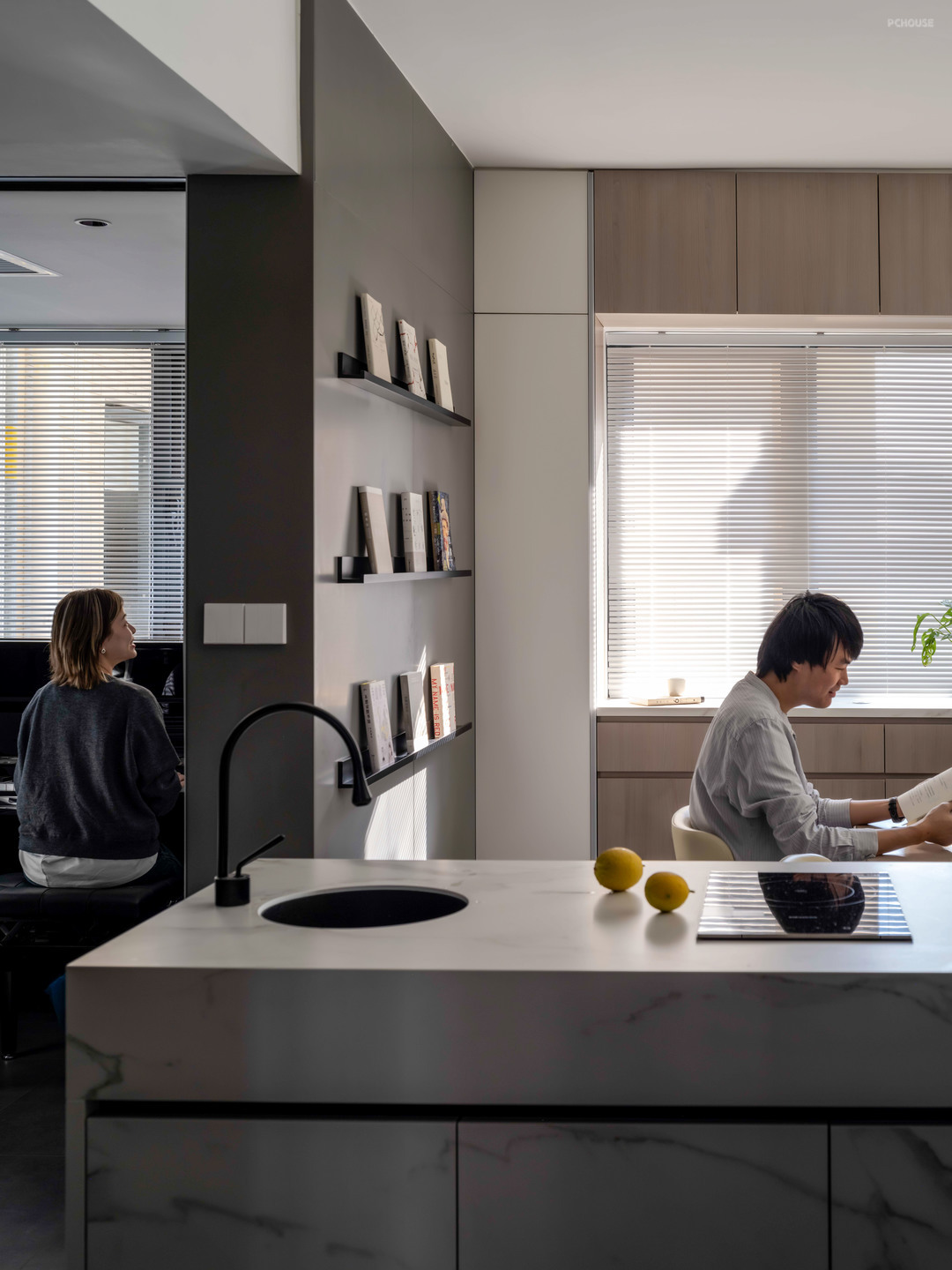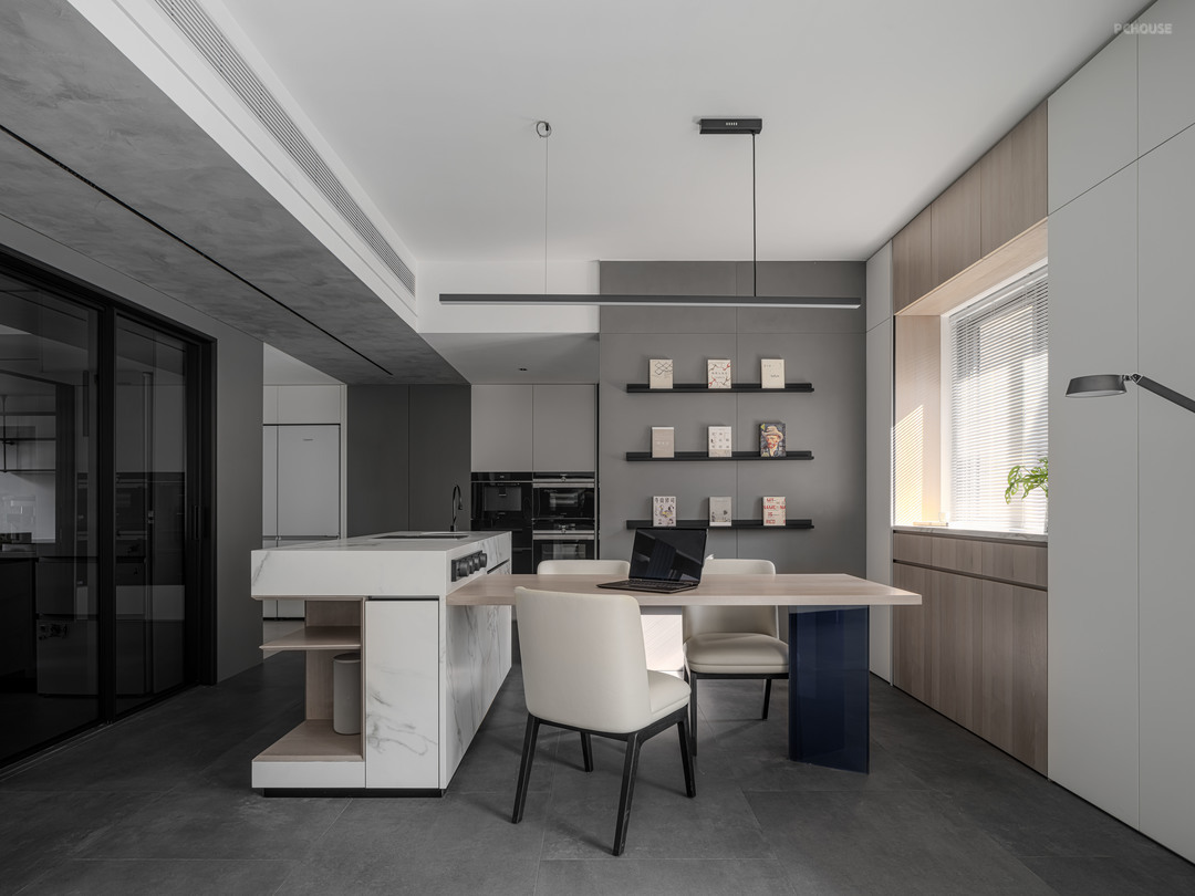 超大的岛台与餐桌合并一体,让餐厅的功能性变得不那么单一,可以是餐厅,也可以是阅读空间,临时办公区