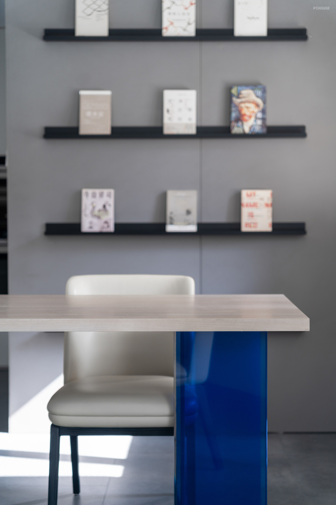 在整体灰调的空间中,克莱因蓝的点缀色便格外突出,实际所使用的面积区域并不大。