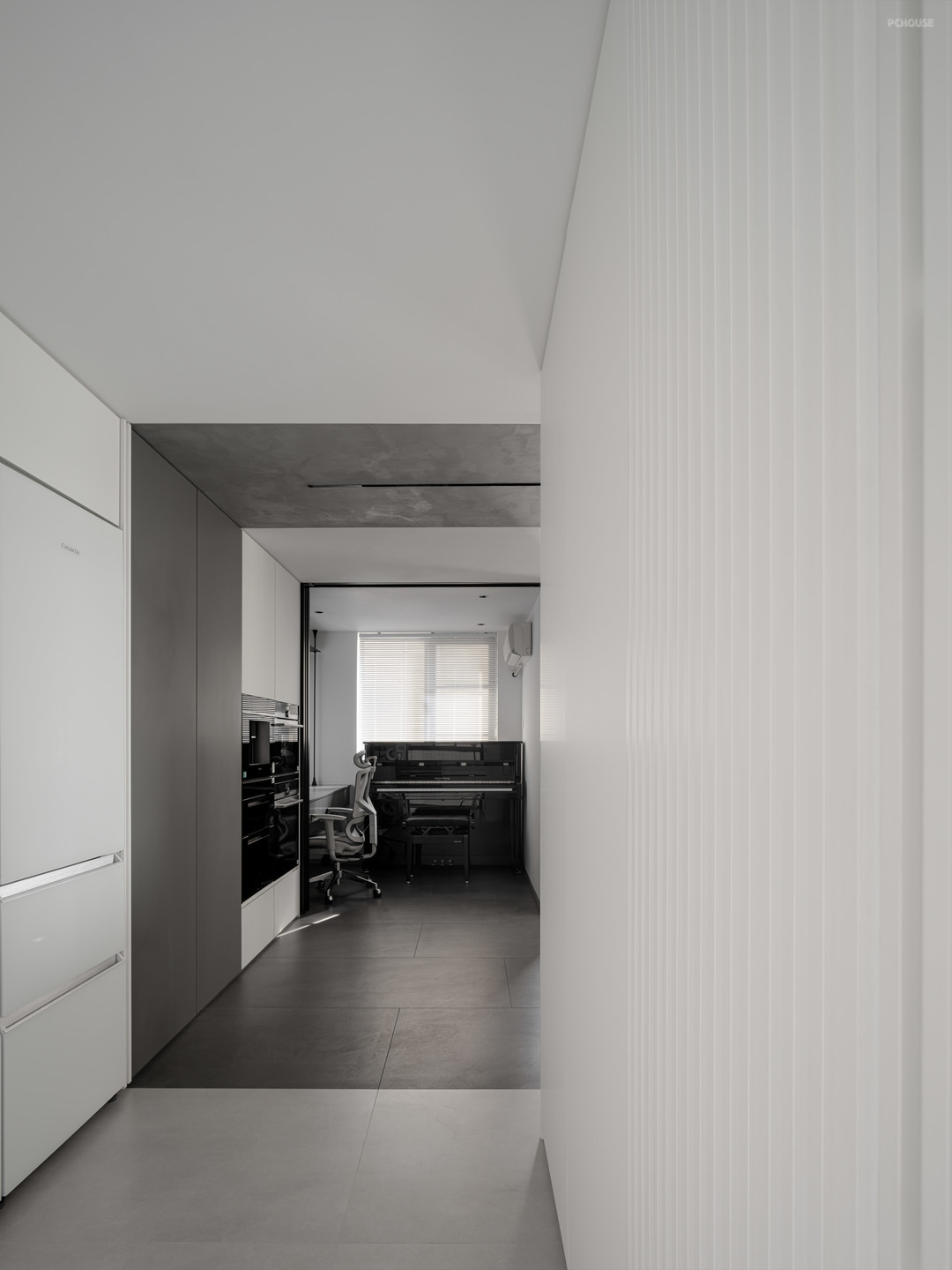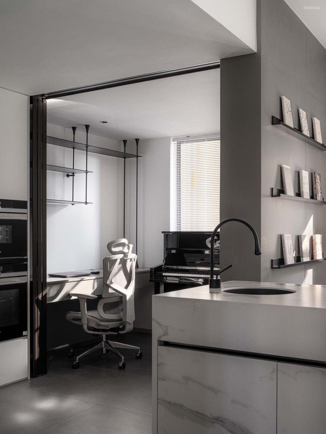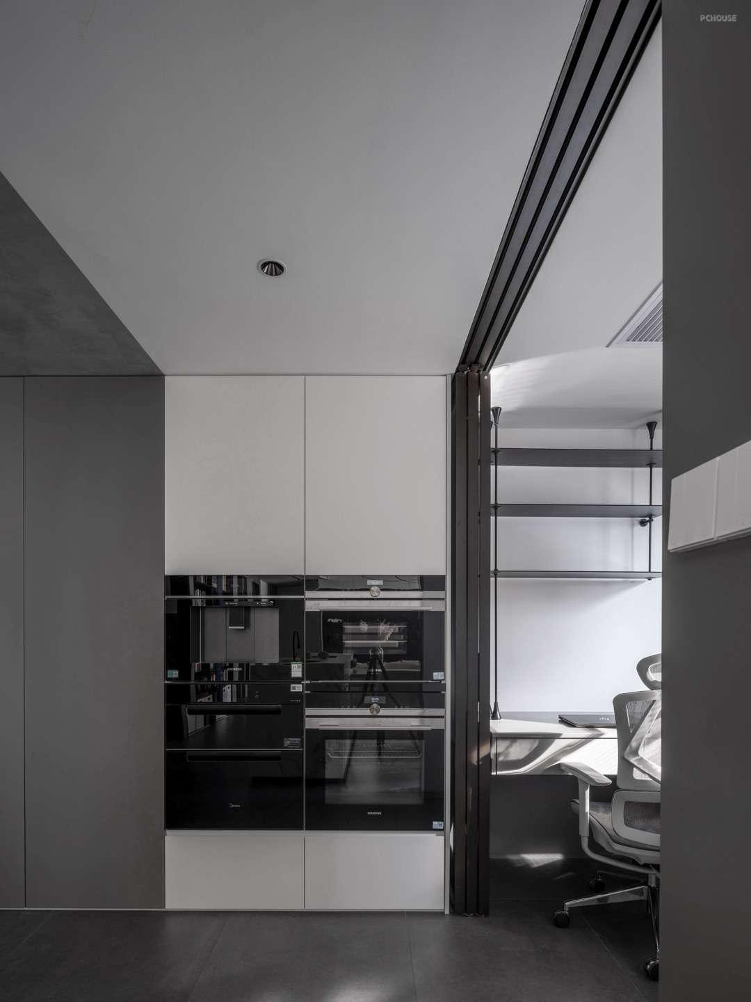 侧面看过去书房,可以直接看到收纳在柜体之间的推拉门与轨道,两条深灰色的线条正好将过道的电器收纳柜凸显出来。书房内部则采用简洁设计,固定墙上收纳的桌子与抽屉组合满足基础的实用性,搭配上柜金属支架提升空间内的轻盈感。