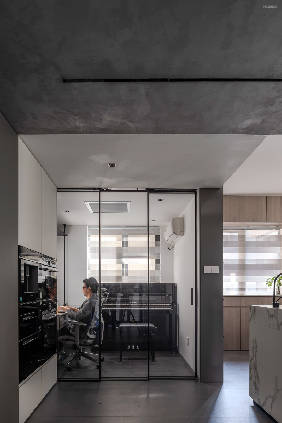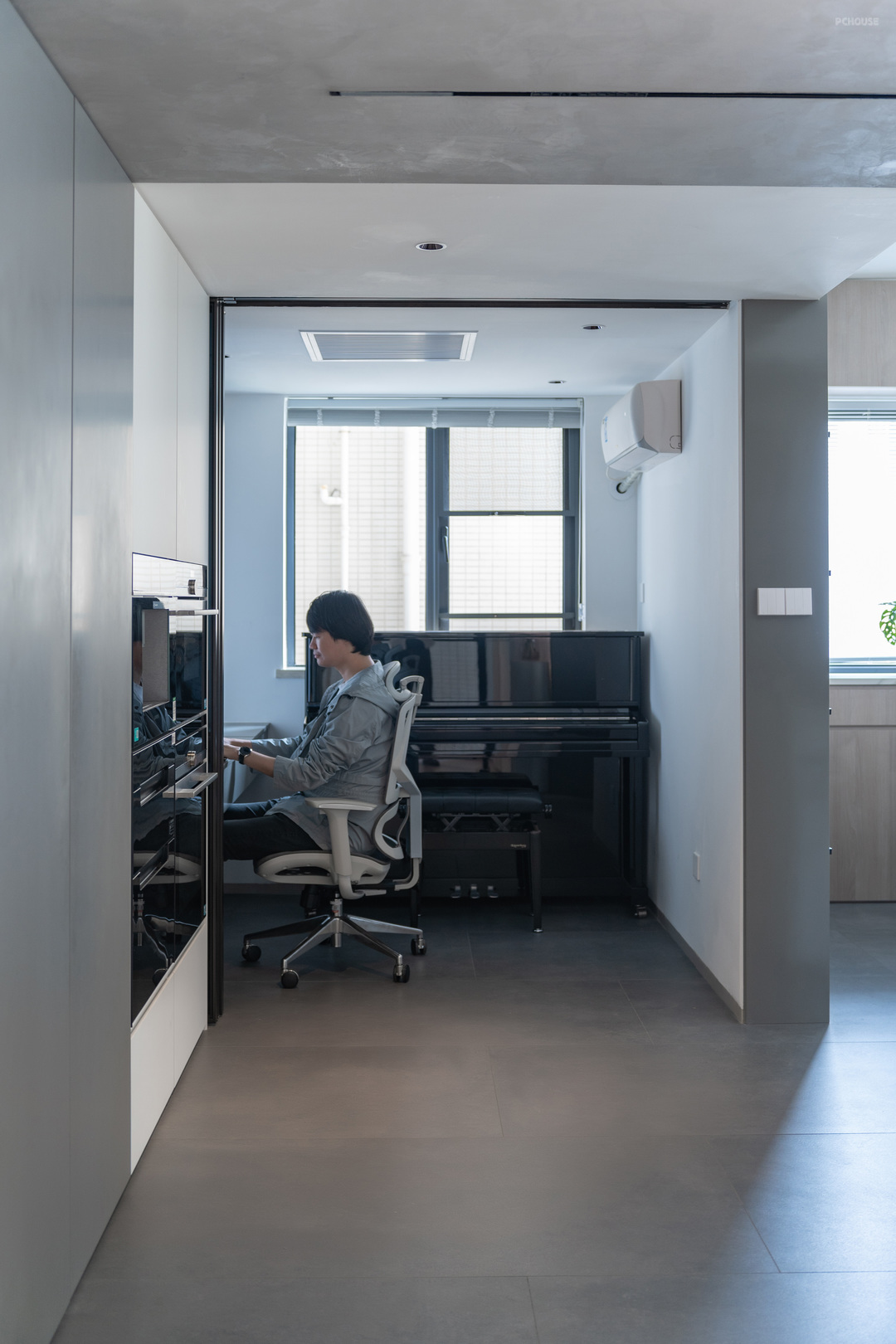 未来这个房间主要承担小孩练习钢琴,和写作业的职责。拉上玻璃门之后也可以起到一定的隔音性。