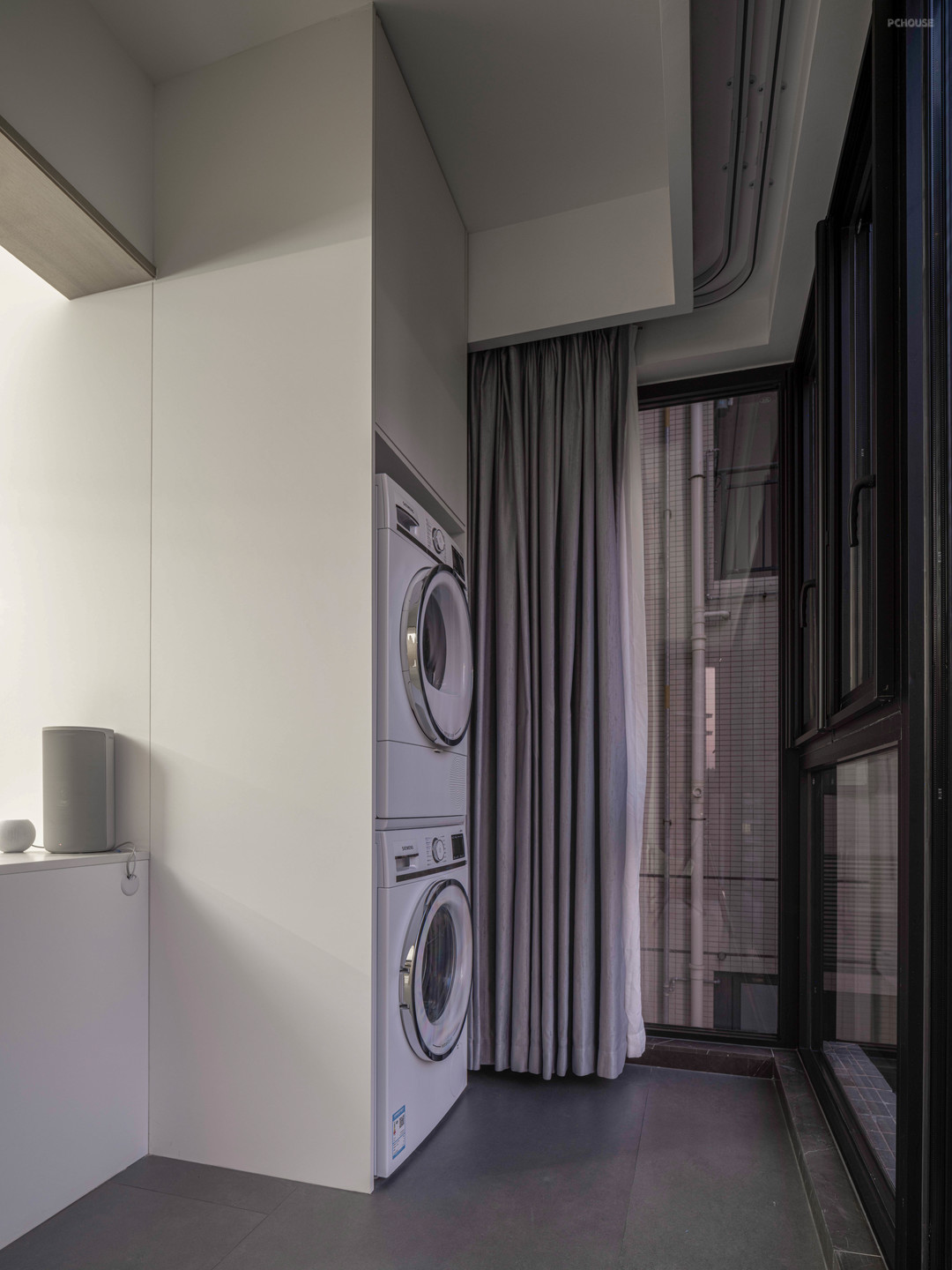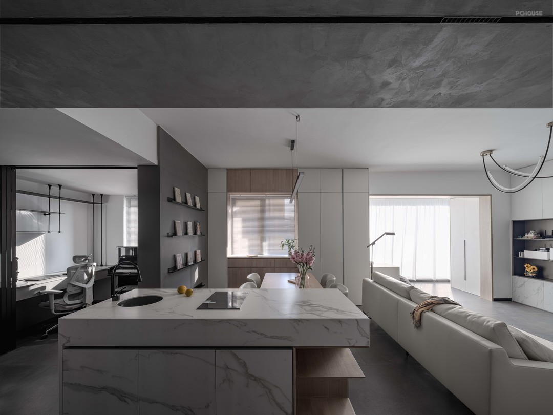 A:灵感来源与屋主的交谈,了解到他们平时的工作中大部分时间都是白色的工作空间,所以想着换一个灰调空间来平和每天面对环境的观感。