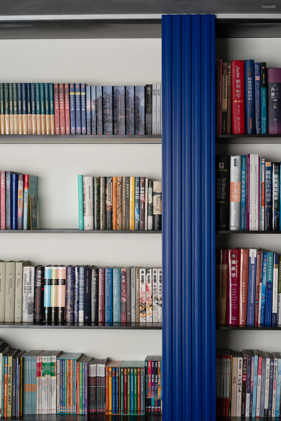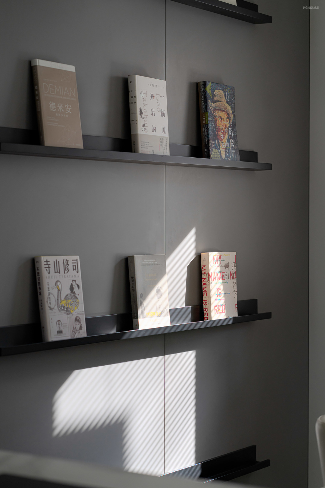 书架的挡板可以随意滑动,方便定位最近正在阅读的书籍位置,也给固定的墙面带来一丝趣味