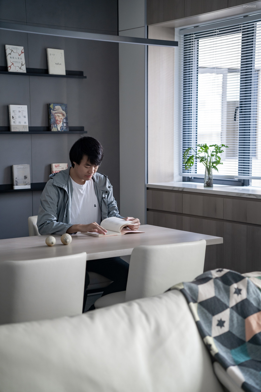 餐桌的背后设置杂志架,除了安放一些最近正在阅读的书籍,方便拿取之外,也提升整体的居家阅读氛围