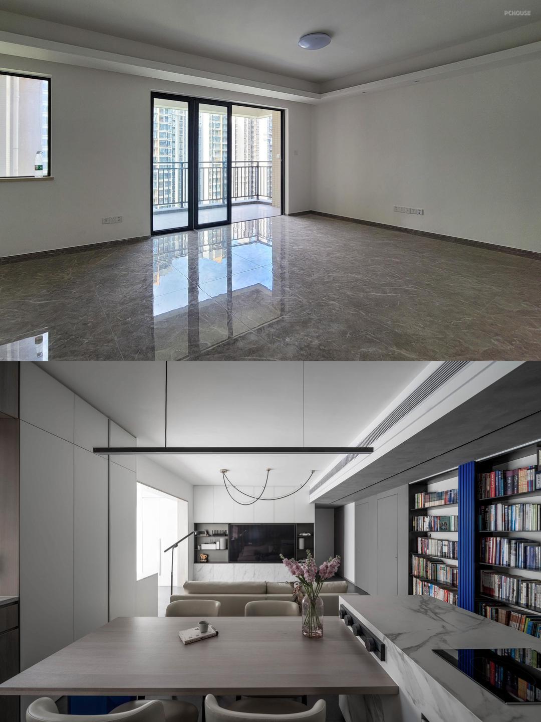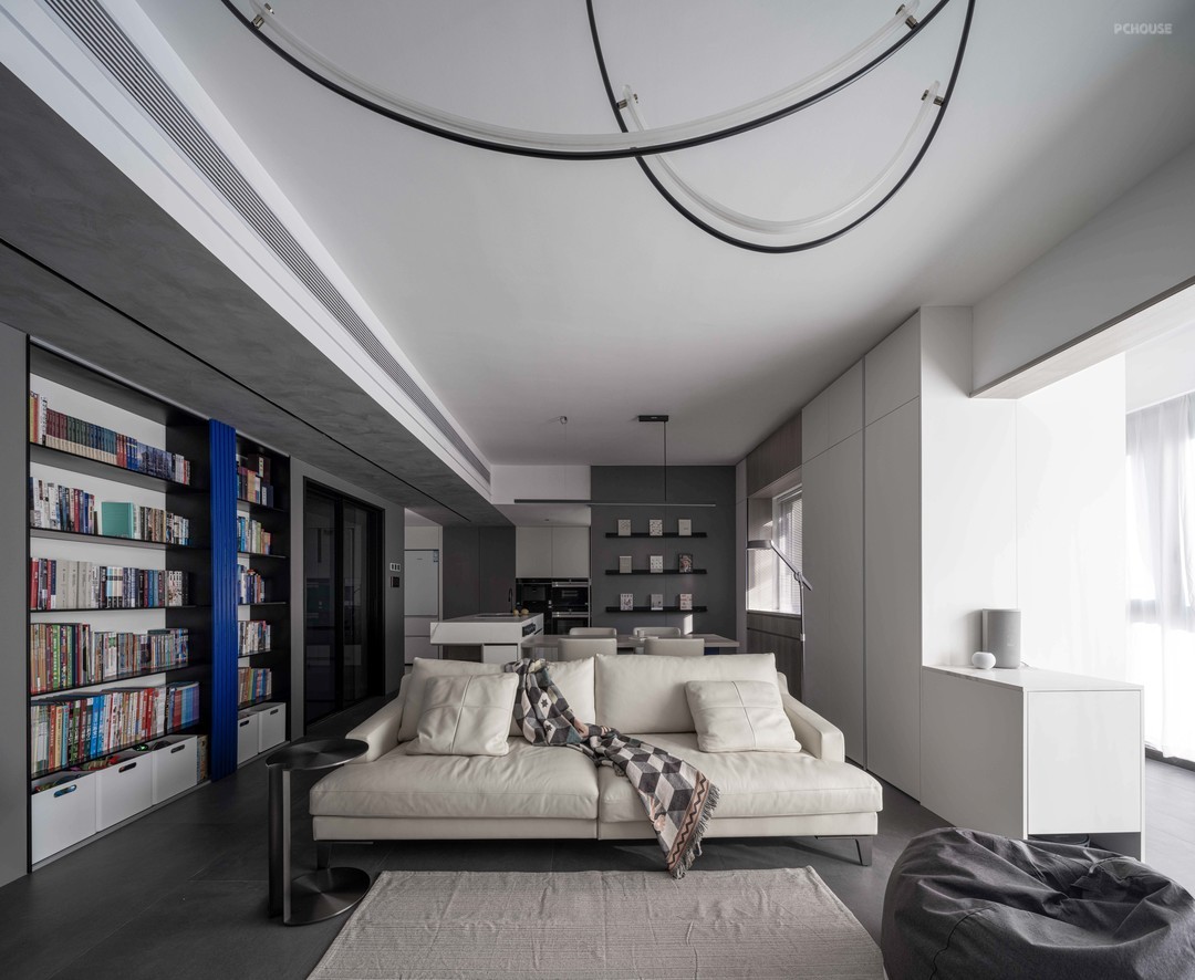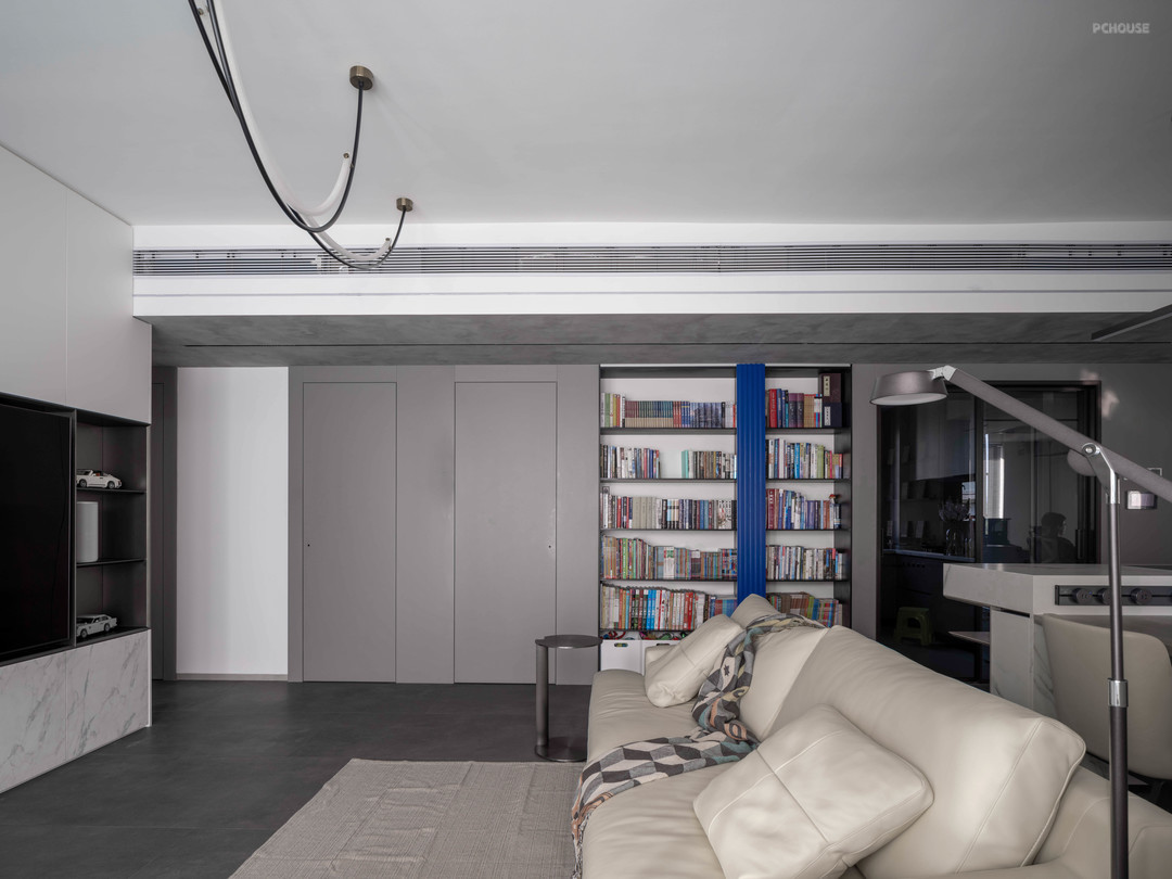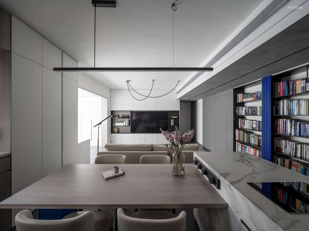 餐桌下方的粹色玻璃桌腿,以及客厅侧面的书架挡板,两个区域的点缀就足够传达“纯净、静谧”的空间情绪