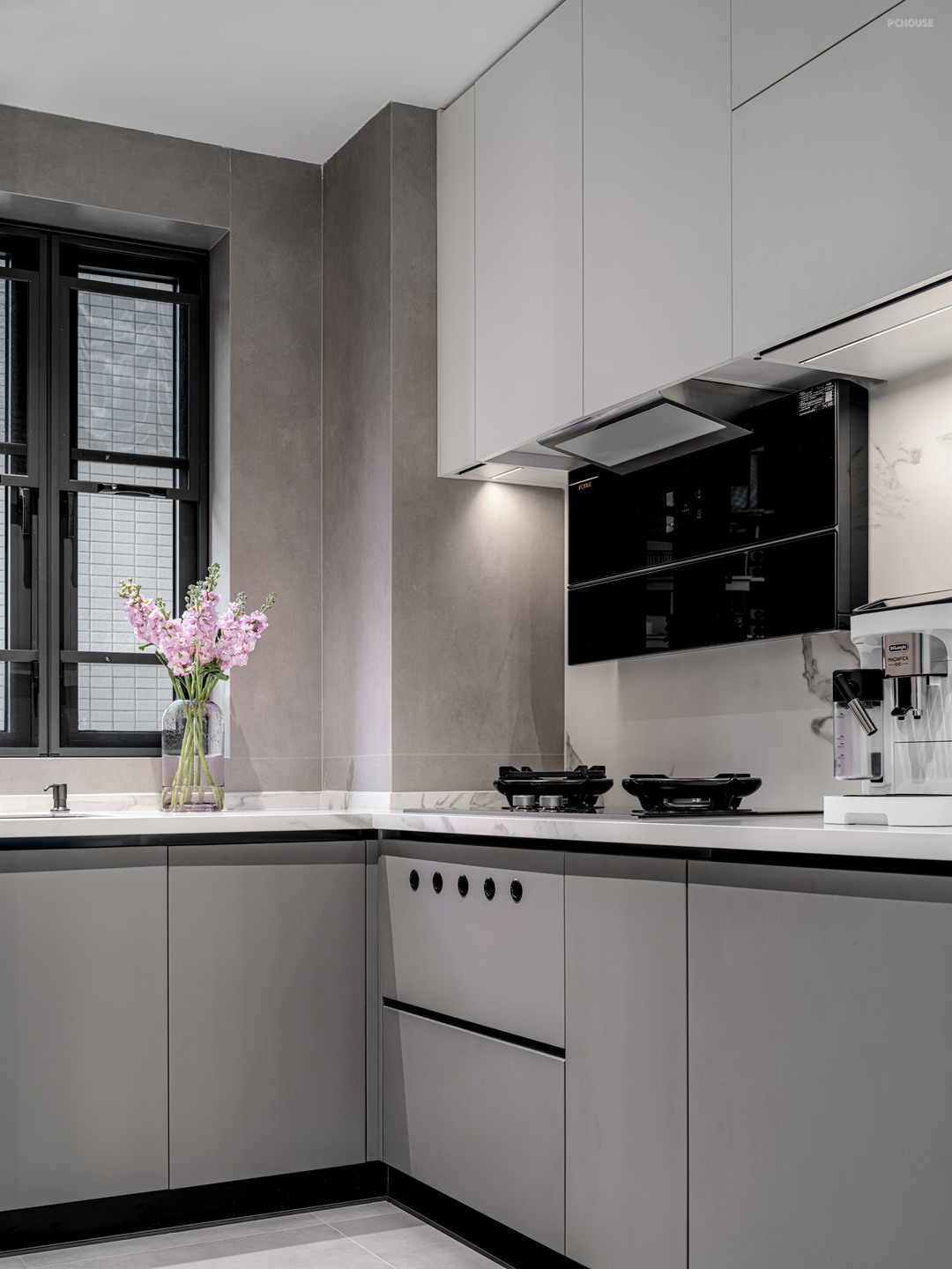 将厨房的大件物品,冰箱、烤箱、蒸箱、微波炉、净饮机全部移动到开放公区。厨房内部的空间就解放了出来,形成标准的L形厨房