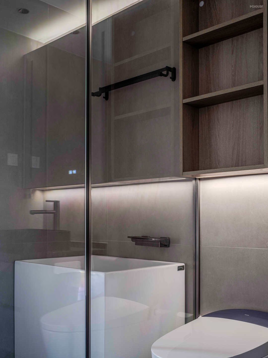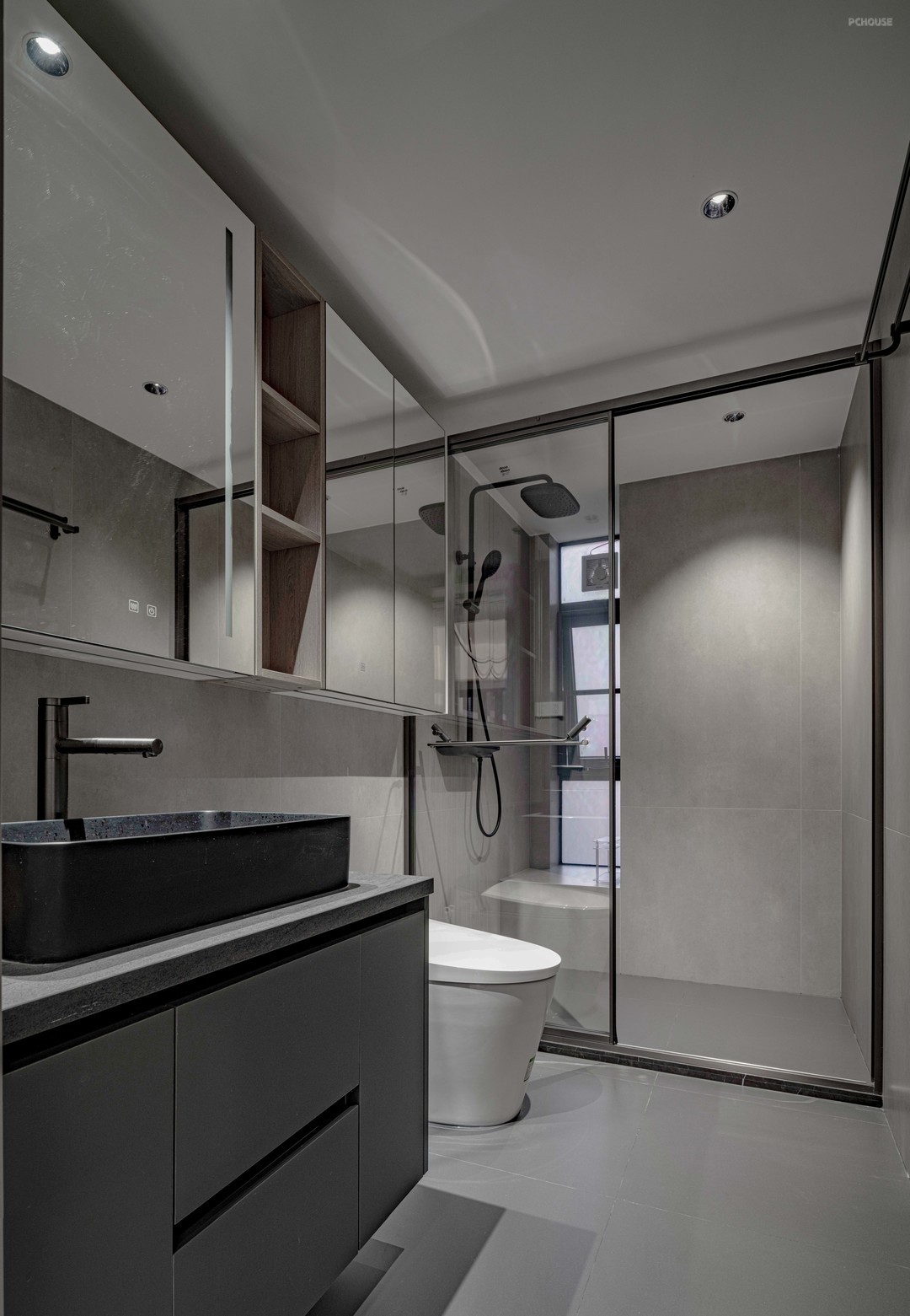 两个洗手间都沿用客厅的灰色配色,柜体,地面砖,墙面砖,三种不同的灰色将灰调的节奏把控好。