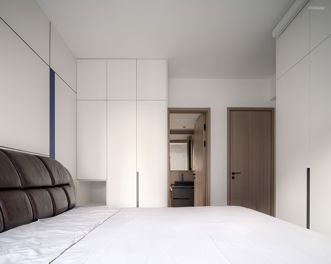 中间开放柜部分,延伸床头柜的区域,开阔视野空间的同时也营造轻盈感。