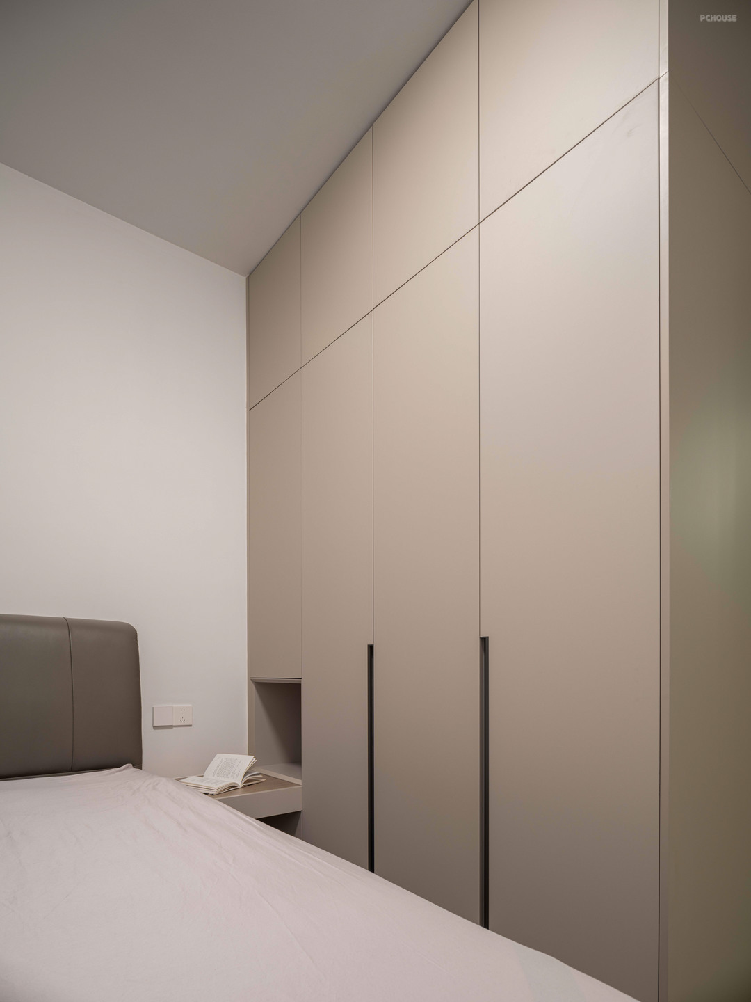 这里还有一个衣柜与床头柜设计的小细节,靠近床头柜最里面的那一部分柜体,因为开门问题并不是很方便拿取,索性与床头柜一体化设计,只保留上柜部分存放衣物。