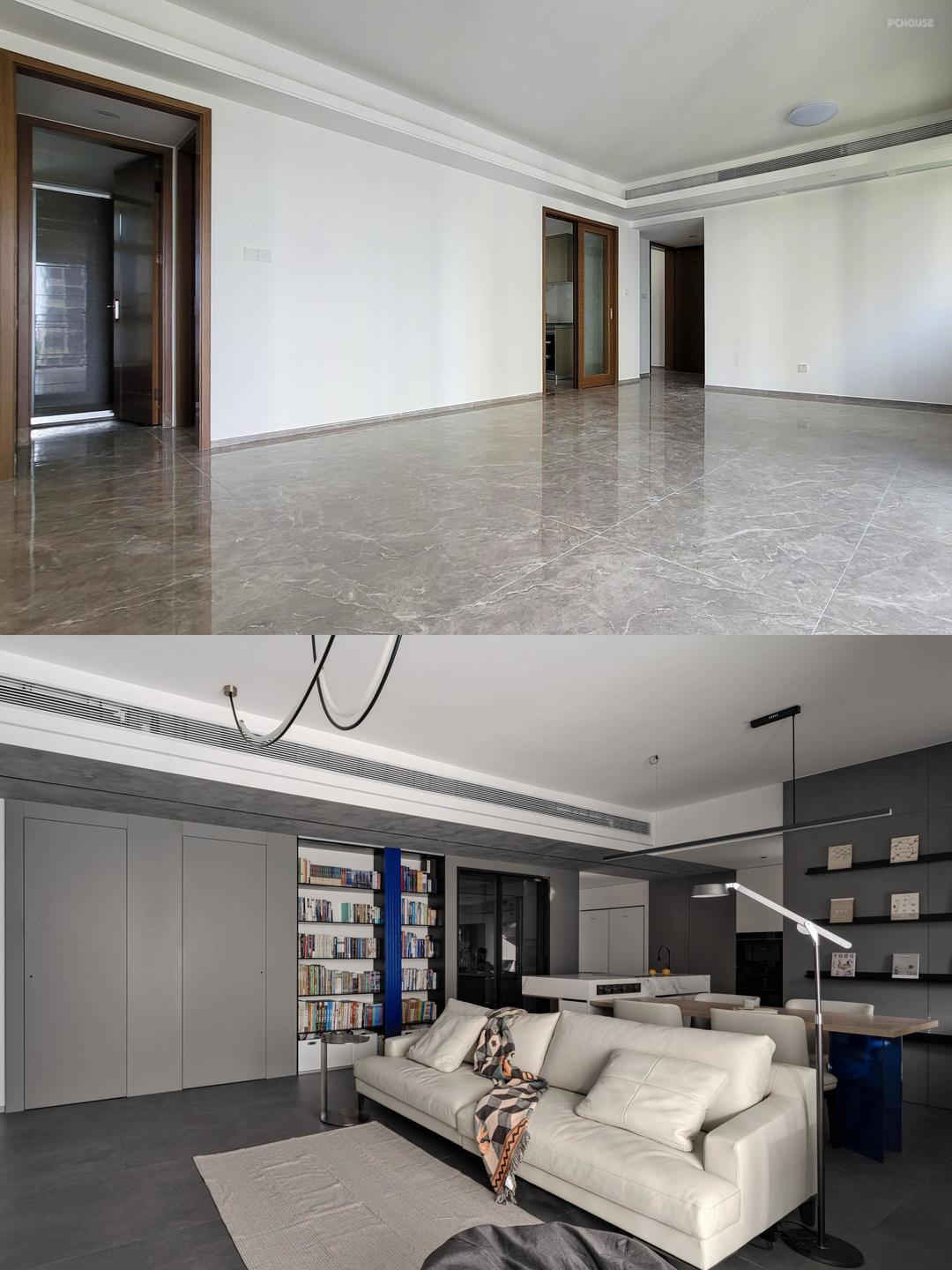 屋主是一对医生夫妇,办公环境里只会看到各种白色空间,所以希望拆除全部精装自带的装修重新改造,回家之后可以在灰调空间下感受到静谧纯净的休闲的氛围。带着这份不寻常的需求找到我来进行设计,我也提出了“灰与蓝”的配色理念~